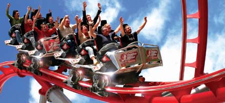 Brave 'Europe's first 360-degree rollercoaster', in the shape of Revolution. Fusion features five incredible loops plus a double line twist on a suspended looping coaster. For something a little more sedate, watch the fountains dance from the comfort of the onsite restaurant.