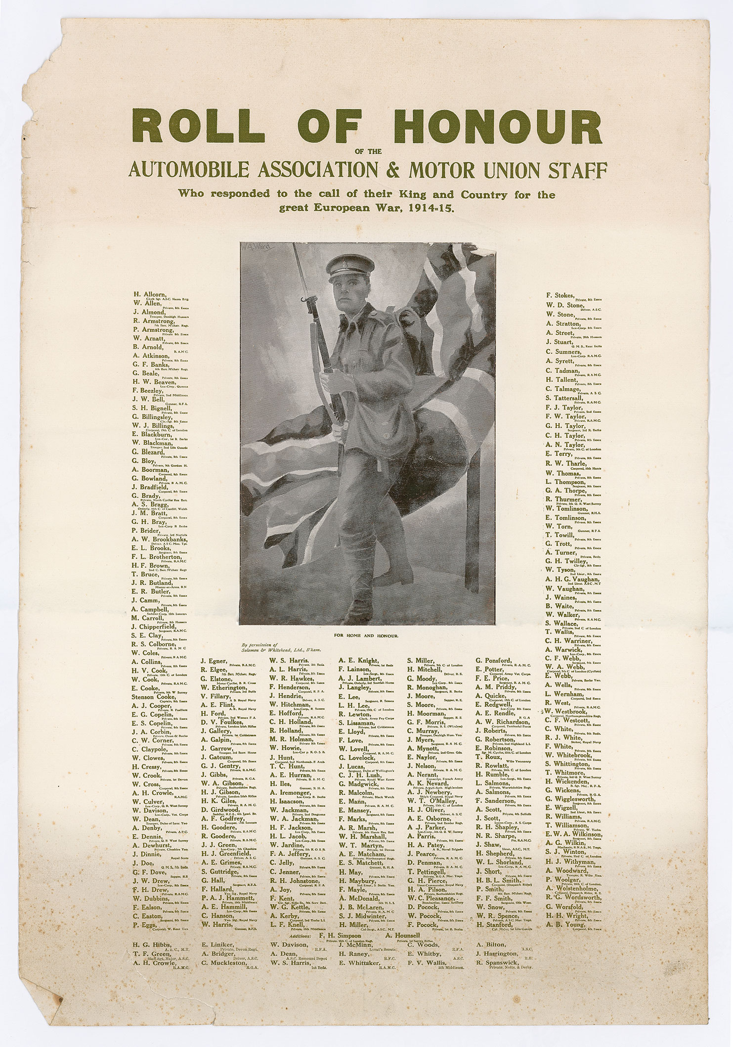 The First World WarThe AA's relationship with the military can be traced back to its formation in 1905. Founding secretary, Stenson Cooke, had been a Lieutenant of the 1st London Rifle Volunteer Brigade and, for many years, most of the AA patrols were ex-regular or national service soldiers. During the First World War, AA members were called upon to donate their vehicles to carry the wounded. Many vehicles were re-fitted with ambulance bodies before being shipped to France to be used on the Western Front. AA Patrols of military age were also encouraged to enlist into the army. Many Patrols were former soldiers, and so returned to their respective regiments. 8th (Cyclist) Battalion of the Essex Regiment Recognising the special training that the AA Patrols had received, Stenson Cooke sought to have them transferred to the Army as one group. The War Office gave authority to raise two companies for the 8th (Cyclist) Battalion of the Essex Regiment (Headquartered in Colchester). Stenson Cooke was given the commission as Captain of one of the Companies. In all 110 men joined the Battalion, with a further 340 AA employees joining other regiments. Most of the men saw service on the Western Front, with at least 20 being killed in action. A Roll of Honour was produced by the AA in 1915 in recognition of the bravery of all the Patrols that had volunteered and (re-)enlisted into the army. An original Roll of Honour was donated to the AA by Mrs Violet Eleanor Race, the daughter of Chief Inspector (James) Henry Shepherd, who enlisted with the 8th (Cyclist) Battalion of the Essex Regiment. |