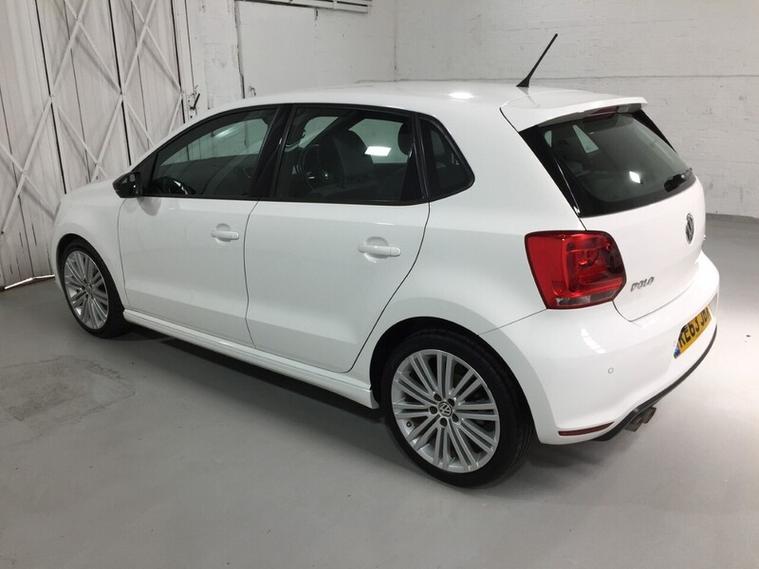 This Volkswagen Polo BlueGT has the desirable combination of 140 horsepower 1.4 litre BlueMotion petrol engine and 7 speed fully automatic DSG transmission for combined fuel economy of 61 MPG rising to 72 MPG for motorway use. It has an excellent specification including climate control air conditioning, designer cloth, alcantara suede and leather sports interior trim, GT leather steering wheel with F1 style paddleshifters, touch screen multimedia interface with FM radio tuner, CD and DVD player and Satellite Navigation via Wireless Apple Car Play and Android Auto. The car also benefits from automatic Bi-Xenon headlamps, rear Park Distance Control, front and rear electric windows, heated electric power-fold door mirrors, remote central door locking and immobiliser with two full function keys and 17 inch alloy wheels. The rear seats have ISOFIX childseat points, split fold and there is an emergency spare wheel also present. Registration: RE63 JBX.First used December 2013, distance driven 51, 606 miles.