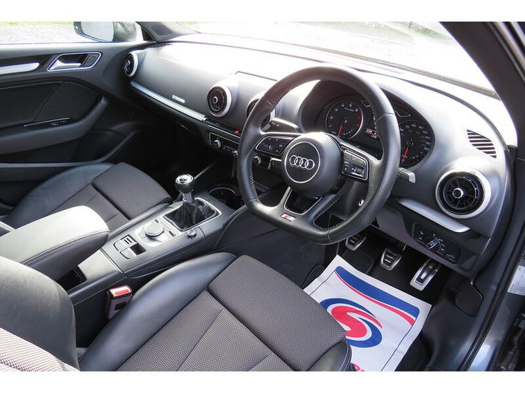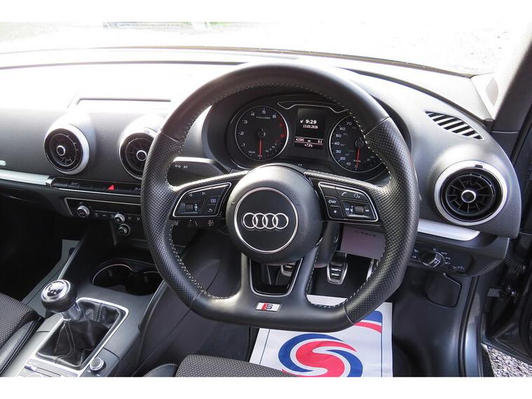 FINANCE AVAILABLE + FREE 12 MONTHS AA BREAKDOWN COVER + COMPREHENSIVE EXTENDABLE WARRANTY AVAILABLE + T&C'S APPLY. A Great Great Specification Audi A3 1.4 TFSi S-Line Black Edition Saloon Manual Finished in Monsoon Grey with Black Half Leather Upholstery Embossed S-Line, Covered 42k Miles from New with Service History. Serviced Audi Main Agent 07/05/2019 @ 9073 Miles, Independent Dealer 21/05/2021 @ 18595 Miles, Audi Main Agent 15/06/2023 @ 32935 Miles, Independent Dealer 25/06/2024 @ 36316 Miles, Independent Dealer 26/01/2026 @ 41982 Miles and Recently Serviced By Ourselves. UK CAR - RECENTLY TAKEN IN PART EXCHANGE. Features Include 18" Audi Alloy Wheels, Climatronic Air Conditioning, MMI Navigation, DAB Tuner, Front and Rear Parking Sensors, Multifunction Steering Wheel, Bluetooth Handsfree Telephone Connection, Automatic Headlamp Control, Front Fog Lights, LED Headlamps, Cruise Control, ISOFIX for Child Seats and Much More. Part Exchange Welcome, Finance Arranged Subject to Status.