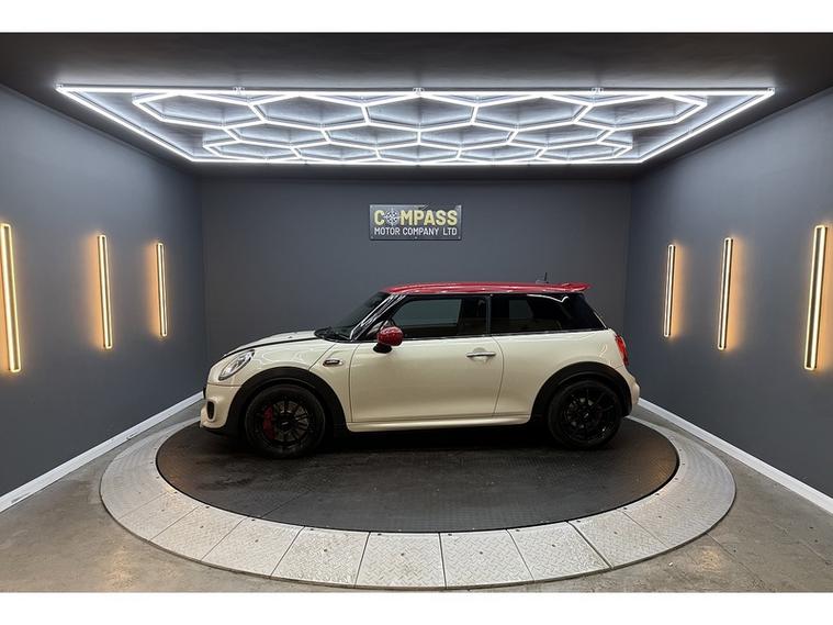 The iconic Mini silhouette is instantly recognisable, here elevated by the aggressive John Cooper Works styling. The crisp white bodywork accentuates every curve and line, highlighting the bespoke aerodynamic body kit, distinct front and rear bumpers, and sculpted side skirts. Gaze upon the striking JCW alloy wheels, hinting at the performance prowess within, while the chrome-tipped twin exhaust pipes at the rear not only look the part but deliver a symphony of engine notes. The signature contrasting roof and wing mirrors complete the race-inspired aesthetic, ensuring this Mini stands out from the crowd wherever it ventures.