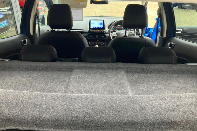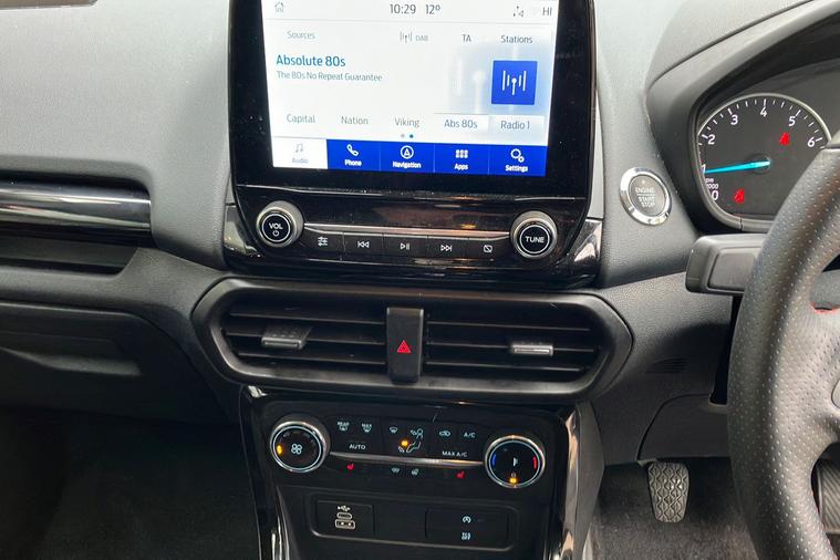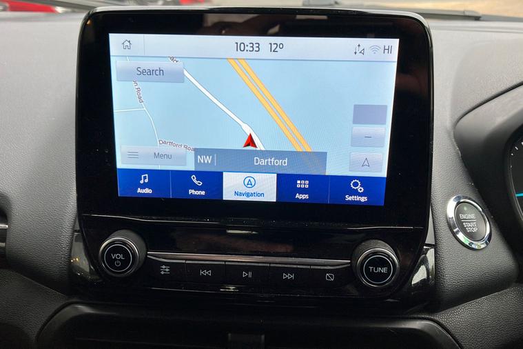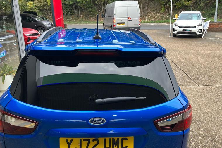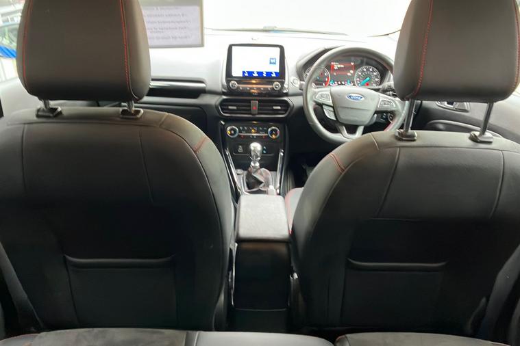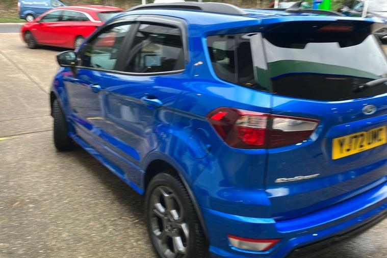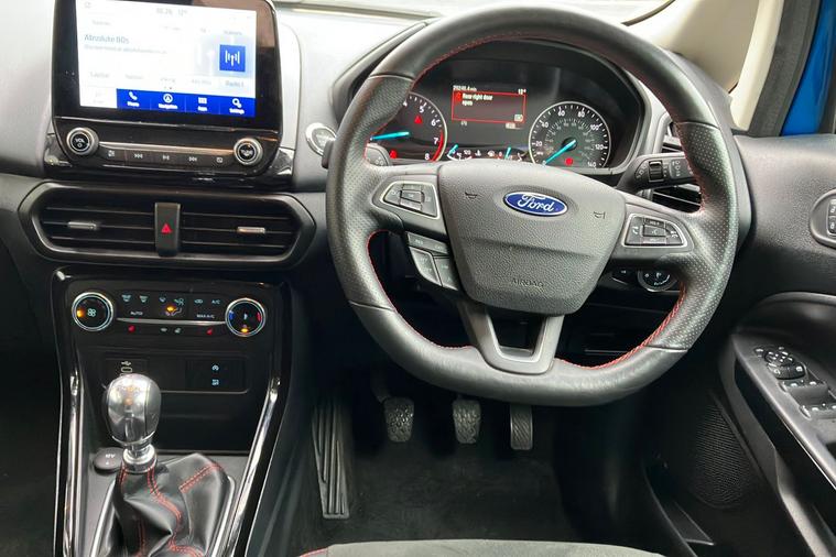 Presented in striking Desert Island Blue, this used 2022 Ford EcoSport ST-Line SUV brings together style and practicality in a distinctive package. Powered by a responsive 1.0 litre petrol engine, it delivers 123 horsepower and can reach up to 111 mph. With five doors and seating for five, the EcoSport offers ample space for both passengers and luggage, featuring a versatile boot that expands from 356 litres to 1, 238 litres when the seats are folded. This vehicle returns up to 45.6 mpg (combined) for efficient running costs. Highlights include eye-catching 17-inch dark tarnish alloy wheels, ST-Line bodystyling, and features such as a heated front windscreen and Ford SYNC 3 navigation with a large touchscreen. For added comfort, it is equipped with the Winter Pack and Partial Sensico / Neosuede upholstery with red stitching. As a Euro 6 vehicle, it is fully ULEZ compliant.