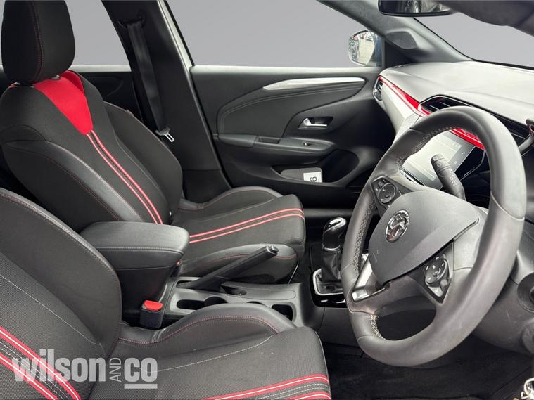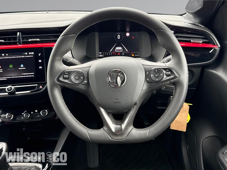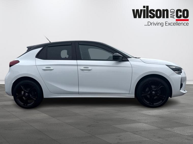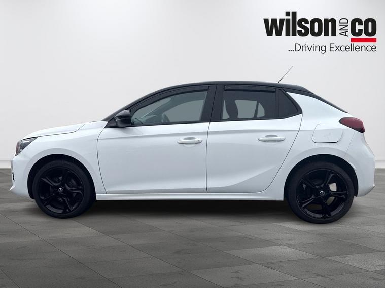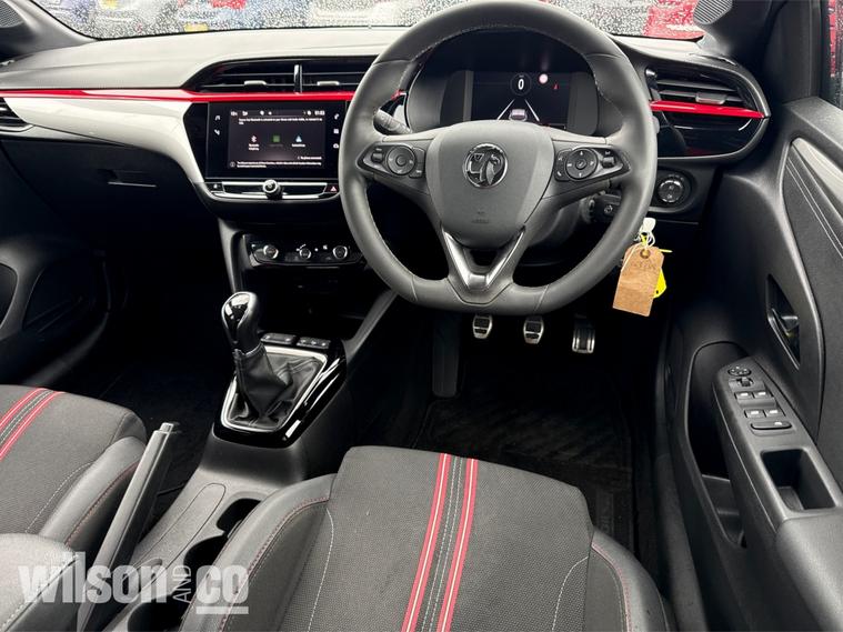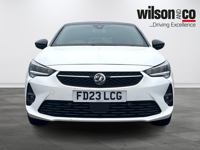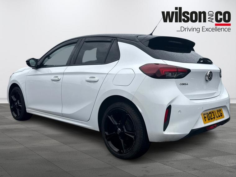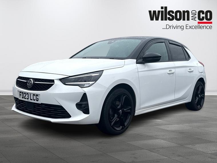 The 2023 Vauxhall Corsa GS is a sporty, well-equipped supermini featuring 17-inch black alloy wheels, a black roof/A-pillars, and a 10-inch touchscreen with Apple CarPlay/Android Auto. It includes sports-style front seats, rear parking sensors, LED headlights, and climate control.