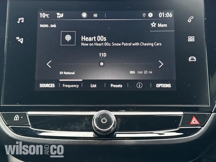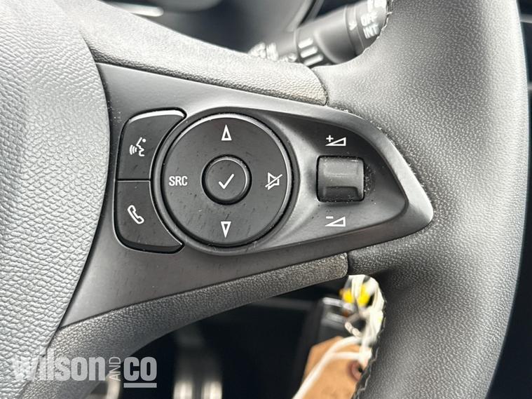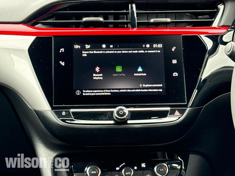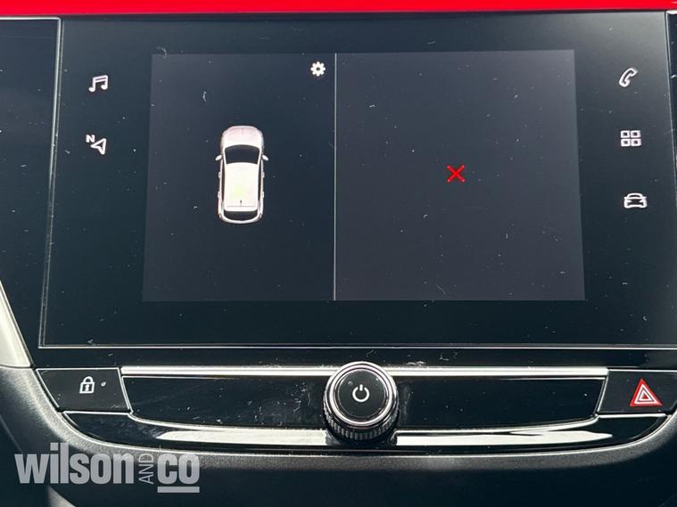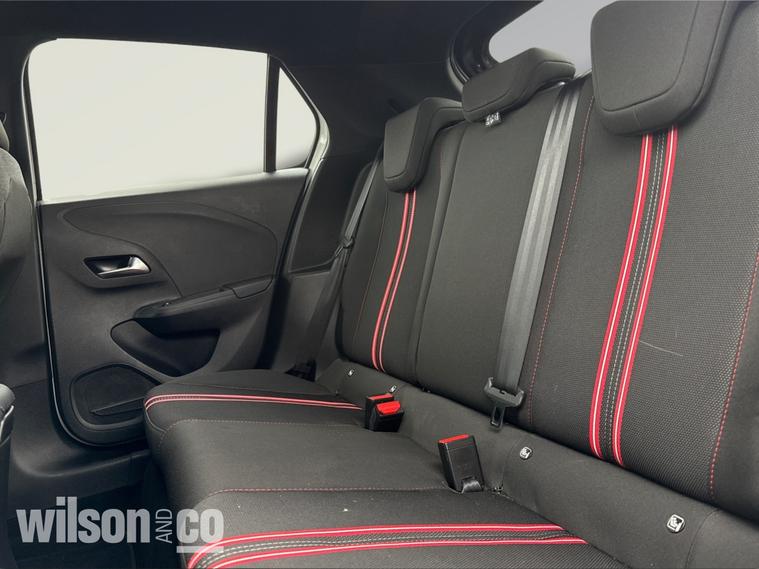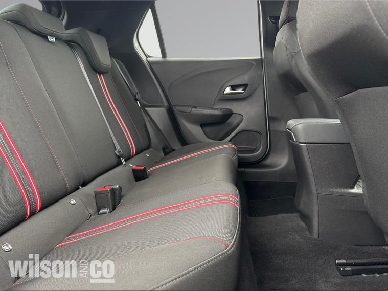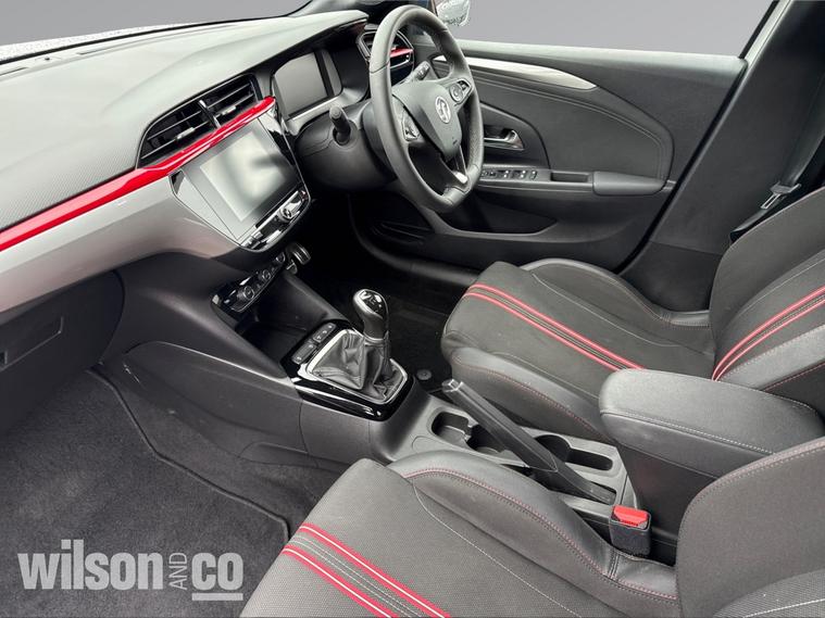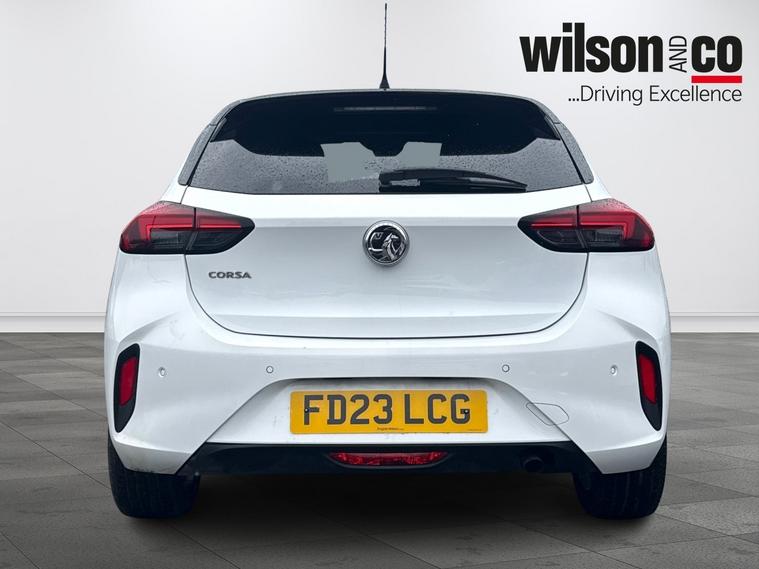 The 2023 Vauxhall Corsa GS is a sporty, well-equipped supermini featuring 17-inch black alloy wheels, a black roof/A-pillars, and a 10-inch touchscreen with Apple CarPlay/Android Auto. It includes sports-style front seats, rear parking sensors, LED headlights, and climate control.