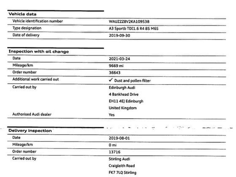 Anchor Cars is proud to present this 2019 Audi A3 1.6 TDI 30 S line Sportback, a refined and stylish premium hatchback that offers an excellent balance of comfort, efficiency and driving enjoyment. Finished in classic black, this five-door A3 benefits from the S line styling, giving it a sharp and confident road presence that reflects Audi’s modern design language. Powered by a 1.6-litre diesel engine producing 116 ps and paired with a manual transmission, this A3 delivers a smooth and composed driving experience. The diesel engine is well suited to both town driving and longer motorway journeys, offering strong fuel efficiency alongside relaxed cruising and responsive performance, all while meeting Euro 6 emissions standards. Inside, the cabin is thoughtfully designed with a clean, driver-focused layout and high-quality materials throughout. The Sportback body style provides practical rear passenger space and a versatile boot, making this A3 an ideal choice for professionals or small families seeking a premium yet practical everyday car. The vehicle comes with a complete mostly Audi Service history: 01/08/2019 - New Vehicle Delivery Inspection - 0 miles - Audi Stirling 24/03/2021 - 10, 000m Service - 9, 669m - Audi Edinburgh 25/10/2021 - 20, 000m Service - 21, 798m - Audi Edinburgh 31/05/2022 - 30, 000m Service - 29, 210m - Audi Edinburgh 20/06/2023 - 40, 000m Service - 39, 255 - Audi Edinburgh 02/04/2025 - 50, 000m Service - 49, 349m - Sation Garage East Boldon LTD 12/02/2026 - Annual Service - 52, 708m - Anchor Cars LTD