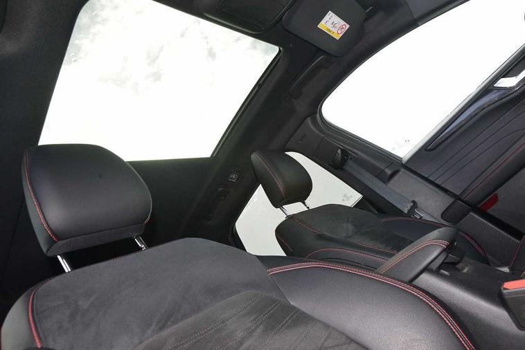 - Partial premium touch sensico leather upholstery with black cloth inserts and red stitching