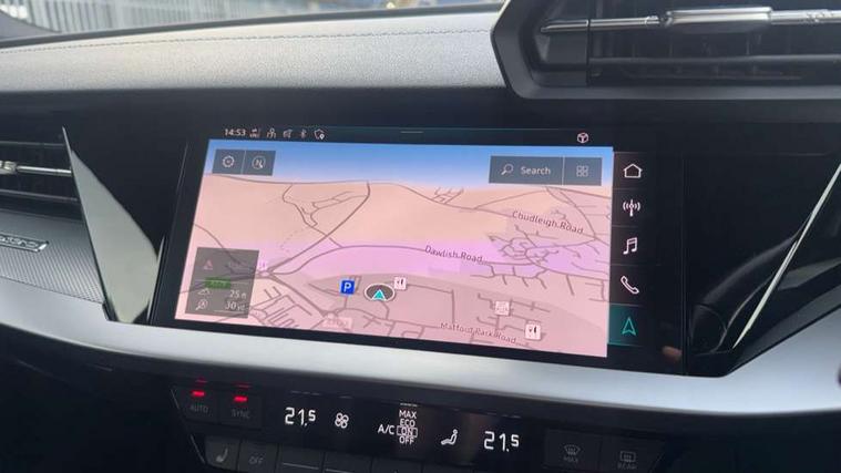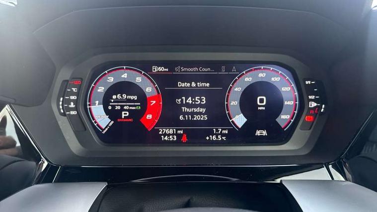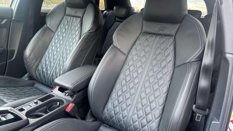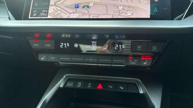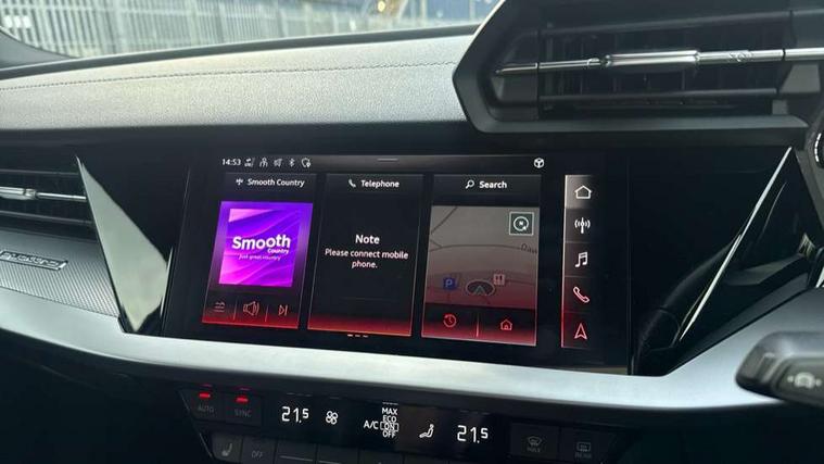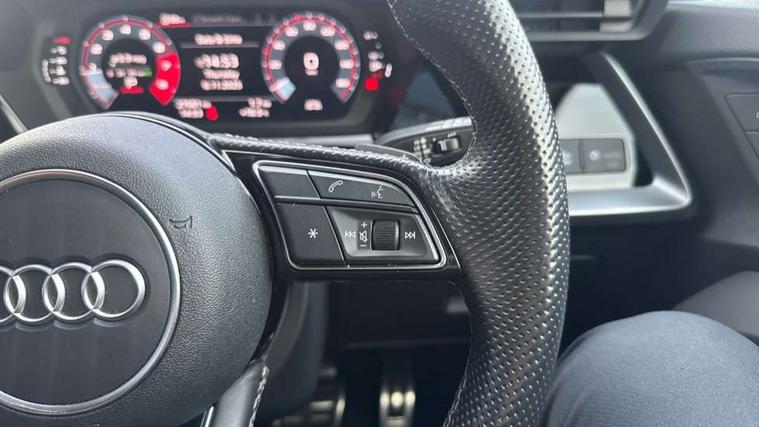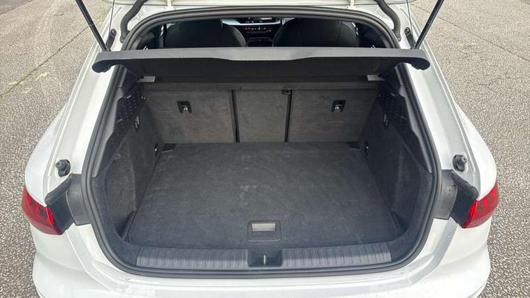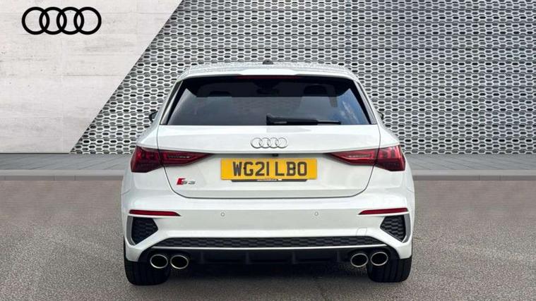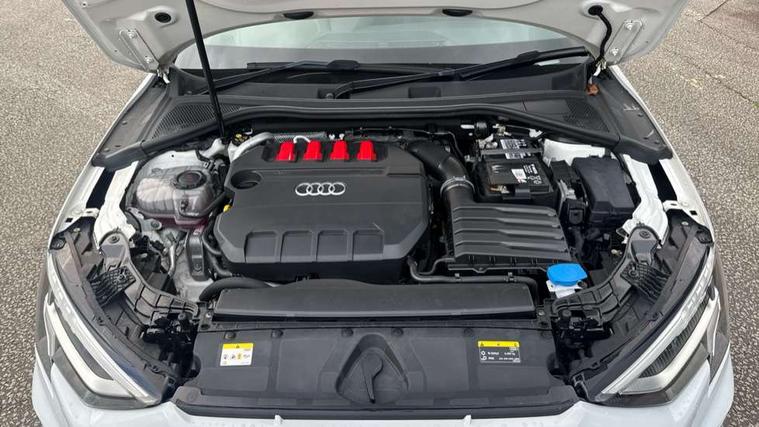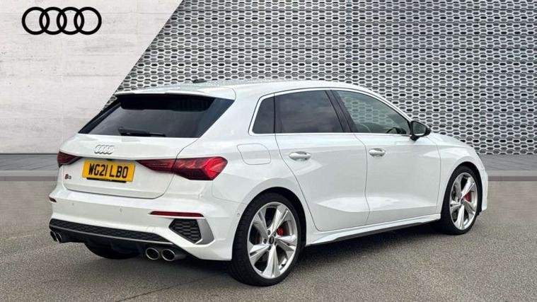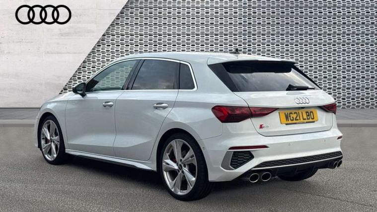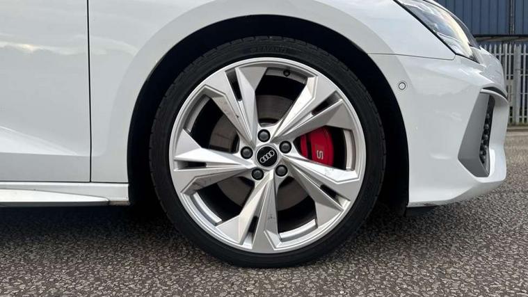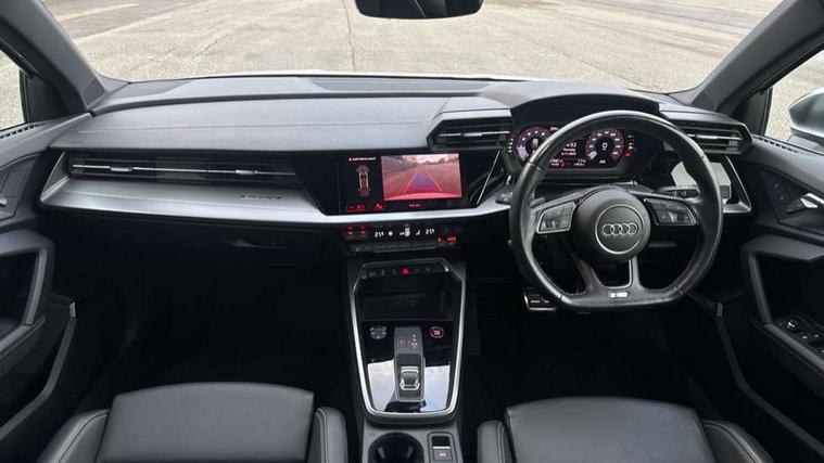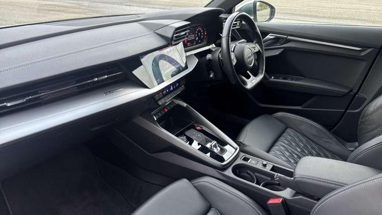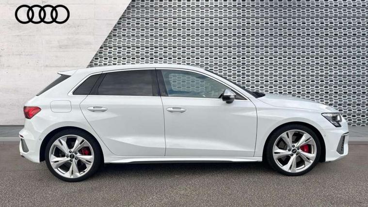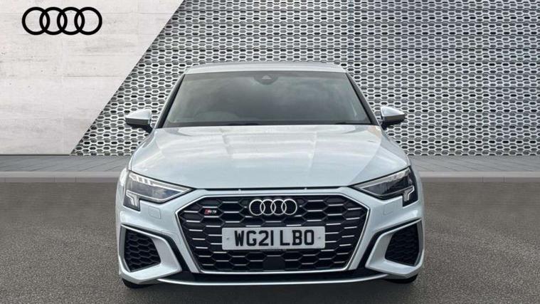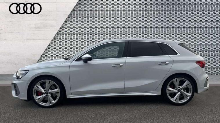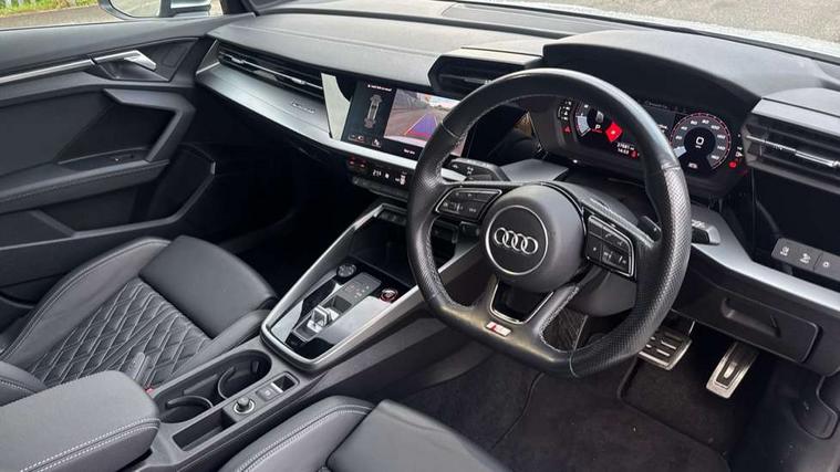 Accent surfaces in the dashboard and centre console in platinum grey silk effect paint finish, Dark spectrum aluminium inlays, Aluminium interior elements pack - A3 Sportback, Design body styling - A3 Sportback, Storage pack - A3 Sportback, 3x3 point rear seat belts, Driver and front passenger airbag with passenger airbag deactivation, Electronic Stabilisation Control (ESC) including ABS, ASR and EDL, First aid kit with warning triangle and 2 safety vests, Front side airbags with head airbags and interaction airbag, Hill hold assist, Pre-sense front with pedestrian and cyclist detection, Seatbelt monitoring, Tyre pressure loss indicator, Anti theft alarm, Anti-theft wheel bolts, Electronically operated child lock, Immobiliser, Remote control central locking, Quattro permanent all wheel drive, S sports suspension, 2xUSB-C connection with data and charging functions, 6 passive loudspeakers, DAB Digital radio, Acoustic glass windscreen, Aluminium window trim, Audi Beam uses LEDs to project the Audi S3 logo, Auto dimming frameless rear view mirror, Dual branch oval twin tailpipes in chrome plated finish, Electrically adjustable/heated/folding/dimming door mirrors with kerb view includes integrated LED indications + kerb view function for passenger side, Front electric windows, Headlight washers, Illuminated aluminium inserts front door sills with S logo, LED daytime running lights, LED headlights with LED rear lights and dynamic rear indicators, Light and rain sensors, Privacy glass - dark tinted rear window, rear door and side windows, Rear electric windows, Rear side air outlets in grained matt black, Rear wiper, 12V socket and storage compartment in front centre console, 40/20/40 split folding rear seat bench with cupholder, Black cloth headlining, Dual zone electronic climate control, Front and rear centre armrest in leather, Front and rear headrests, Front/rear floor mats, Heated front seats, Height and reach adjustable steering wheel, Interior lighting - glove compartment light and right hand side, Luggage compartment floor covering, Manually adjustable front seats, Seat side bolsters, Stainless steel pedals and front footrest, Audi connect emergency call and service, Audi drive select (Auto, Comfort, Dynamic, Efficiency and Individual), Audi smartphone interface, Audi Virtual Cockpit - 10.25" digital and colour instrument cluster, Automatic start/stop system with recuperation, Bluetooth interface, Collision avoidance assistant, Lane departure warning system, MMI Navigation Plus with high resolution 10.1" colour touch screen display, Progressive steering, Service indicator, Trip computer, Voice control system with natural language interaction,