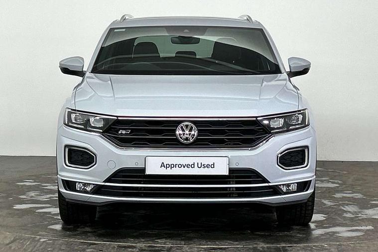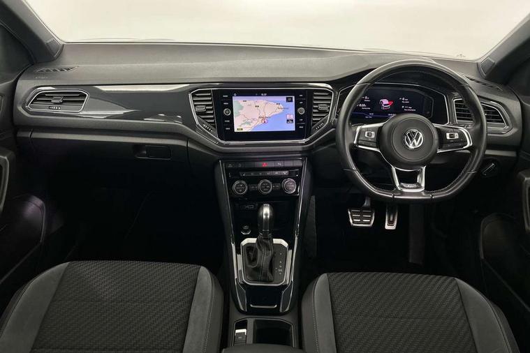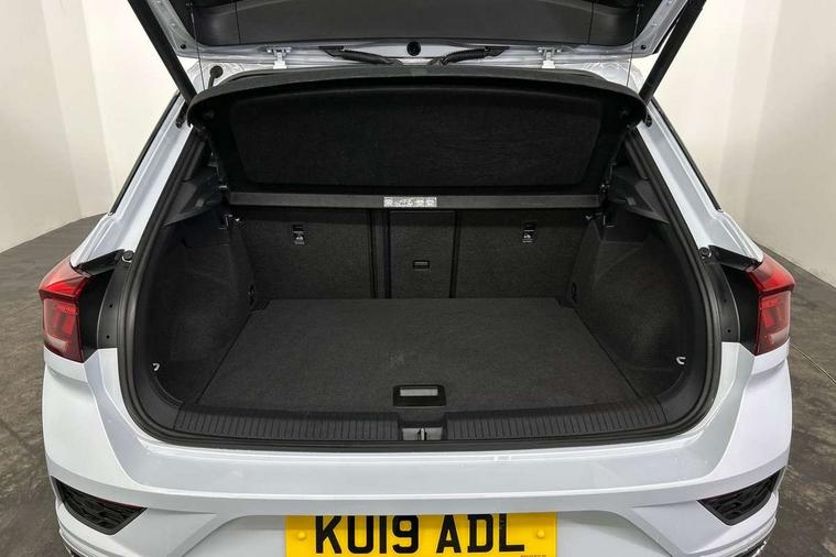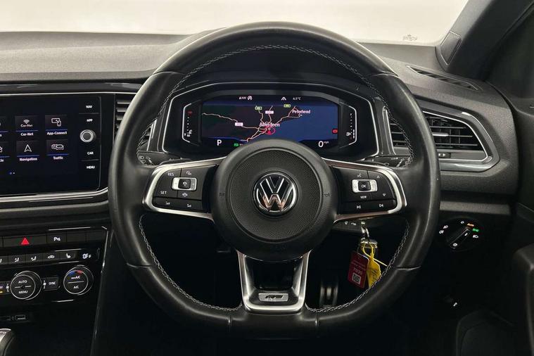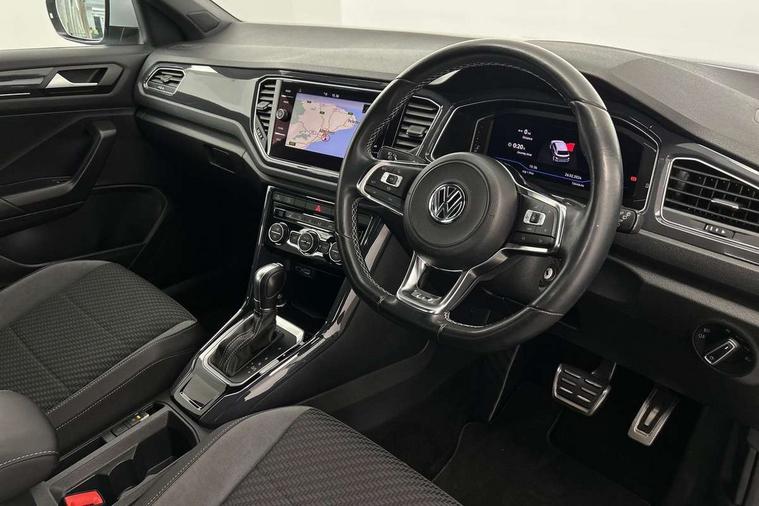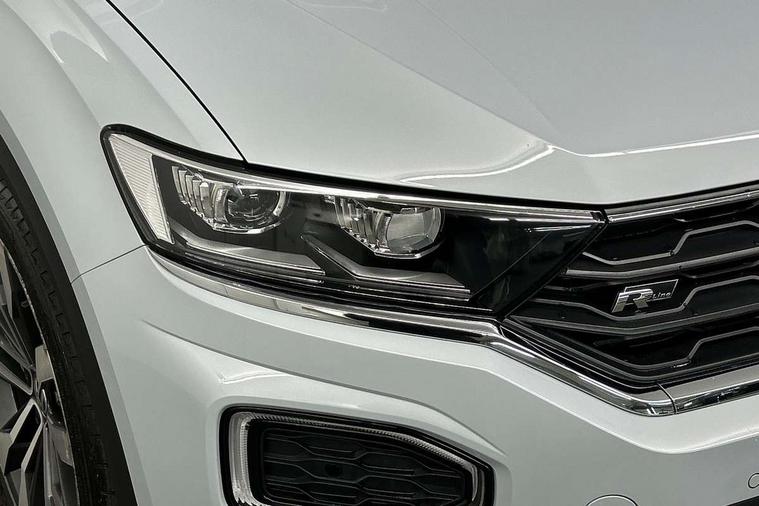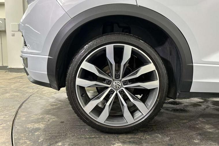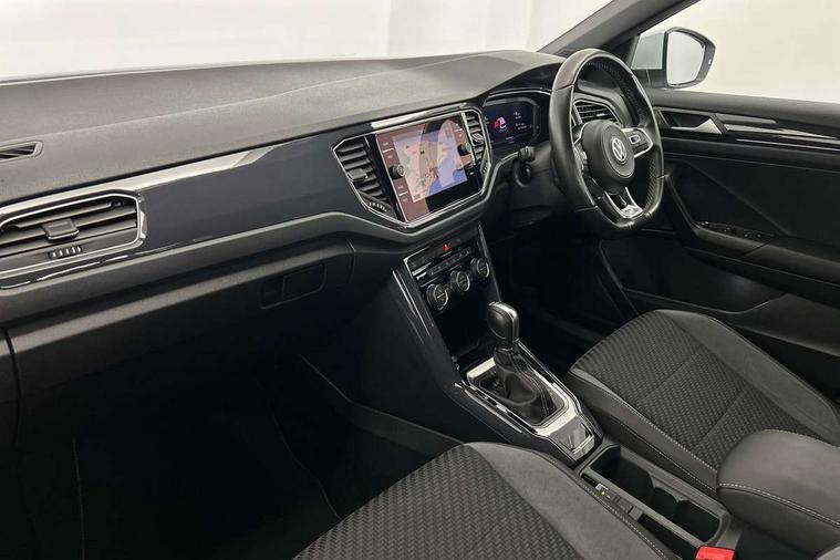 Shadow steel decorative inserts in dash and door panel, R line styling pack - T-Roc, Winter pack - T-Roc, 19" Suzuka alloy wheels with low rolling resistance tyres and anti wheel bolts, Steel space saver spare wheel, Alarm with remote central locking and interior protection, Electronic engine immobiliser, Remote central locking with 2 remote folding keys, Bluetooth - Simultaneous pairing of 2 compatible mobile devices, DAB Digital radio, Dynamic navigation based on TMC+, Multi device interface (MDI) with USB connection, Music playback - MP3, WMA and AAC files, Premium USB cable in choice of either Apple or Android smartphone compatibility, SD card slot, SMS functionality - read, compose and send SMS messages using touch-screen display, Three route options - Fast, Short, Eco, Title and cover art display, 3 rear three point seatbelts, ABS, Driver and front passenger safety-optimised head restraints, Electronic parking brake with auto hold, ESC with EDL, ASR, EDTC and trailer stabilisation function, Front and rear curtain airbags, driver and front passenger airbags with passenger deactivation switch and front side impact airbags, Rigid safety cell with front and rear crumple zones, Three point height adjust front seatbelts + pretensioners, Tyre pressure loss indicator, Ventilated front and rear disc brakes, Volkswagen roadside assistance, Auto dimming interior rear view mirror, Automatic hazard lights activation under emergency braking, Black grained lower door protectors, Black grained wheel arches, Body colour door handles, Body colour rear roof spoiler, Chrome effect left and right trapezoid exhaust tailpipe fascia surround, Chrome trim on upper and lower radiator grille, Door mirror integrated indicators, Electrically foldable, adjustable and heated door mirrors with puddle lights and reverse activated kerb-view adjustment on passenger's door mirror, Front and rear electric windows, Front fog lights with static cornering function, Front windscreen wiper with intermittent wipe and 4 position delay, Fully galvanised body, Heated rear window, High level 3rd brake light, LED darkened rear light clusters, LED rear number plate lights, Manual coming/automatic leaving home lighting function, Rain sensor, Rear tinted glass from B-pillar backwards approx 65% tinted, Rear windscreen washer and wiper with interval delay, 12V socket in centre console storage area, 2 LED front and rear reading lights, 3 rear head restraints, 4 load lashing points in luggage compartment, Aluminium pedals, Ambient lighting in front footwell and light strips below trim in front doors, Black decorative sleeve on gear handles, Black roof lining and sun visors, Carbon flag cloth upholstery, Climate control - 2 zone electronic air conditioning with automatic air recirculation and allergy filter, Drawer under drivers seat, Front + rear carpet mats, Front centre armrest with storage compartment, longitudinal and height adjustable and two rear air vents, Front cupholders x 2, Front footwell illumination, Front seat back storage pockets, Front sport seats, Glovebox, Height adjustable front seats, Height/reach adjust steering wheel, Illuminated vanity mirrors, Instrument lighting, white adjustable panel illumination, Interior light delay, Isofix easy fit child seat preparation for 2 outer rear seats, Load through provision with single cup holder when folded down, Luggage compartment cover, removable, Luggage compartment lighting, R Line badge, Split folding rear seat backrests with centre armrest, Storage compartment in left and right luggage area, Storage compartment in rear doors, Storage compartments in driver and front passenger doors, Three spoke multi function leather trimmed steering wheel and gear knob including paddle shift, Unique R Line door sill protectors, App-Connect, 2 USB connection charging sockets, Active Info Display, 10.3" high resolution TFT dash display screen with customised information, Adaptive cruise control, Automatic start/stop system, Bluetooth telephone and audio connection for compatible devices, Car information display, Car-Net Security and Service, Discover navigation, 8" touch screen navigation/infotainment system with Car-Net, European map, CD/radio, 2D/3D map and speed limiter, Driver alert system with audible and visual fatigue detection system, Driver profile selection, Dusk sensor, Front assist, radar sensor controlled distance monitor, city emergency braking + predictive pedestrian protection, Lane assist, Multifunction computer with visual gear change recommendation for fuel consumption, Progressive power assisted steering, Service interval indicator, Think blue trainer driver tips and journey analysis, Voice activation, Warning sound and light for doors and tailgate open, Warning sound and light for front seatbelts unfastened, Battery regeneration during braking, Misfuel prevention device for diesel engine,