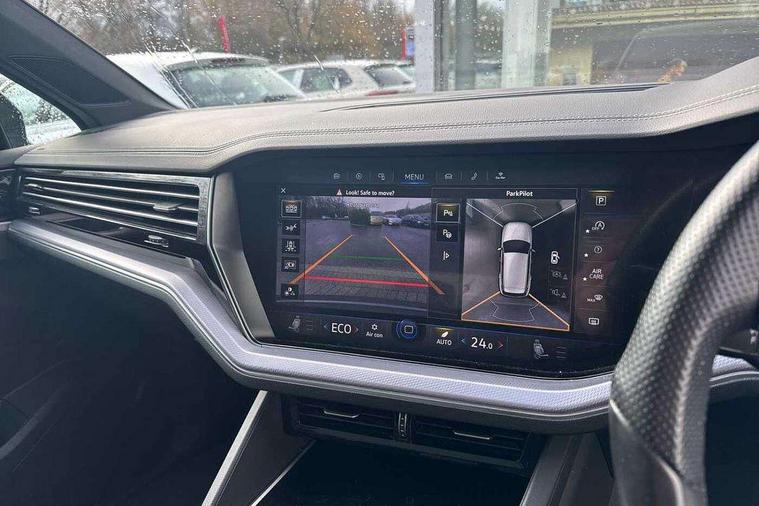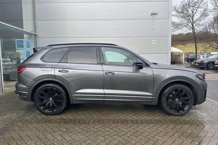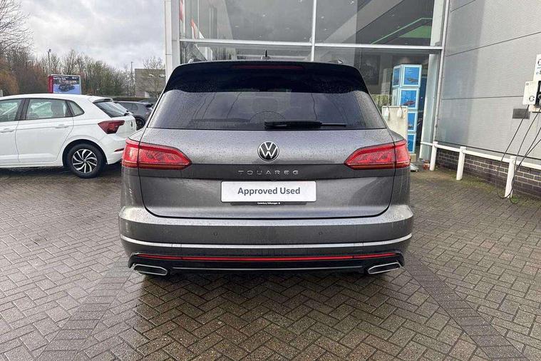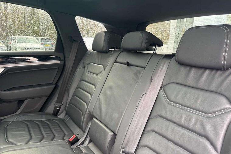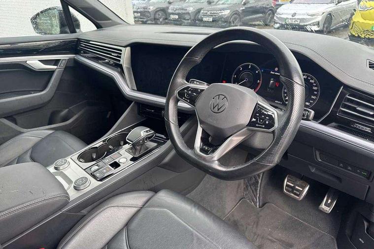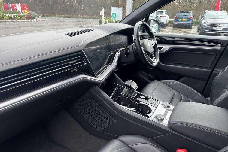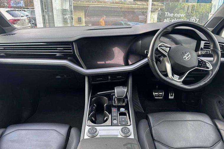 Black decorative trims on the side windows, High gloss black centre console, Innovision cockpit pack - Touareg, R line styling pack - Touareg, Tyre repair kit, Alarm with interior monitoring in cab, backup horn and towing protection, Child security locks for front and rear doors, Electronic engine immobiliser, Remote central locking, DAB Digital radio, Dynamic navigation based on TMC+, Gesture control for infotainment system, Multi device interface (MDI) with illuminated USB-C connection, Music playback - MP3, WMA and AAC files, SD card slot, Simultaneous pairing of 2 compatible mobile devices, SMS functionality - read, compose and send SMS messages using touch-screen display, Title and cover art display, Volkswagen media control, 3 point front seatbelts with pre-tensioners, ABS, Active bonnet, Automatic post collision braking system, Curtain airbags, Driver/Front Passenger airbags, EBD + Brake Assist, EDL, Electronic parking brake with auto hold, ESC with ASR, Front seat side impact airbags, Hill descent control, Hill start assist, Passenger airbag deactivate switch, Seatbelt warning lamp and buzzer, Three 3 point rear seatbelts, Two tone horn, Volkswagen roadside assistance, Warning triangle and first aid kit, Adaptive low beam for urban and motorway use, Auto dimming rear view mirror, Automatic coming/leaving home lighting function, Automatic headlights, Black anodised roof rails, Black door mirrors, Black rear diffuser, Black side window surrounds, Black upper and lower grille louvres extending into headlights and radiator grille, Body colour door handles, Body coloured wheel arches, C signature gloss black front air intake, Chromed tailpipe on the left and right integrated in the bumper with trapezoid design, Dynamic headlight range control, Electric front tilt/slide panoramic sunroof and fixed rear sunroof, Electrically power adjustable, heated, folding, auto dimming, front passenger exterior door mirror lowering function, Front and rear electric windows, Galvanised body, Gloss black finish B pillar, Gloss black rear diffuser, Headlight washers, Heat insulating glass in side and rear windows, Heated windscreen washer jets, IQ.Light-LED matrix headlight, daytime running light with dynamic cornering light and indicator, LED rear fog light, LED rear number plate lights, Plastic scuff plates in door apertures, Poor weather light, Puddle lights, Rain sensor, Rear wiper, 12V socket in front and rear centre console and boot, 2 Coat hooks on B pillar, 3 rear head restraints, 3 spoke sport heated leather multi-function sports steering wheel with gear shift paddles - generation 2, 4 way adjustable front head restraints, 4 way electric lumbar support for driver and front passenger, 4 zone climate control, 40:20:40 split folding slide/recline rear seat, B pillar vents, Black lower edge of door extending sills, Branded points of interest, Double sun visor for drivier and passenger with LED illuminated vanity mirrors, Electric luggage compartment cover, Folding rear centre armrest with 2 cupholders, Front + rear carpet mats, Front centre armrest with storage box, Gear shift indicator, Height/reach adjust steering wheel, Illuminated air conditioned glovebox, Isofix preparation for 2 rear child seats, Jack and tool kit, Leather trimmed gear knob with gloss black inlay/aluminum trim, Leatherette door trim, LED luggage compartment lighting, Load through provision, Luggage compartment with load lashing rings, Plastic loading edge protection, Rear seat remote release levers, Soul black headlining, Stainless steel pedals, 2D/3D map view, ACC - Adaptive cruise control with front assist, forward collision warning, distance monitoring, city emergency brake and speed limiter, Apple car play/Android Auto, Audible and visual fatigue detection system, Bluetooth hands free telephone connection, Car information display, Drive select with Damper control, Driver alert system, Dusk sensor, Dynamic road sign display camera controlled system with visual warning for traffic and road signs, eCall emergency system, Fully electric tailgate + keyless entry and start, Instrument cluster, MirrorLink, Multifunction camera with lane assist, Multifunction computer premium with 7" colour display, One touch indicators with repeat function, Park assist with area view camera, Service interval indicator, Speed sensitive power steering, Start/stop system with regenerative braking, Tailgate power latch, Think blue trainer driver tips and journey analysis, Traffic sign recognition, Voice control system, Wireless Smartphone charger, Torsen limited slip differential,