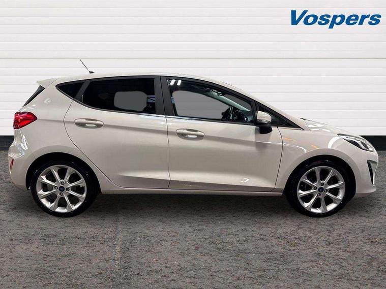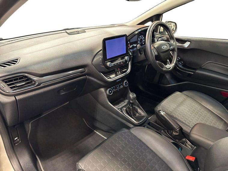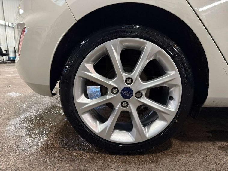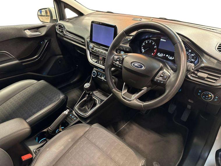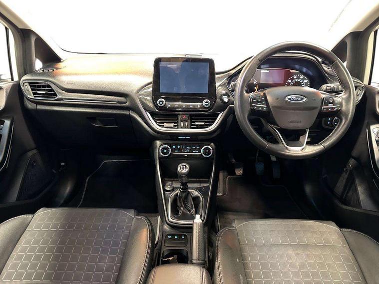 NCAP Pack - Fiesta, 17" 8 spoke alloy wheels, Ford keyfree system with Keyless entry and keyless start, MyKey system, Remote central locking & engine immobiliser, Thatcham Cat.1 alarm, 2 USB ports, Auxiliary input socket, B&O Premium audio system with 8" touchscreen, 10 speakers, 360 degree sound system, Ford SYNC 3 navigation system and Ford pass connect, DAB Digital radio, Steering wheel mounted controls, 3 point seatbelts on all rear seats, ABS+EBA, Curtain airbags, Driver and passenger airbags, Drivers knee airbag, Electronic stability control with hill start assist, Front passenger airbag deactivation, Front side airbags, Seatbelt warning, Two tone horn, Tyre pressure monitoring system, Auto high beam, Body colour bumpers, Body colour door handles, Body colour rear spoiler, Body coloured electrically operated and heated door mirrors with side indicators, Chrome beltline trim, Chrome front grille, Chrome lower window surround, Cornering front fog lights, Electric front windows/one touch facility, Electric rear windows, LED Night signature to rear lights, Power foldable door mirrors with puddle lights, Quickclear heated windscreen, Rain sensing wipers and auto dimming rear view mirror, Rear privacy glass, Rear wiper, 3 spoke leather trimmed steering wheel with audio control, 60/40 split folding rear seat, Adjustable head restraints, Boot carpet, Centre console with opening armrest, 2x cupholders, 12v and USB, Chrome inner door handles, Drivers and Passenger lumbar support, EATC - Electronic Auto Temperature control, Footwell illumination, Front floor mats in velour, Front map reading lights, Front seat and rear pockets, Height adjustable passenger seat, Illuminated glovebox, Leather gaiter, LED ambient lighting, Load area light, Luxury woven headliner, Manual 4-way driver seat adjust, Overhead console with sunglasses holder, Pollen filter, Rake/reach adjustable steering wheel, Sensico partial premium upholstery, Sensico wrapped steering wheel, 4.2" TFT instrument cluster screen, Bluetooth system, Electric power steering, Ford easy fuel, Rear parking distance sensors, Selectable drive modes (Normal, Sport, Track), Traffic sign recognition, Trip computer,