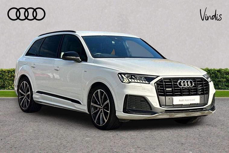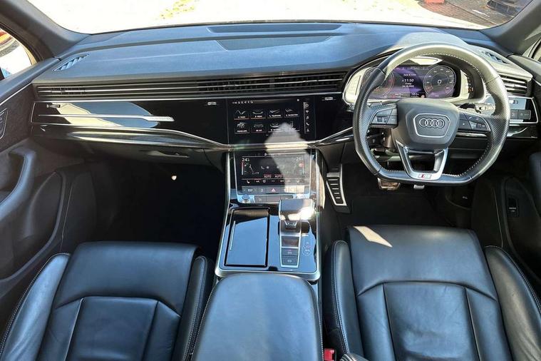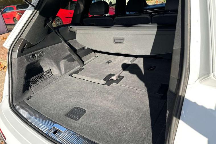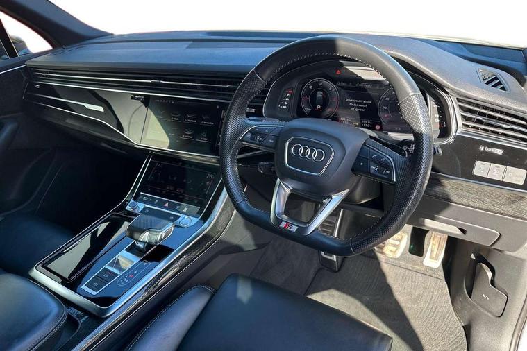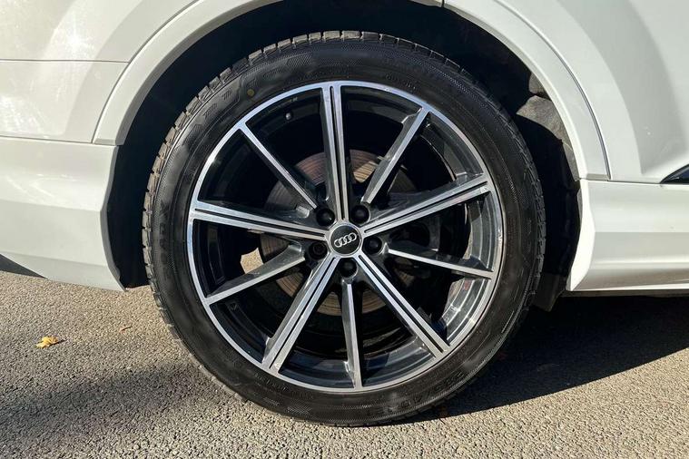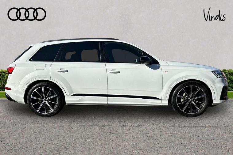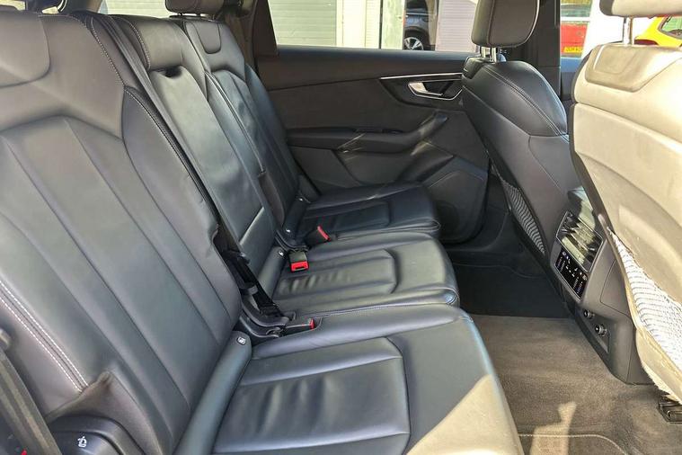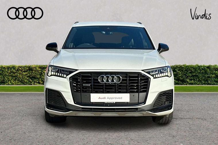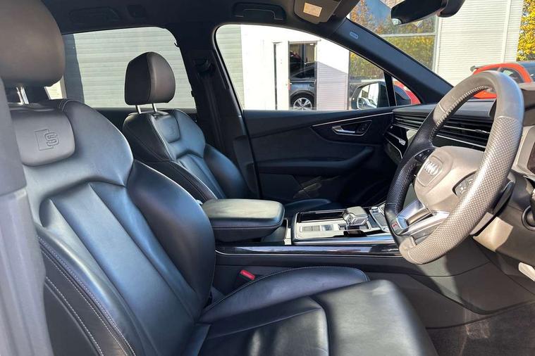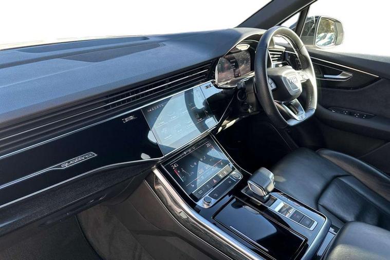 Polished oak trim with grey finished, Titanium black styling pack - Q7/SQ7, Tyre repair kit, Anti theft alarm, Anti-theft wheel bolts and wheel loosening detection, Keyless go with remote central locking, Audi music interface - front 2 USB-C ports with charger and data functions, Audi sound system with 6 channel amplifier, 180 watt amplifying capacity and 10 loudspeakers including subwoofer, DAB digital radio module, 3 point seatbelts on all rear seats, Audi pre sense front, Driver and front passenger, front side and curtain airbags, Electromechanical parking brake, Electronic Stabilisation Control (ESC) including ABS, ASR and EDL, Extended pedestrian protection measures, Hill hold assist, Seatbelt monitoring, Tyre pressure loss indicator, Warning triangle and first aid kit, Audi matrix LED headlights with dynamic front and rear indicators, Auto dimming frameless rear view mirror, Black roof rails, Bumpers in contrast paint scandium grey finish includes door trim and wheel arch trim strips, inlays in door strip contain quattro embossing, Electrically adj heated/folding + automatically dimming exterior mirrors with memory + automatic kerb side function for passenger side exterior mirror, Heat insulating glass in windshield, LED daytime running lights, LED rear tail lights, Privacy glass - dark tinted rear and rear side windows from B-pillar backwards, 3 spoke flat bottomed high multi-function leather sport steering wheel with gearshift paddles, 4 zone deluxe automatic climate control, 7 seat layout with ISOFIX points for the front passenger seat and rear passenger seat, Comfort front centre armrest, Folding rear seats, Front head restraints, Front/rear floor mats, Heated front seats, LED interior ambient lighting, Luggage compartment cover, Luggage compartment sill protection in stainless steel, Rear head restraints, Stainless steel pedals, Tool kit, Audi connect safety and service (e-call), Audi drive select (Auto, Comfort, Dynamic, Efficiency, Individual, Off-road and All road), Audi phone box with wireless charging, Audi smartphone interface includes wireless Apple carplay/Android Auto, Camera based traffic sign recognition, Electromechanical steering, MMI navigation plus with MMI touch screens includes 10.1" and 8.6" screens with haptic feedback, Natural voice recognition, Parking system plus - front + rear sensors, PAS, Power operated tailgate, Rear view camera, Start/stop system, 48V Mild hybrid technology, Adaptive air sports suspension, Quattro all wheel drive with self locking centre differential,