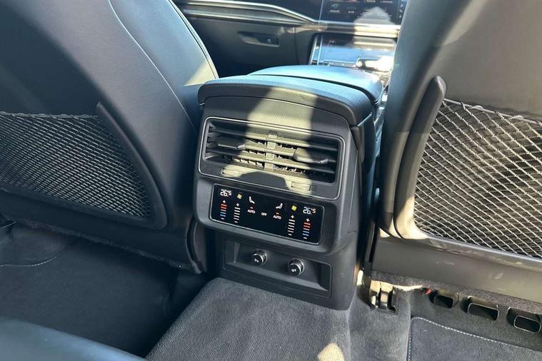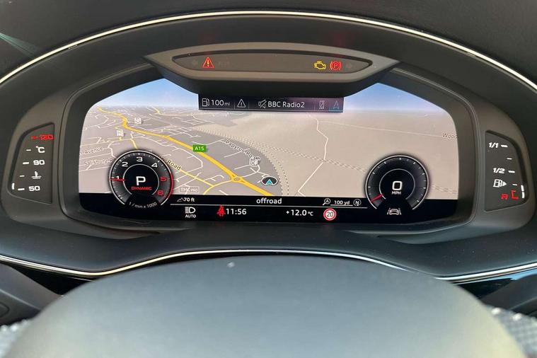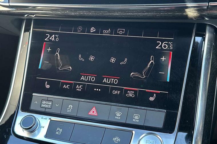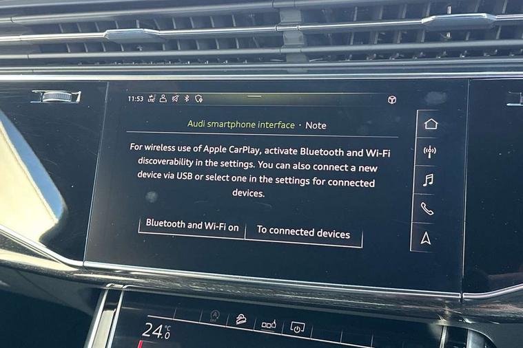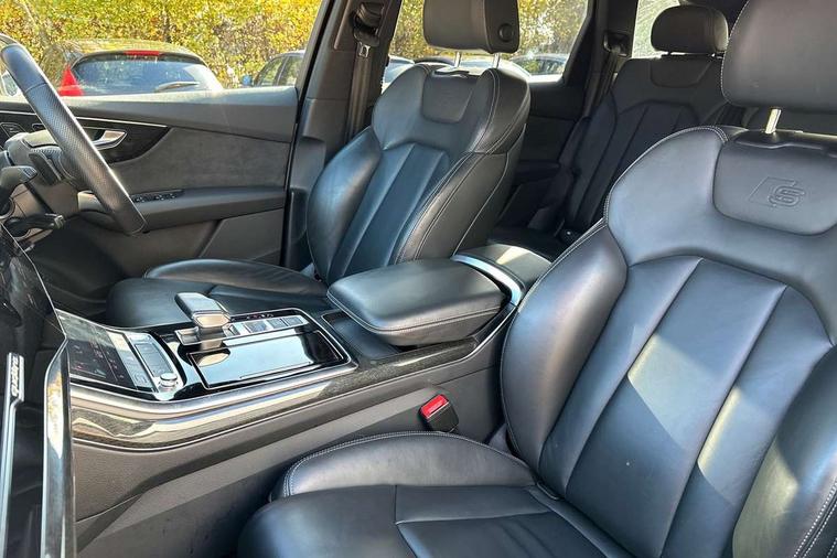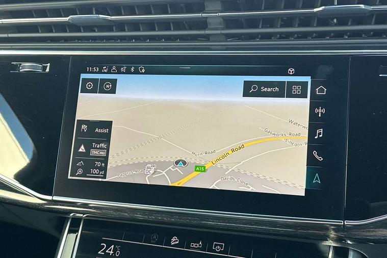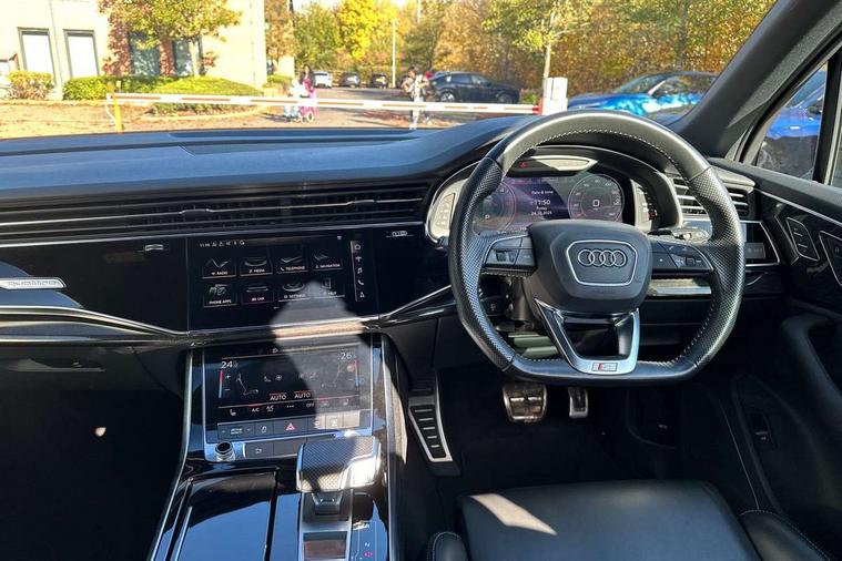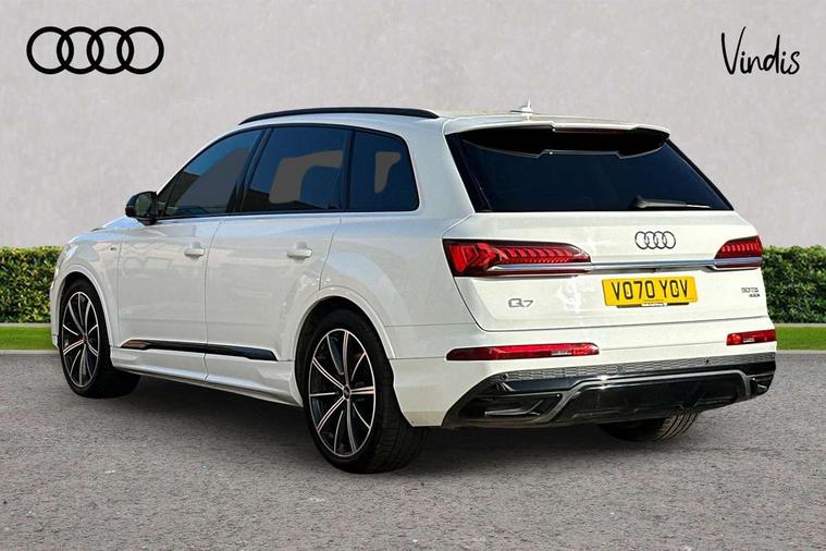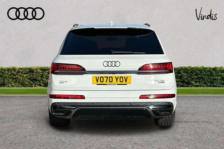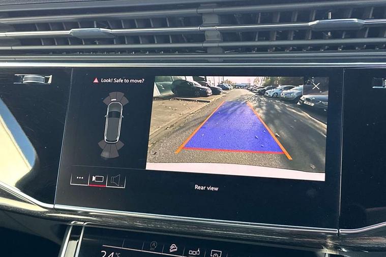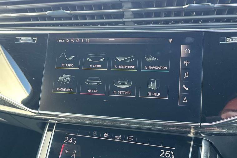 Polished oak trim with grey finished, Titanium black styling pack - Q7/SQ7, Tyre repair kit, Anti theft alarm, Anti-theft wheel bolts and wheel loosening detection, Keyless go with remote central locking, Audi music interface - front 2 USB-C ports with charger and data functions, Audi sound system with 6 channel amplifier, 180 watt amplifying capacity and 10 loudspeakers including subwoofer, DAB digital radio module, 3 point seatbelts on all rear seats, Audi pre sense front, Driver and front passenger, front side and curtain airbags, Electromechanical parking brake, Electronic Stabilisation Control (ESC) including ABS, ASR and EDL, Extended pedestrian protection measures, Hill hold assist, Seatbelt monitoring, Tyre pressure loss indicator, Warning triangle and first aid kit, Audi matrix LED headlights with dynamic front and rear indicators, Auto dimming frameless rear view mirror, Black roof rails, Bumpers in contrast paint scandium grey finish includes door trim and wheel arch trim strips, inlays in door strip contain quattro embossing, Electrically adj heated/folding + automatically dimming exterior mirrors with memory + automatic kerb side function for passenger side exterior mirror, Heat insulating glass in windshield, LED daytime running lights, LED rear tail lights, Privacy glass - dark tinted rear and rear side windows from B-pillar backwards, 3 spoke flat bottomed high multi-function leather sport steering wheel with gearshift paddles, 4 zone deluxe automatic climate control, 7 seat layout with ISOFIX points for the front passenger seat and rear passenger seat, Comfort front centre armrest, Folding rear seats, Front head restraints, Front/rear floor mats, Heated front seats, LED interior ambient lighting, Luggage compartment cover, Luggage compartment sill protection in stainless steel, Rear head restraints, Stainless steel pedals, Tool kit, Audi connect safety and service (e-call), Audi drive select (Auto, Comfort, Dynamic, Efficiency, Individual, Off-road and All road), Audi phone box with wireless charging, Audi smartphone interface includes wireless Apple carplay/Android Auto, Camera based traffic sign recognition, Electromechanical steering, MMI navigation plus with MMI touch screens includes 10.1" and 8.6" screens with haptic feedback, Natural voice recognition, Parking system plus - front + rear sensors, PAS, Power operated tailgate, Rear view camera, Start/stop system, 48V Mild hybrid technology, Adaptive air sports suspension, Quattro all wheel drive with self locking centre differential,