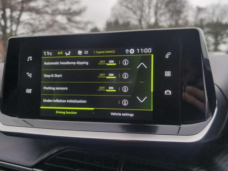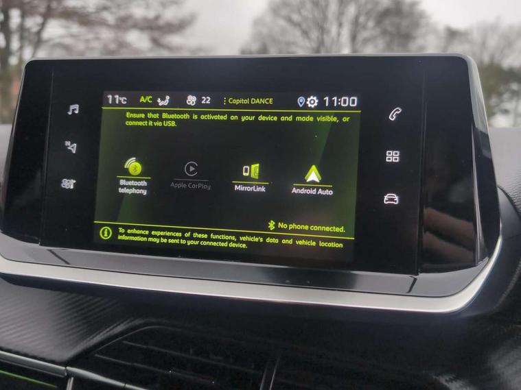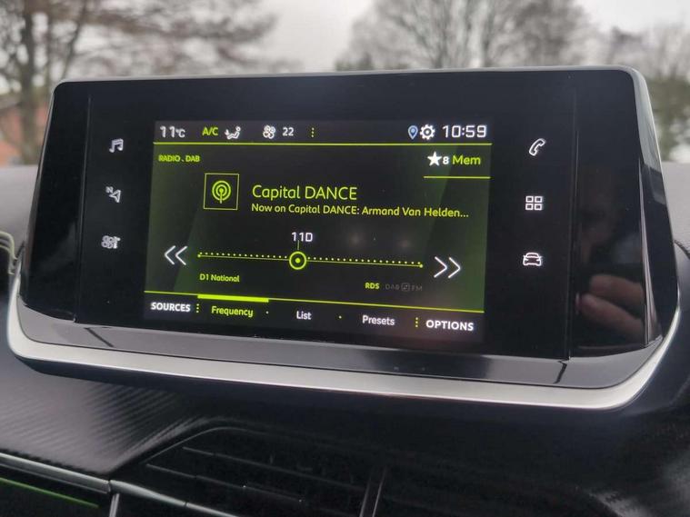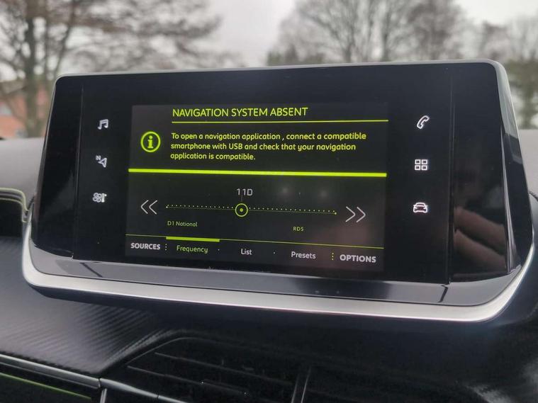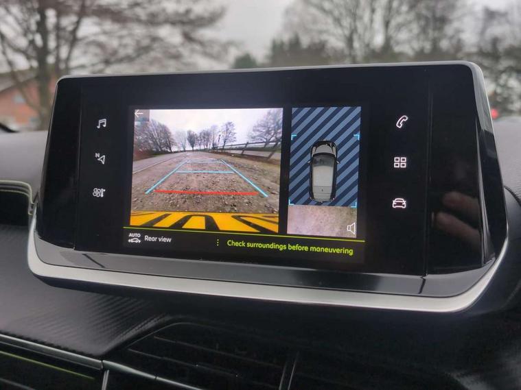 Carbon effect Dashboard, front and rear door panel finish, 17" Camden diamond cut two tone alloy wheels, Space saver spare wheel, Automatic door locking when moving off, Automatic hazard light activation upon heavy brake application, Deadlock, Electronic code immobiliser, Thatcham Cat.1 alarm, 2 front USB socket with USB-C, 2x USB sockets in rear, 6 speakers radio with mp3 compatible, DAB Digital radio, Voice recognition for radio, navigation and telephony features, 2x 2nd row ISOFIX child seat mountings, 3 rear 3 point seatbelts, ABS (Anti-lock Braking System) with EBD (Electronic Braking Distribution) and EBA (Emergency Braking Assistance), Active safety brake with night function/cyclists/pedestrians, Child locking functionality on rear doors, Driver and passenger airbags with Passenger airbag deactivation system, Driver/front passenger side airbags, Electric parking brake, ESP with Hill Assist, Front and rear curtain airbags, Front and rear disc brakes, Front optimised safety headrests and 3 x rear retractable headrests with height adjustable, Front three point retractable seatbelts with force limiters, Tyre pressure sensor, 2 X Rear number plate lights, Automatic lights, Automatic windscreen wipers, Body coloured exterior door handles, Dark tinted Rear side and tailgate windows, Diamond black rear spoiler, Diamond Black roof, Electric front windows + one touch + anti-pinch, Electric rear windows with one touch/anti-pinch, Electrically adjustable, heated and power folding door mirrors, Follow me home headlights, Frameless electrochrome interior rear view mirror, Front windscreen wiper with magic wash cleaning system, Full LED headlights with smartbeam assist, Gloss black finish on B pillar, Gloss black rear cluster connecting strip, Gloss black wheel arch extensions, Gloss black window surround, GT Line model designation badging on C pillar, GT Line model designation badging on tailgate, Headlights left on audible warning, LED daytime running lights with 3 claw headlight with distinctive tooth design, LED side indicator lights integrated into door mirrors, Model designation badges front and rear, Nera black door mirror shells, Radiator grille - Dark chrome chequered and gloss black edge trim, Rear bumper with gloss black finish, Rear full LED 3D peugeot signature claw effect lights with daylight function, Rear lower bumper diffuser effect trim in gloss black, Rear reversing lights, Rear windscreen wiper triggered automatically in reverse gear, Stainless steel door sill scuff plates, Tailgate with heated rear windscreen and wiper blade, Twin chrome exhaust tailpipes, 1/3 to 2/3 split folding rear seats, 12V socket, 8 Colour personalisable ambient lighting, Aluminium pedals and foot rest, Driver and front passenger seat manual adjustment in longitudinal and back rest angle, Driver and front passenger seat mechanical height adjustment, Driver and front passenger sport seats, Dual zone electronic climate control, Electric power steering with reach and rake adjustable steering column, Front and rear carpet mats in black with lime green stitch detail, Front centre armrest with storage compartment, Front LED interior light with 2 reading spotlights and rear interior light with timer, Gear shift indicator, High centre console with 2 cup holders, ISOFIX child seat mounting points on passenger seat, Lime green contrast stitching to armrest, front centre console, door panels and dashboard facia, Map pockets on the backs of the front seats, Mistral full grain perforated leather steering wheel with aikinite stitch detail and satin chrome 'GT' emblem, Piano keys gloss black plated toggle switches to access main functions of the vehicle, Roof lining - Mistral black, Satin chrome gear lever, Seatbelt unfastened on the move audible and visual alert for front and rear seats, Bluetooth telephone facility, Driver attention warning, Exterior temperature indicator with ice warning, Front and rear parking sensors, Lane keep assist, Mirror screen with mirror link, apple carplay and android auto, Multi function trip computer, Peugeot connect SOS and assistance, PEUGEOT i-Cockpit with compact steering wheel, PEUGEOT i-Cockpit with configurable 3D headup instrument panel, Push button start, Smart phone docking station, Smartphone charging plate, Speed limit recognition and recommendation, Visio Park 1 with 180 degree Colour reversing camera,