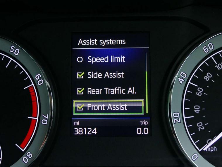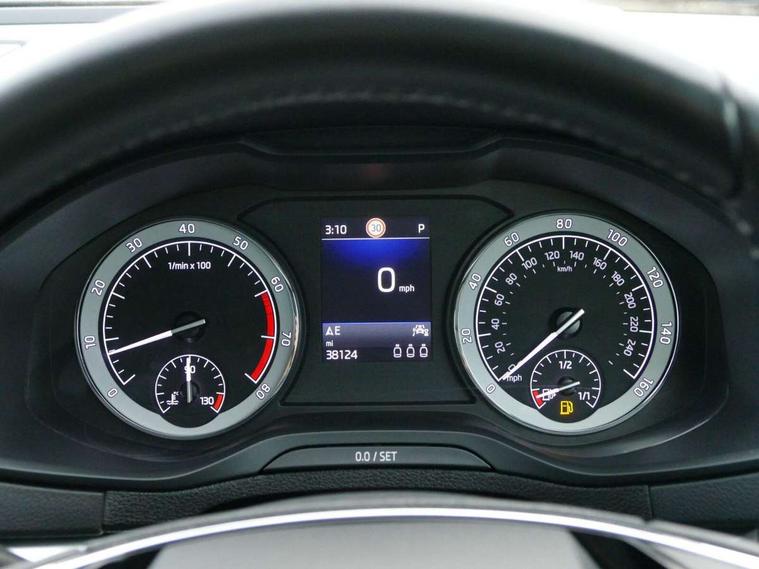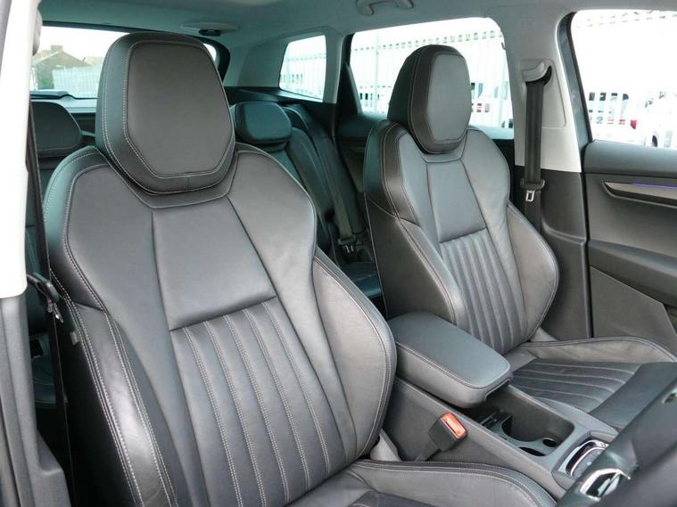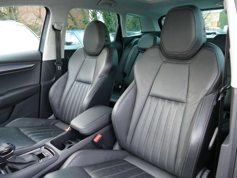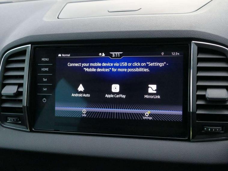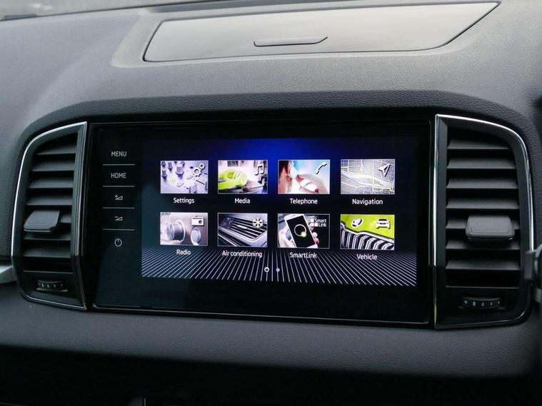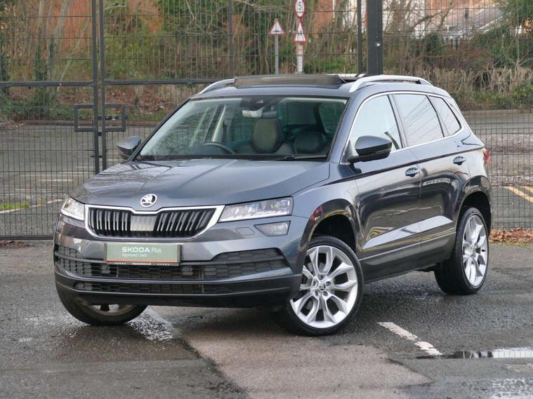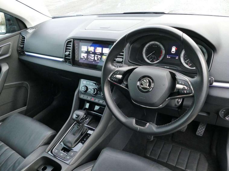Chrome framed air vents, Chrome roof rails + chrome pack - Karoq, Electrically adjustable driver's seat with memory function pack - Karoq, LED Interior lighting pack with Skoda welcome logo - Karoq, 19" Crater alloy wheels with anti theft wheel bolts, Storage on wheel cover, Alarm with interior monitoring, back up horn and tilt sensor with safe function, Electronic engine immobiliser, Keyless entry and keyless start with safe system, Remote central locking with 2 remote folding keys, Columbus satellite navigation with 9.2" touchscreen display and integrated WiFi, WLAN and web radio, DAB radio with Bluetooth, USB connection, Wireless charging without wireless aerial connection, Airbags - Front side, head, knee and curtain, Automatic door unlocking in case of crash, Automatic fuel cut off in case of crash, Driver airbag, Electronic parking brake with auto hold function, Emergency rear braking signal, ESC including ABS, MSR, ASR, EDS, HBA, DSR, RBS, MKB and traction control, Front assist radar scanning of the space in front of the car with automatic braking, Hill hold control, Passenger airbag with switch-off function, Pedestrian monitor, Seatbelt reminder signalisation and pretensioner for all seats, Three point seatbelts rear, Two tone horn, Tyre pressure display, Tyre pressure monitor, Acoustic glass, Aero front windscreen wipers with intermittent function, Automatic headlight control system, Black electric window control buttons, Body colour door mirrors and handles, Body coloured bumpers, Electric front and rear windows with child proof lock, Full LED headlights + adaptive front light system + LED daytime running lights and front cornering fog lights, Headlight washers, Heated rear windscreen, LED rear lights with high functionality, Light assistant (coming/leaving home/tunnel light), Panoramic sliding sunroof, Privacy glass, Safety reflectors on front doors, Third brake light, 1.5 litre bottle holders in driver and front passenger door panels, 12V socket in boot, 12v socket in front centre armrest with storage compartment and rear air vents, 2 Folding hooks and nets in boot, 2 Front readings lights for driver and passenger, 3 rear height adjustable headrests, 4 foldable roof handles with rear coat hooks, Cargo elements in boot, Chrome inner door handles, Folding tables on the front seat backrests, Front head restraints, Height adjustable front three point seats belts with tensioners, Height adjustable passenger seat, Height/reach adjust steering wheel, Ice scraper, Illuminated and cooled glovebox, Illuminated luggage compartment, Isofix child seat preparation outer rear, Leather upholstery, Net programme in boot, Pen holder, Pollen filter, Rear boot cover, Rear reading lights, Retractable parcel shelf attachable to tailgate, Safety vest holder, Storage box in upper central dashboard closed, Storage compartment below the passenger seat, Sunvisors with illuminated vanity mirrors, Textile floor mats, Umbrella under passenger seat, VarioFlex seats with retractable parcel shelf, Care connect, Drive mode selector, Driver fatigue sensor, Gesture control, Multifunction colour trip computer, Outside temperature gauge, Rear cross traffic alert, Service interval indicator, SmartLink wireless for Apple and wired for Android, Start/stop system with regenerative braking, Traffic sign recognition, USB C Port x 2 in front centre console,