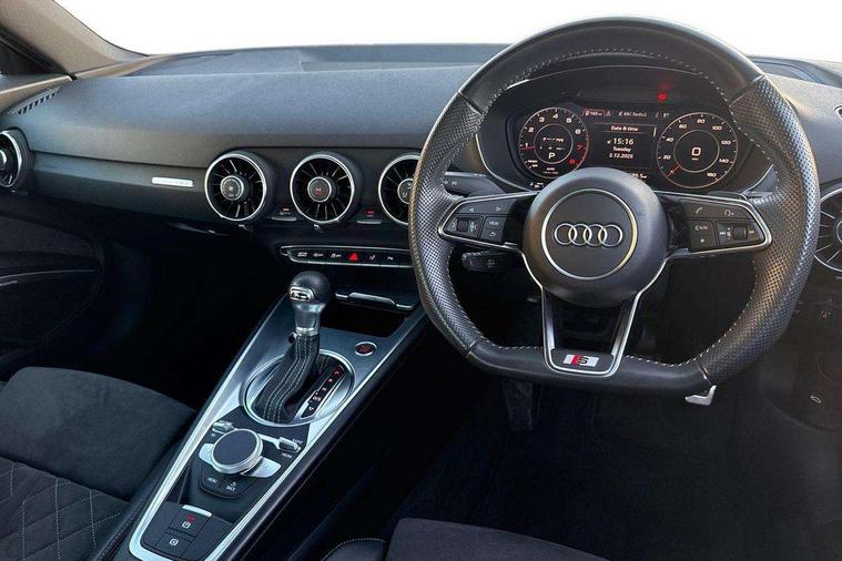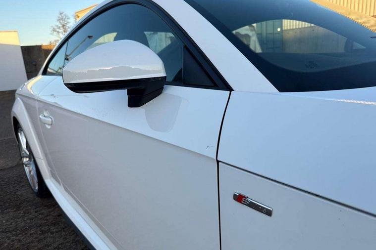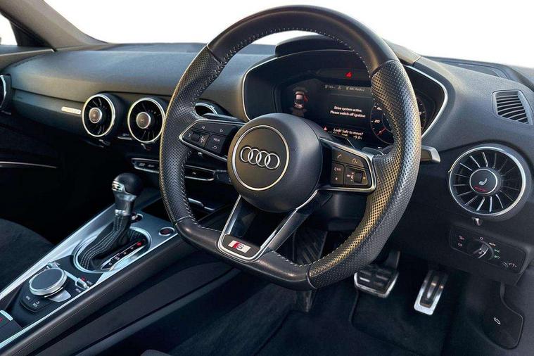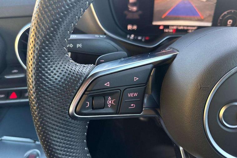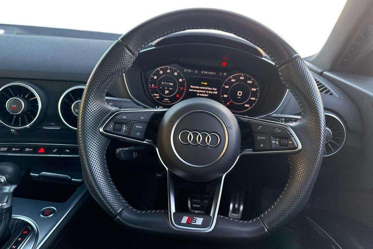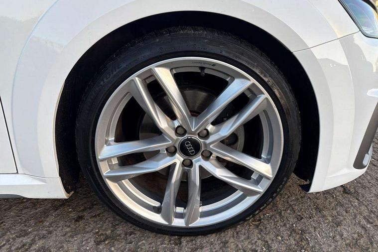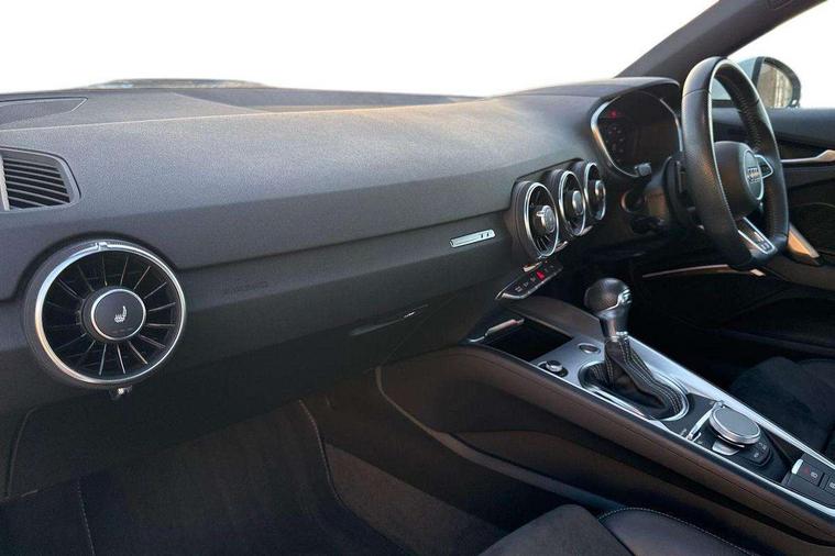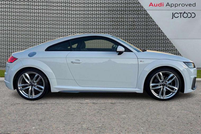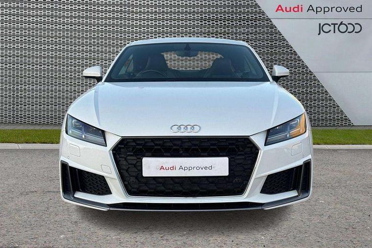 Matt brushed aluminium inlays, Non smoking pack - TT/TT RS, Tyre repair kit, Anti theft alarm, Anti theft wheel bolts, Immobiliser, Keyless Go, Remote central locking, AM/FM radio, Bluetooth audio streaming, DAB Digital radio, MMI Radio with CD player and SD/XC card slot, 3 point front seat belts, ABS, ASR traction control, Brake energy regeneration, Curtain airbags, Driver and front passenger airbag with front passenger airbag deactivation, EDL traction control, Electromechanical parking brake, ESP, First aid kit, Front side airbags, Head airbags, Hill hold assist, Seatbelt warning, Tyre pressure warning, Warning triangle, Auto dimming rear view mirror, Auto headlight range control, Body colour bumpers, Body colour electrically adjustable and heated door mirrors with built in LED side indicators, Dynamic rear indicators, Electric folding door mirrors, Electric front windows, Front fog lights, Green tinted heat insulating glass, Headlight wash system, High gloss black radiator grille, LED daytime running lights, LED headlights with LED rear lights + dynamic rear indicators, Light and rain sensors, Retractable rear spoiler, S line badges on front wings, S Line body styling, S Line front and rear bumpers, S line rear diffuser with platinum grey insert, S line sill plates, Sunband for windscreen, 12V socket, 3 spoke flat bottomed high multi-function leather sport steering wheel with gearshift paddles, 4 way electric lumbar support for driver and front passenger, Air conditioning, Black headlining, Door sill trims with S line logo, Extended aluminium look with stainless steel pedals, Front centre armrest, Front super sports seats, Heated front seats, Height adjustable driver's seat, Height adjustable front head restraints, Height/reach adjust steering wheel, ISOFIX child seat mounting for front passenger seat with airbag deactivation, Perforated leather gearknob, Rear head restraints, Rear top tether child seat ISOFIX attachment, S Line badge on steering wheel, Split folding rear seat, Tool kit, Top tether anchor plate for isofix child seat, Audi drive select with 4 Pre configured modes, Audi smartphone interface, Audi virtual cockpit - 12.3" high-resolution LCD display with fully customisable instrument cluster, Cruise control + speed limiter, MMI touch panel, Mobile phone preparation with bluetooth interface, Progressive power assisted steering, Service interval indicator, Start/Stop system with energy recuperation, TP memo, S line sports suspension,