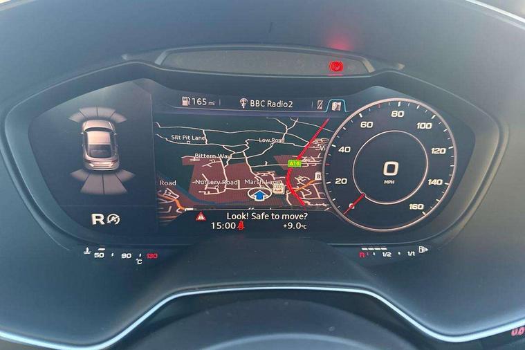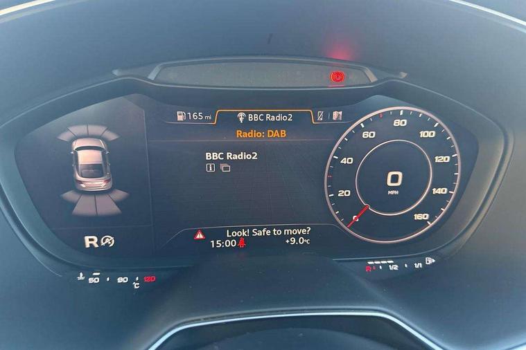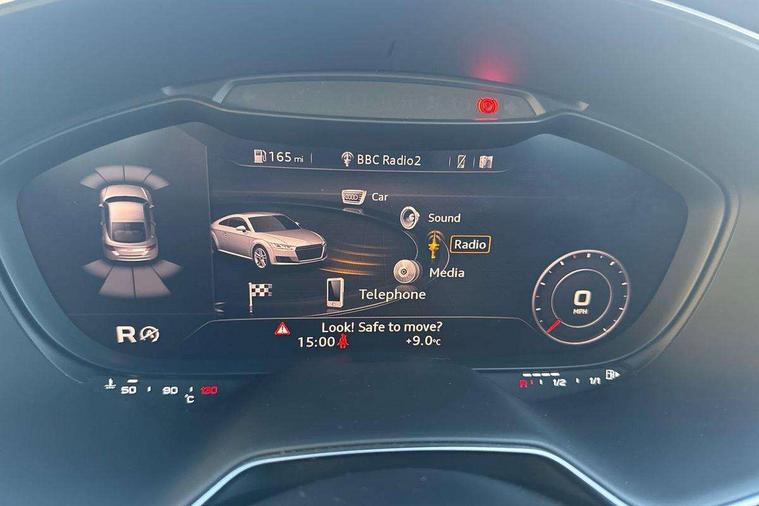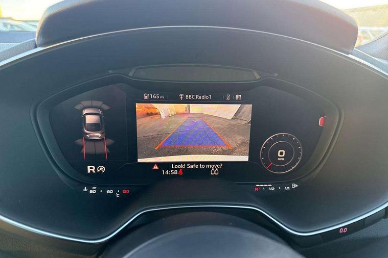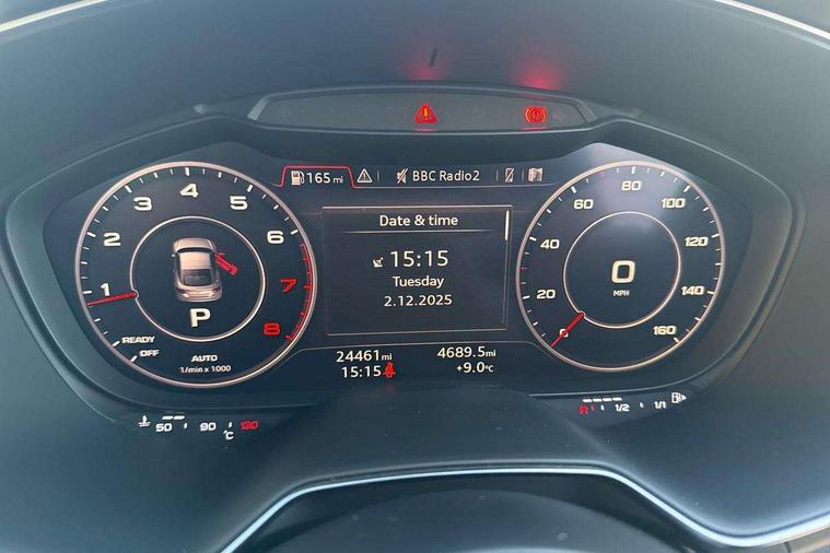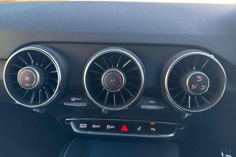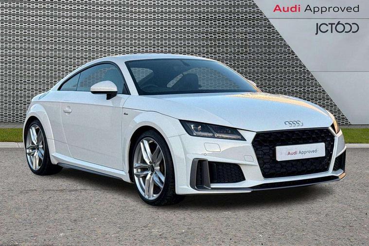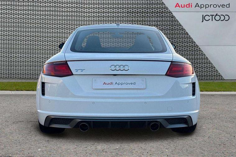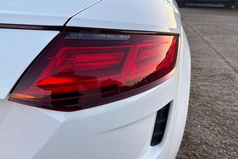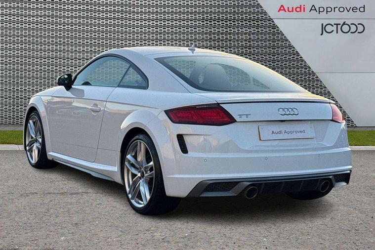 Matt brushed aluminium inlays, Non smoking pack - TT/TT RS, Tyre repair kit, Anti theft alarm, Anti theft wheel bolts, Immobiliser, Keyless Go, Remote central locking, AM/FM radio, Bluetooth audio streaming, DAB Digital radio, MMI Radio with CD player and SD/XC card slot, 3 point front seat belts, ABS, ASR traction control, Brake energy regeneration, Curtain airbags, Driver and front passenger airbag with front passenger airbag deactivation, EDL traction control, Electromechanical parking brake, ESP, First aid kit, Front side airbags, Head airbags, Hill hold assist, Seatbelt warning, Tyre pressure warning, Warning triangle, Auto dimming rear view mirror, Auto headlight range control, Body colour bumpers, Body colour electrically adjustable and heated door mirrors with built in LED side indicators, Dynamic rear indicators, Electric folding door mirrors, Electric front windows, Front fog lights, Green tinted heat insulating glass, Headlight wash system, High gloss black radiator grille, LED daytime running lights, LED headlights with LED rear lights + dynamic rear indicators, Light and rain sensors, Retractable rear spoiler, S line badges on front wings, S Line body styling, S Line front and rear bumpers, S line rear diffuser with platinum grey insert, S line sill plates, Sunband for windscreen, 12V socket, 3 spoke flat bottomed high multi-function leather sport steering wheel with gearshift paddles, 4 way electric lumbar support for driver and front passenger, Air conditioning, Black headlining, Door sill trims with S line logo, Extended aluminium look with stainless steel pedals, Front centre armrest, Front super sports seats, Heated front seats, Height adjustable driver's seat, Height adjustable front head restraints, Height/reach adjust steering wheel, ISOFIX child seat mounting for front passenger seat with airbag deactivation, Perforated leather gearknob, Rear head restraints, Rear top tether child seat ISOFIX attachment, S Line badge on steering wheel, Split folding rear seat, Tool kit, Top tether anchor plate for isofix child seat, Audi drive select with 4 Pre configured modes, Audi smartphone interface, Audi virtual cockpit - 12.3" high-resolution LCD display with fully customisable instrument cluster, Cruise control + speed limiter, MMI touch panel, Mobile phone preparation with bluetooth interface, Progressive power assisted steering, Service interval indicator, Start/Stop system with energy recuperation, TP memo, S line sports suspension,