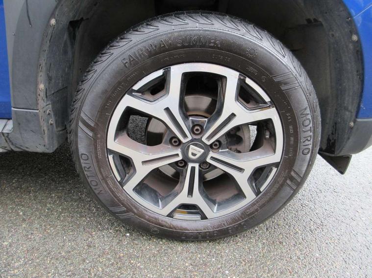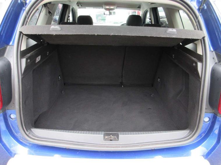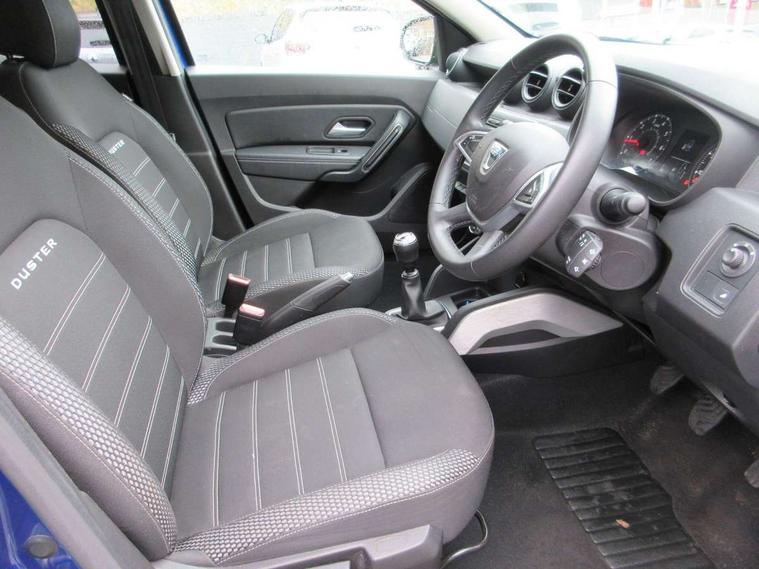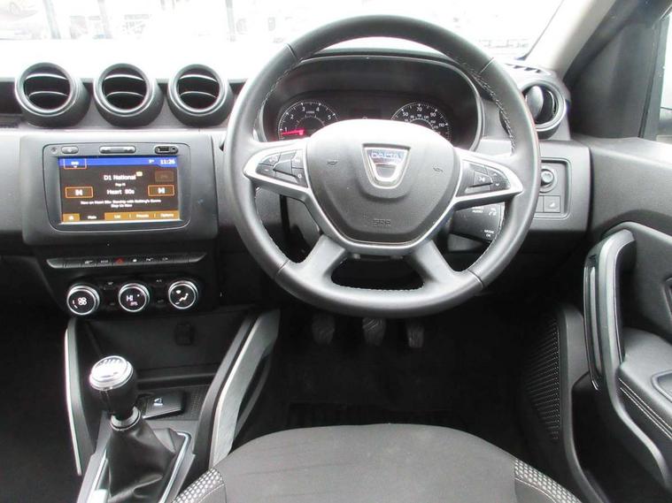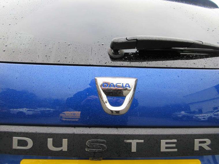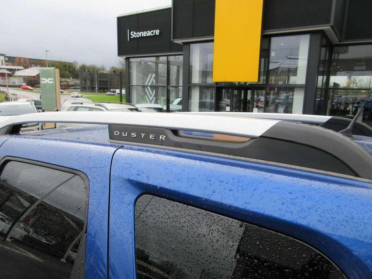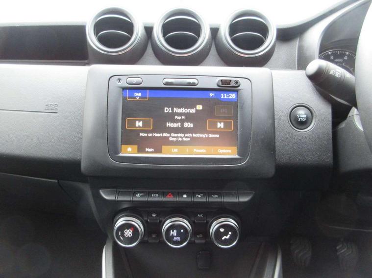 Dark carbon central console surround, Matt black central console fascia, Piano black decorative insert on door panels, Satin chrome air vent surround, Satin chrome instrument dial surrounds, 17" diamond cut alloy wheels, Keyless entry, Remote central locking, Thatcham approved engine immobiliser, 4x 20W FM/AM/DAB tuner with steering column mounted fingertip controls, Aux-in socket, USB connection for MP3 players, 3x3 point rear seatbelts, ABS and Emergency brake assist, ASR traction control with Electronic stability control, Child locks on rear doors, Door open visual and audible warning, Driver airbag, Driver and passenger seatbelt not fastened - visual and audible warning, Front passenger airbag, Front passenger airbag deactivation, Front seatbelt pretensioners, Front side airbags, Height adjustable front seatbelts, Tyre pressure monitor, 3 speed windscreen wipers, Black number plate surround, Black side sills, Black/satin chrome tailgate trim with Duster inscription in black background and lettering, Body coloured door handles, Body coloured front and rear upper section bumpers, Chrome front grille, Dark glass on lateral rear windows, Dark metal door mirrors in grey, Daytime running lights, Double optic headlights, Electric adjustable/heated door mirrors, Electric front windows, Electric rear windows, Front and rear black lower section bumpers, Front door sill protection strip, Front fog lights, Heated rear window, High level third rear brake light, LED automatically switched on - In main headlights, Rear wash/wipe, Satin chrome front and rear skid plates, Satin chrome longitudinal roof bars, 3 rear height adjustable headrests, 4 speed heating and ventilation with air recirculation, 60/40 split folding rear seat, Boot light, Climate control, Driver seat lumbar adjustment, Fabric decorative insert on door panels, Front passenger reading light, Front seat armrests, Gear shift indicator, Glovebox light, Height adjustable driver seat, Height adjustable front headrests, Height adjustable steering wheel, Isofix points for child seats in both outer rear seats, Map pocket on front seat backs, Matt black front door handles, Matt black rear door handles, Passenger sunvisor with vanity mirror, Rear passenger reading light, Satin chrome gear lever cap insert, Satin chrome lower steering wheel insert, Soft feel steering wheel, Blind spot monitoring, Bluetooth connectivity, Cruise control, Dusk sensor, Eco mode, Electric power assisted steering, MediaNav Evolution 7" touchscreen multimedia system with satellite navigation, Apple car play and Android auto, RDS with TMC, siri voice recognition, Multi view camera, On board computer, odometer, trip computer, average fuel consumption, average speed, service indicator, outside temperature gauge, Rear parking camera, Rear parking sensors, Rev counter, Speed limiter, Stop/start system,