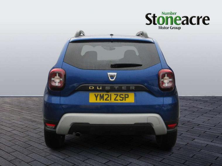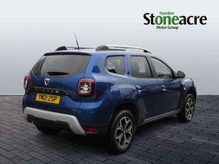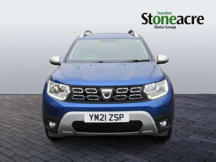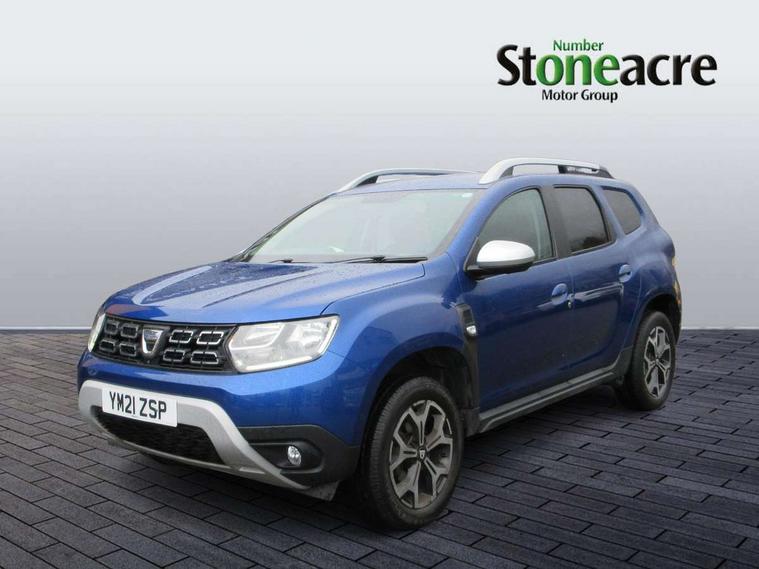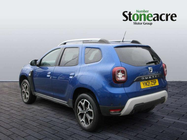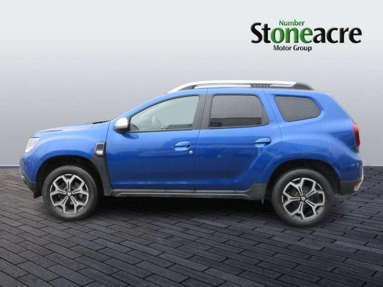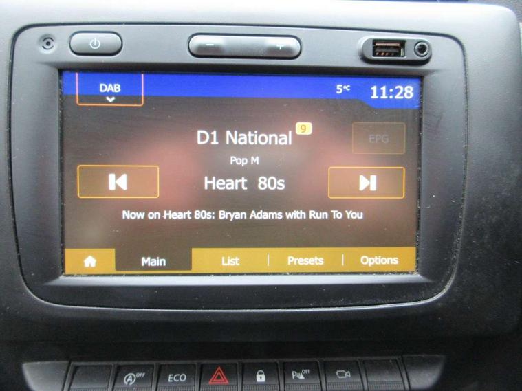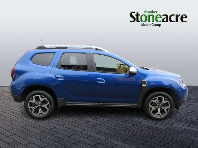 Dark carbon central console surround, Matt black central console fascia, Piano black decorative insert on door panels, Satin chrome air vent surround, Satin chrome instrument dial surrounds, 17" diamond cut alloy wheels, Keyless entry, Remote central locking, Thatcham approved engine immobiliser, 4x 20W FM/AM/DAB tuner with steering column mounted fingertip controls, Aux-in socket, USB connection for MP3 players, 3x3 point rear seatbelts, ABS and Emergency brake assist, ASR traction control with Electronic stability control, Child locks on rear doors, Door open visual and audible warning, Driver airbag, Driver and passenger seatbelt not fastened - visual and audible warning, Front passenger airbag, Front passenger airbag deactivation, Front seatbelt pretensioners, Front side airbags, Height adjustable front seatbelts, Tyre pressure monitor, 3 speed windscreen wipers, Black number plate surround, Black side sills, Black/satin chrome tailgate trim with Duster inscription in black background and lettering, Body coloured door handles, Body coloured front and rear upper section bumpers, Chrome front grille, Dark glass on lateral rear windows, Dark metal door mirrors in grey, Daytime running lights, Double optic headlights, Electric adjustable/heated door mirrors, Electric front windows, Electric rear windows, Front and rear black lower section bumpers, Front door sill protection strip, Front fog lights, Heated rear window, High level third rear brake light, LED automatically switched on - In main headlights, Rear wash/wipe, Satin chrome front and rear skid plates, Satin chrome longitudinal roof bars, 3 rear height adjustable headrests, 4 speed heating and ventilation with air recirculation, 60/40 split folding rear seat, Boot light, Climate control, Driver seat lumbar adjustment, Fabric decorative insert on door panels, Front passenger reading light, Front seat armrests, Gear shift indicator, Glovebox light, Height adjustable driver seat, Height adjustable front headrests, Height adjustable steering wheel, Isofix points for child seats in both outer rear seats, Map pocket on front seat backs, Matt black front door handles, Matt black rear door handles, Passenger sunvisor with vanity mirror, Rear passenger reading light, Satin chrome gear lever cap insert, Satin chrome lower steering wheel insert, Soft feel steering wheel, Blind spot monitoring, Bluetooth connectivity, Cruise control, Dusk sensor, Eco mode, Electric power assisted steering, MediaNav Evolution 7" touchscreen multimedia system with satellite navigation, Apple car play and Android auto, RDS with TMC, siri voice recognition, Multi view camera, On board computer, odometer, trip computer, average fuel consumption, average speed, service indicator, outside temperature gauge, Rear parking camera, Rear parking sensors, Rev counter, Speed limiter, Stop/start system,