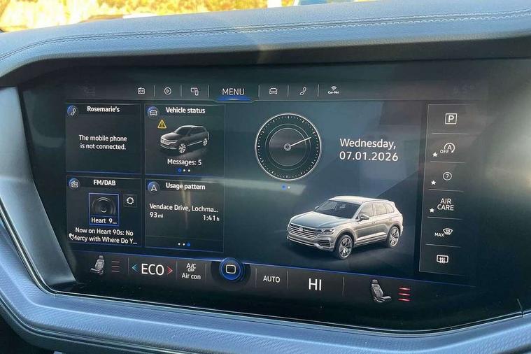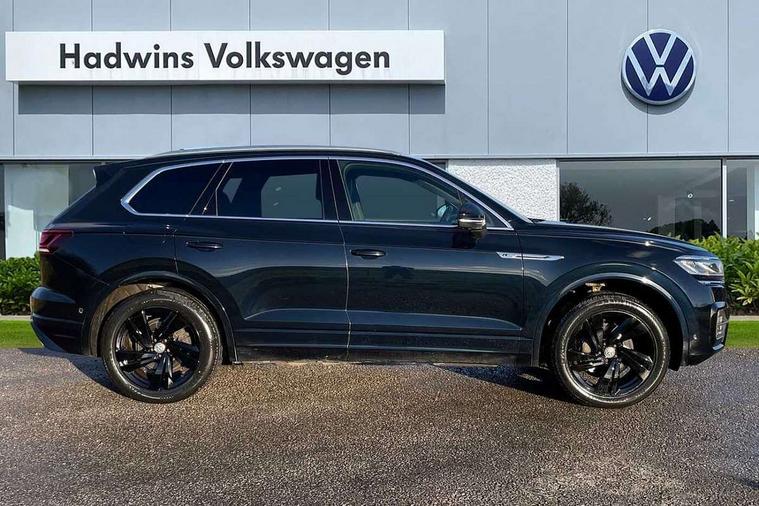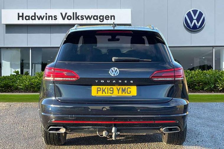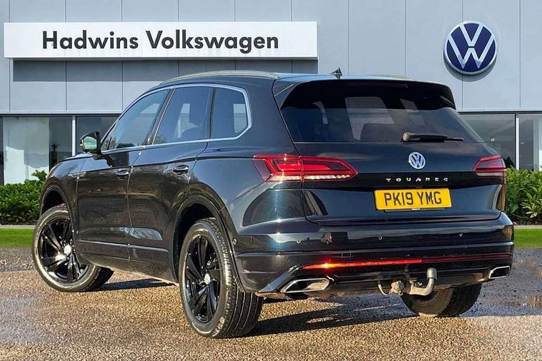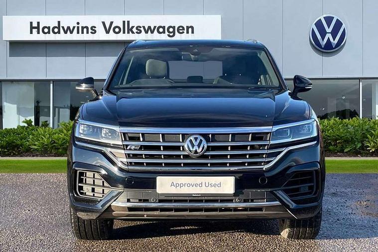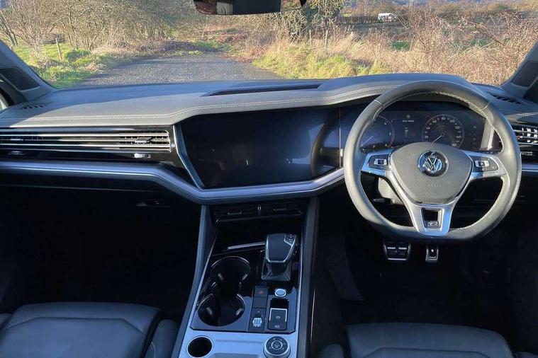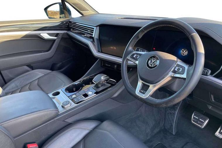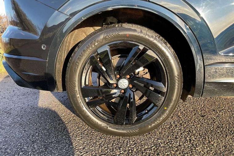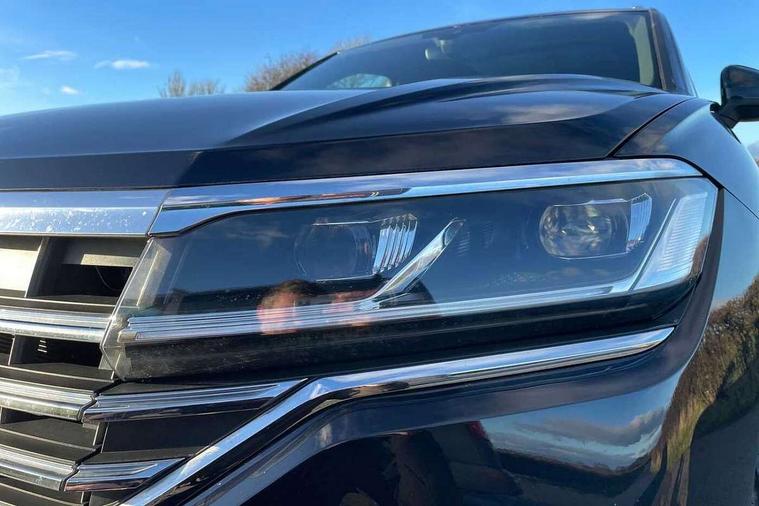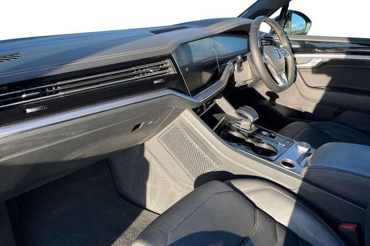 Aluminium dash and door panel inserts, High gloss black centre console, Innovision cockpit pack with Digital cockpit - Touareg, Temporary space saver steel spare wheel, Alarm with interior monitoring in cab, backup horn and towing protection, Anti-theft wheel bolts, Remote central locking, 2x SD card slot, DAB Digital radio, Gesture control for infotainment system, 3 point front seatbelts with pre-tensioners, ABS, Active bonnet, Automatic post collision braking system, Curtain airbags, Driver/Front Passenger airbags, EBD + Brake Assist, EDL, Electronic parking brake with auto hold, ESC with ASR, Front seat side impact airbags, Hill descent control, Passenger airbag deactivate switch, Seatbelt warning lamp and buzzer, Three 3 point rear seatbelts, Two tone horn, Warning triangle and first aid kit, Auto dimming rear view mirror, Automatic coming/leaving home lighting function, Automatic headlights, Black rear diffuser, Body colour bumpers, Body colour door handles, Body colour door mirrors with integral indicators, Body coloured side skirts, Chrome exhaust tailpipes, Chrome protective strip on door sill, Chrome trimmed radiator grille and air intake, Chrome trimmed side windows, Front and rear electric windows, Headlight range control, Heated windscreen washer jets, LED cornering headlights, LED daytime running lights, LED Indicators, Puddle lights, Rear fog lights, Rear wiper, 12V Accessory socket in centre console, 3 rear head restraints, 4 load lashing points, 4 way adjustable front head restraints, 4 way electric lumbar support for driver and front passenger, 4 zone climate control, 60/40 split folding slide/recline rear seat, Driver/front passenger seat height adjustment, Electric luggage compartment cover, Folding rear centre armrest with 2 cupholders, Front + rear carpet mats, Front centre armrest with storage box, Gear shift indicator, Height/reach adjust steering wheel, Isofix preparation for 2 rear child seats, Jack and tool kit, Leather heated multifunction steering wheel with paddle shift, Leatherette door trim, Load through provision, Soul black headlining, Stainless steel load sill protection, Stainless steel pedals, Sunvisors with illuminated vanity mirrors, ACC - Adaptive cruise control with front assist, forward collision warning, distance monitoring, city emergency brake and speed limiter, Apple car play/Android Auto, Bluetooth hands free telephone connection, Drive select with Damper control, Driver alert system, Dynamic road sign display camera controlled system with visual warning for traffic and road signs, Instrument cluster, MirrorLink, Multifunction camera with lane assist, Multifunction computer, Park assist with rear view camera, Service interval indicator, Speed sensitive power steering, Start/stop system with regenerative braking, Tailgate power latch, Traffic sign recognition, Voice control system, Wireless Smartphone charger, Torsen limited slip differential,