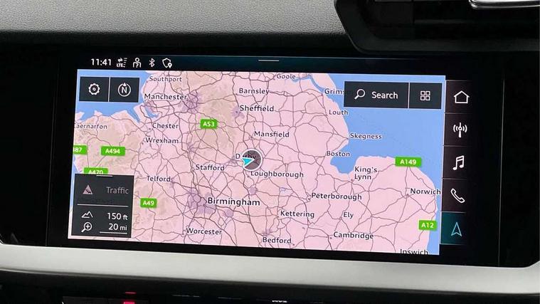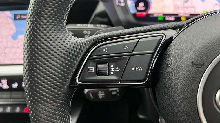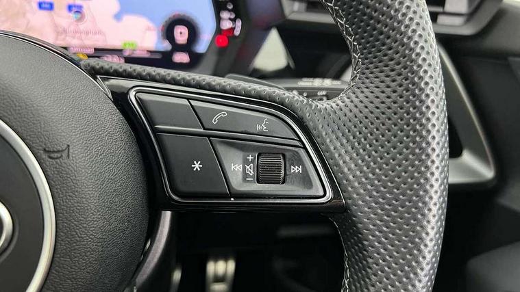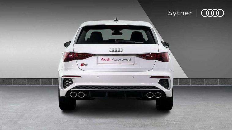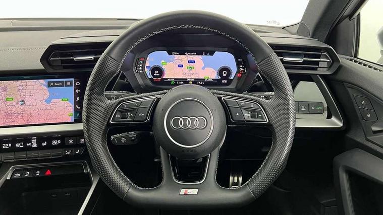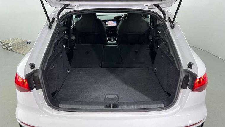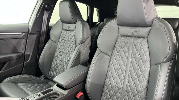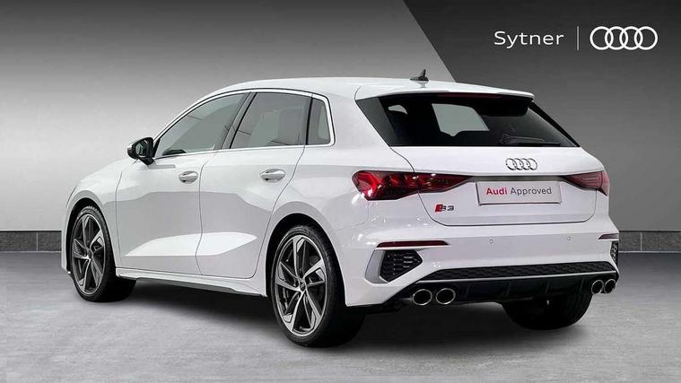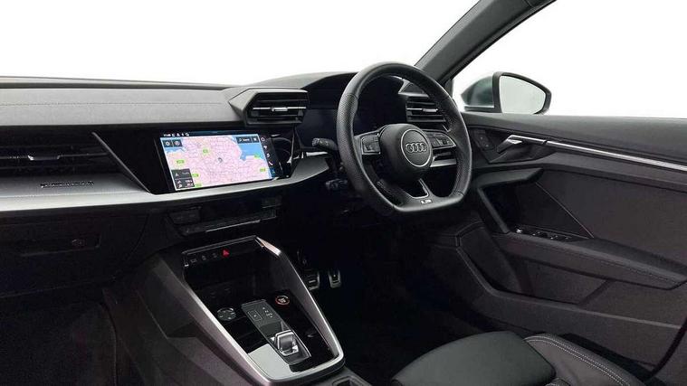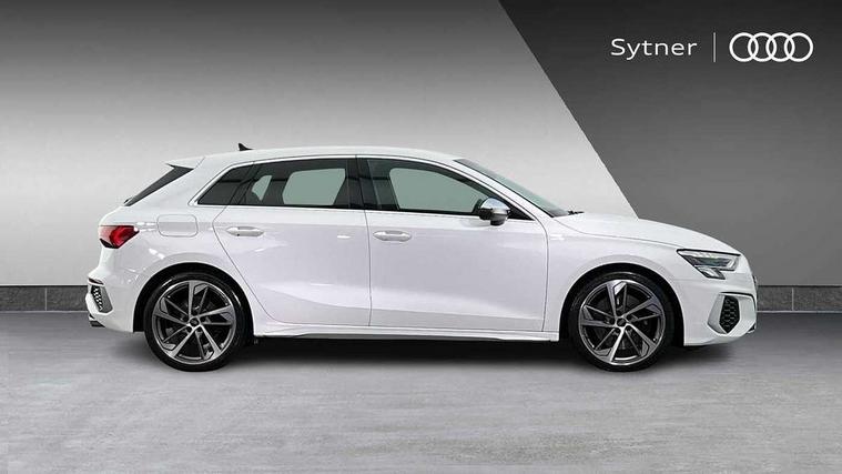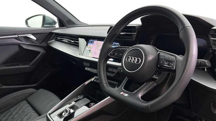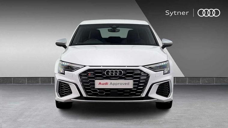 Accent surfaces in the dashboard and centre console in platinum grey silk effect paint finish, Dark spectrum aluminium inlays, Aluminium interior elements pack - A3 Sportback, Design body styling - A3 Sportback, Storage pack - A3 Sportback, Anti theft alarm, Anti-theft wheel bolts, Immobiliser, Manual child locks, Remote control central locking, 2xUSB-C connection with data and charging functions, 6 passive loudspeakers, DAB Digital radio, 3x3 point rear seat belts, Audi pre sense front, Driver and front passenger airbag with passenger airbag deactivation, Electronic Stabilisation Control (ESC) including ABS, ASR and EDL, First aid kit with warning triangle and 2 safety vests, Front side airbags with head airbags and interaction airbag, Pre-sense front with pedestrian and cyclist detection, Seatbelt monitoring, Tyre pressure loss indicator, 3rd brake light, Acoustic glass windscreen, Aluminium window trim, Audi Beam uses LEDs to project the Audi S3 logo, Auto dimming frameless rear view mirror, Electrically adjustable/heated/folding/dimming door mirrors with kerb view includes integrated LED indications + kerb view function for passenger side, Front electric windows, Headlight washers, Illuminated aluminium inserts front door sills with S logo, LED daytime running lights, LED headlights with LED rear lights and dynamic rear indicators, Light and rain sensors, Privacy glass - dark tinted rear window, rear door and side windows, Rear electric windows, Rear side air outlets in grained matt black, Rear side wing doors, Rear wiper, 12V socket and storage compartment in front centre console, 3 seat bench in 2nd row, 40/20/40 split folding rear seat bench with cupholder, Black cloth headlining, Dual zone electronic climate control, Front and rear headrests, Front/rear floor mats, Heated front seats, Height and reach adjustable steering wheel, Illuminated vanity mirror, Interior lighting - glove compartment light and right hand side, Luggage compartment floor covering, Manually adjustable front seats, Seat side bolsters, Single front passenger seat, Stainless steel pedals and front footrest in black, Audi drive select (Auto, Comfort, Dynamic, Efficiency and Individual), Audi smartphone interface, Audi Virtual Cockpit - 10.25" digital and colour instrument cluster, Automatic start/stop system with recuperation, Bluetooth interface, Collision avoidance assistant, e-Call (emergency call), Lane departure warning system, MMI Navigation Plus with high resolution 10.1" colour touch screen display, Progressive steering, Service indicator, Trip computer, Voice control system with natural language interaction, Quattro permanent all wheel drive, S sports suspension,
