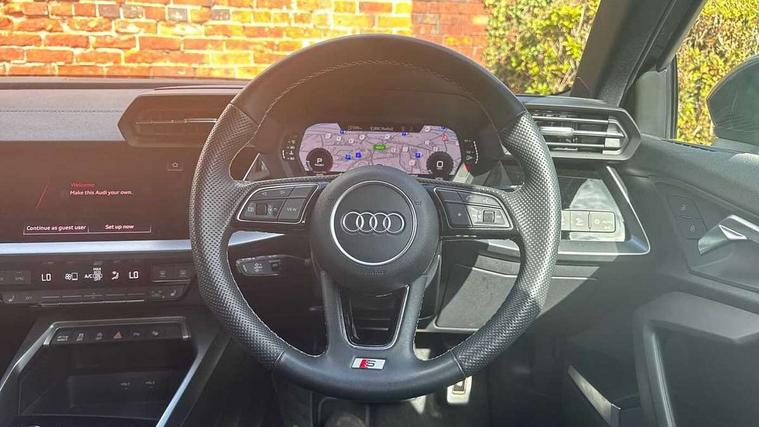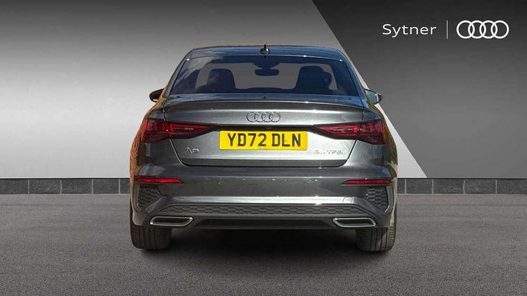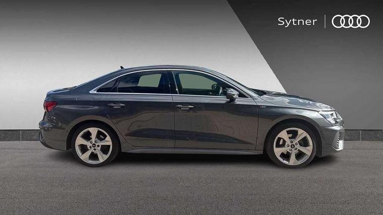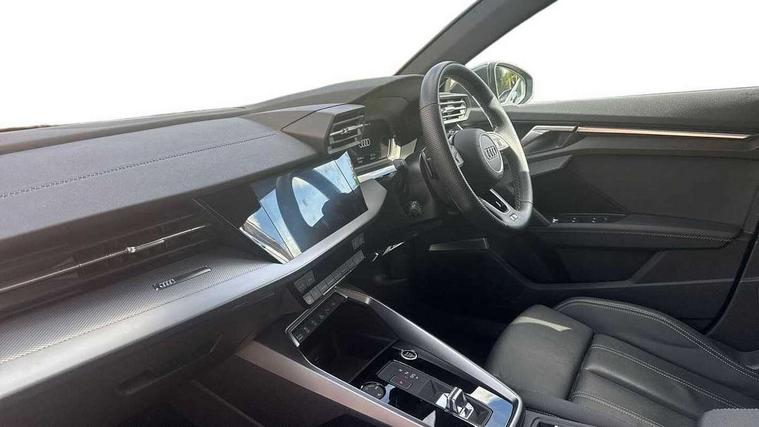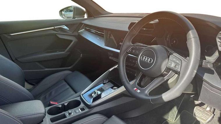 Aluminium air vent surrounds, Aluminium trim elements, Dark spectrum aluminium inlays, accent surfaces in the dashboard and centre console in platinum grey silk effect paint finish, Aluminium interior elements pack - A3 Saloon, LED interior lighting pack - A3 Saloon, S line styling pack - A3 Saloon, Anti theft alarm, Anti-theft wheel bolts, Immobiliser, Remote control central locking, 2x USB Type C ports (for charging and data transfer), 6 passive loudspeakers, CD player, DAB Digital radio, 3x3 point rear seat belts, Driver and front passenger airbag with passenger airbag deactivation, Electronic Stabilisation Control (ESC) including ABS, ASR and EDL, First aid kit with warning triangle and 2 safety vests, Front side airbags with head airbags and interaction airbag, Hill hold assist, Pre-sense front with pedestrian and cyclist detection, Seatbelt monitoring, Tyre pressure loss indicator, 3rd brake light, Acoustic glass windscreen, Aluminium window trim, Auto dimming frameless rear view mirror, Electrically adjustable/heated/folding/dimming door mirrors with kerb view includes integrated LED indications + kerb view function for passenger side, Front electric windows, Illuminated door sills with aluminium inserts at the front with S logo, LED daytime running lights, LED headlights with LED rear lights and dynamic rear indicators, Light and rain sensors, Model and engine designation badges at rear, Privacy glass - dark tinted rear window, rear door and side windows, Rear boot, Rear electric windows, Rear side wing doors, S line bumpers, S roof spoiler, 12V socket and storage compartment in front centre console, 3 seat bench in 2nd row, 40/20/40 split folding rear seat bench with cupholder, Black cloth headlining, Dual zone electronic climate control, Electronically operated child locks, Front and rear centre armrest in leather, Front and rear headrests, Front/rear floor mats, Height and reach adjustable steering wheel, Illuminated vanity mirror, Interior lighting - glove compartment light and right hand side, Luggage compartment floor covering, Manual boot compartment lid, Manually adjustable front sport seats, Seat side bolsters, Single front passenger seat, Stainless steel pedals and front footrest in black, Twin leather upholstery with front sports seats S embossed logo, Audi connect emergency call and service, Audi drive select (Auto, Comfort, Dynamic, Efficiency and Individual), Audi smartphone interface, Audi Virtual Cockpit - 10.25" digital and colour instrument cluster, Automatic start/stop system with recuperation, Bluetooth interface, Collision avoidance assistant, Electromechanical power speed sensitive steering, Lane departure warning system, MMI Navigation Plus with high resolution 10.1" colour touch screen display, Service indicator, Voice control system with natural language interaction,