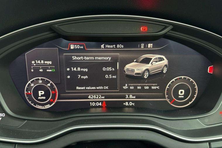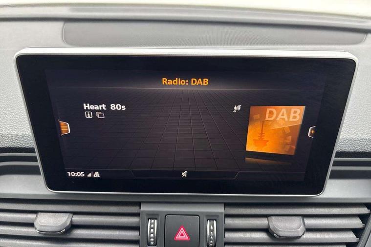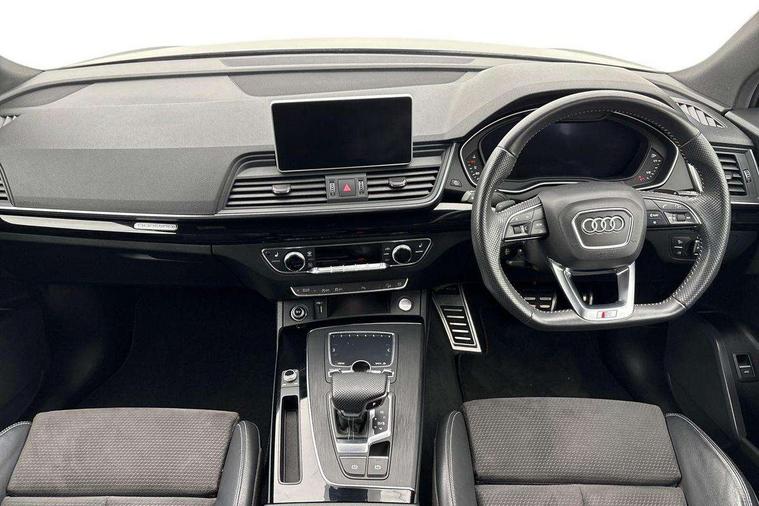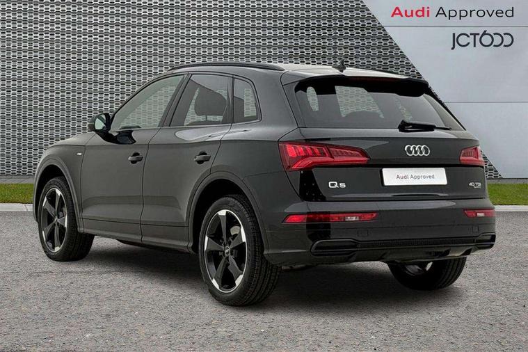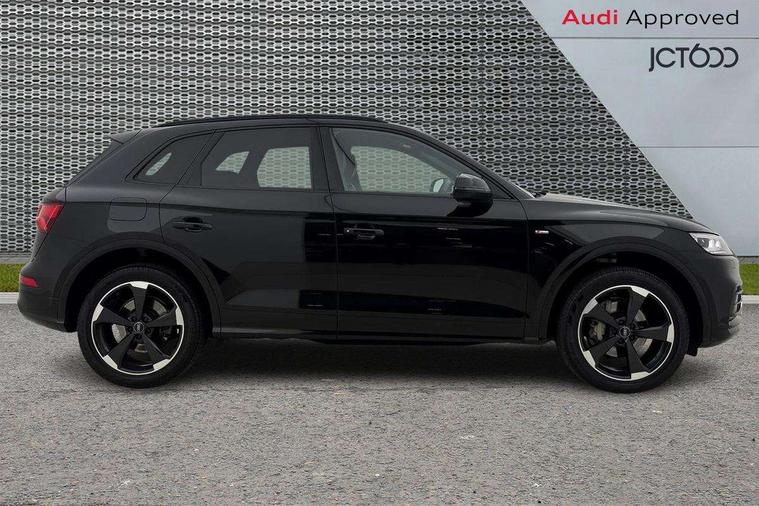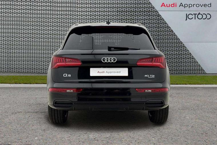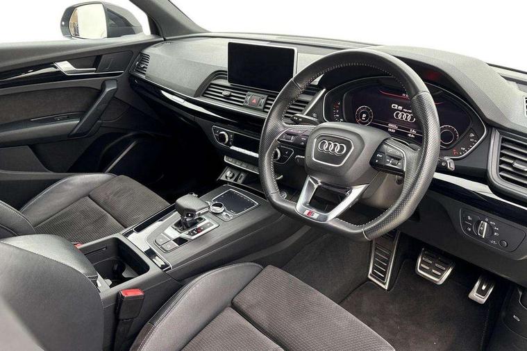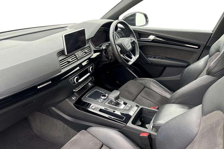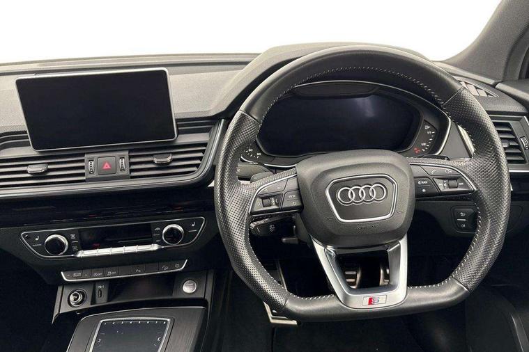 Black piano finish inlays, LED interior light pack - Q5, Non Smokers pack, Titanium black styling pack - Q5, 20" 5 arm rotor design sport alloy wheels in gloss anthracite black, diamond cut finish, Anti theft alarm, Anti-theft wheel bolts, Keyless Go access/ignition system, Remote central locking, 2x SD card slot, CD player, DAB Digital radio, MMI radio plus with 7" colour MMI screen and MMI controller, 3 point seatbelts on all seats, 6 airbags - Driver, front passenger, curtain and side airbags, Electromechanical parking brake, Electronic stabilisation control including ABS, ASR and EDL, Front passenger airbag deactivation, Hill descent control, Hill hold assist, Multi collision brake assist, Pop-up bonnet for pedestrian protection, Pre sense city, Seat belt force limiter, Seatbelt monitoring, Tyre pressure warning, Warning triangle and first aid kit, Acoustic windscreen, Air inlets in matt titanium black with blades in matt aluminium silver, Auto dimming rear view mirror, Automatic headlight levelling, Black roof rails, Body colour bumpers, Body colour rear diffuser with matt aluminium silver surrounds, Body colour underbody protection, Chrome exhaust tailpipe, Electric adjustable/heated/folding door mirrors, Front and rear electric windows, High beam assistant, LED headlights with LED rear lights + dynamic rear indicators, Light and rain sensor for auto activation of lights and windscreen wipers, Loading sill protector in stainless steel, Privacy glass with front acoustic glazing, Rear wiper, Titanium black door mirror housings, 2 x USB charging port with aux input socket, 3 rear headrests, 3 spoke flat bottom high multi-function leather steering wheel, 40:20:40 split folding rear seat with rear centre armrest, Black cloth headlining, Contrast stitching on seats, steering wheel and gear lever gaiter, Deluxe 3 zone electronic climate control, Front centre armrest, Front sport seats with S embossed logo, Front/rear floor mats, Heated front seats, Height adjustable front head restraints, Height/reach adjustable steering column, ISOFIX child seat mounting and top tether, Luggage compartment carpet, Manual seat adjustment with 4-way electric lumbar support, Perforated leather gearknob, Removable luggage compartment floor, Stainless steel pedals, Sunvisors with vanity mirrors, Tool kit, Trunk roller cover, 7" Colour driver information system, Audi connect safety and service (e-call), Audi drive select, Audi parking system plus with front and rear sensors, Audi Pre sense collision avoidance, Audi smartphone interface, Automatic start-stop system with coasting functionality and efficiency programme, Cruise control + speed limiter, Electro - mechanical power assisted steering, MMI Navigation, Mobile telephone preparation - bluetooth interface, Power tailgate, Service interval indicator, Voice control system, Diesel particulate filter, Dynamic suspension, Quattro on demand,