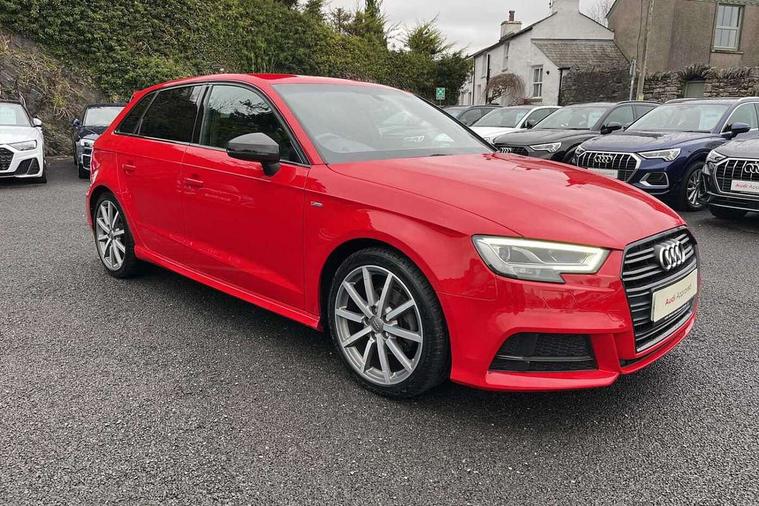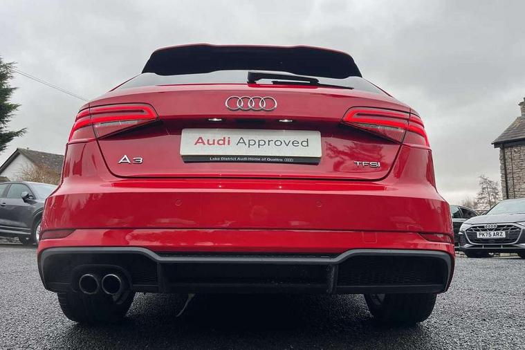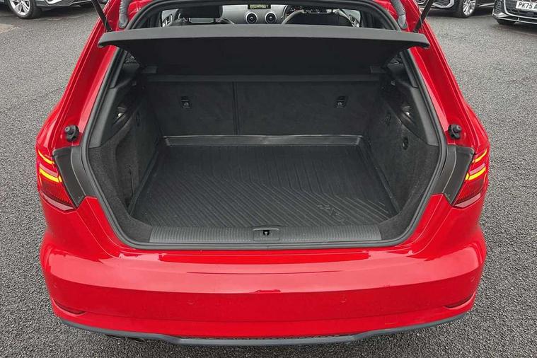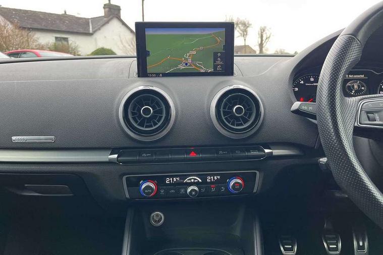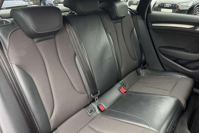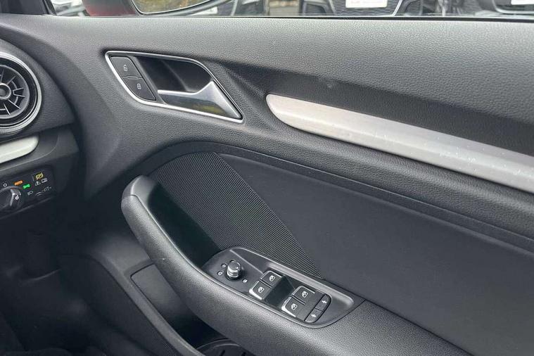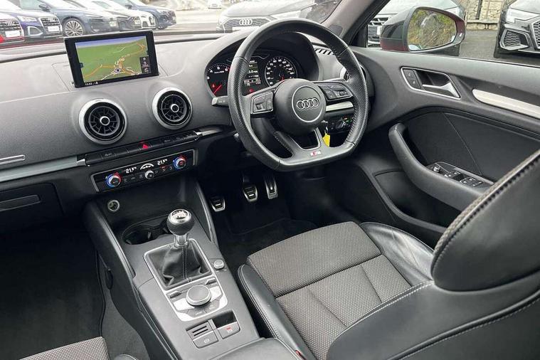 Aluminium air vent surrounds, Aluminium trim elements, Matt brushed aluminium inlays, Black styling pack - A3/S3, LED interior light pack - A3/RS3, Non smoking pack - A3, Storage and luggage pack - A3/RS3, 18" 10 spoke design alloy wheels in matt titanium look with diamond cut finish, Space saver spare wheel, Anti theft alarm, Anti-theft wheel bolts, Remote control central locking, Thatcham category 1 alarm + immobiliser, 2 USB ports, Audi music interface, Audi sound system with 10 loudspeakers, Auxiliary input socket, CD player, DAB Digital radio, MMI radio plus with 7" colour MMI screen and MMI controller, 3 point seatbelts on all seats, ABS/EBD, Active bonnet, Active front headrests, ASR, Curtain airbags, Driver and passenger side airbags, Driver/Front Passenger airbags, Drivers knee airbag, EDL, Electromechanical parking brake, ESC - Electronic Stability Control + traction control, Front passenger airbag deactivation, Manual rear child locks, Multi-Collision braking, Seatbelt warning, Tyre pressure warning, Warning triangle and first aid kit, Auto dimming rear view mirror with light and rain sensors, Black door mirrors, Black window surrounds, Body colour bumpers with black insert, Body colour roof spoiler, Chrome exhaust tailpipes, Electric front windows, Electric operated/heated door mirrors, Electric rear windows, Heated windscreen washer jets, LED daytime running lights, Matt black radiator grille, Privacy glass, Rear wiper, S Line body styling, Sport specific side air inlet grille and diffuser insert, 3 adjustable rear headrests, 3 spoke flat bottomed multi-function leather steering wheel, 4 lashing points to secure luggage, Adjustable front armrest, Black cloth headlining, Dual zone electronic climate control, Front and rear interior lights with delay, Front passenger seat isofix location point, Front sports seats, Front/rear floor mats, Height/depth adjustable steering column, Illuminated glovebox, ISOFIX child seat preparation+airbag deactivation, Jack and tool kit, Stainless steel pedals, Storage compartment in centre console, Storage compartment under front seats, Storage compartments in doors, Audi connect, Audi drive select, Audi smartphone interface, Colour driver's information system display, Electro-mechanical PAS, HDD satellite navigation system radio single CD/DVD player MMI control system, Mobile telephone preparation - bluetooth interface, Service interval indicator, Speed limit display, Voice control system,
