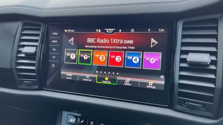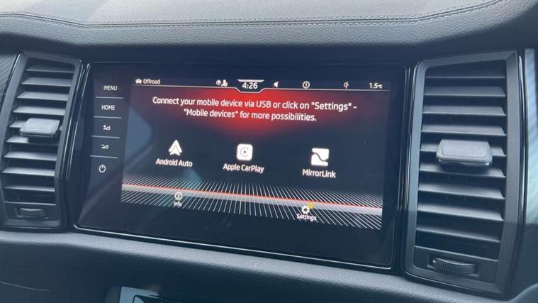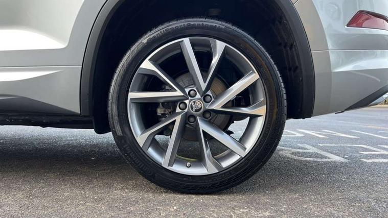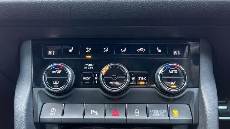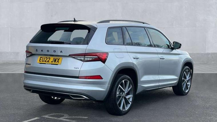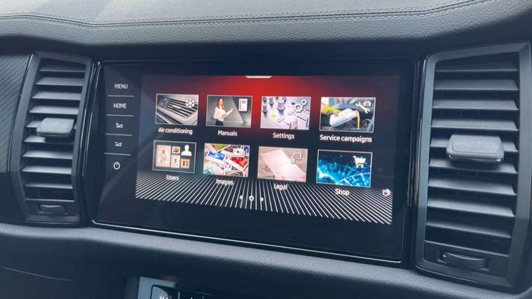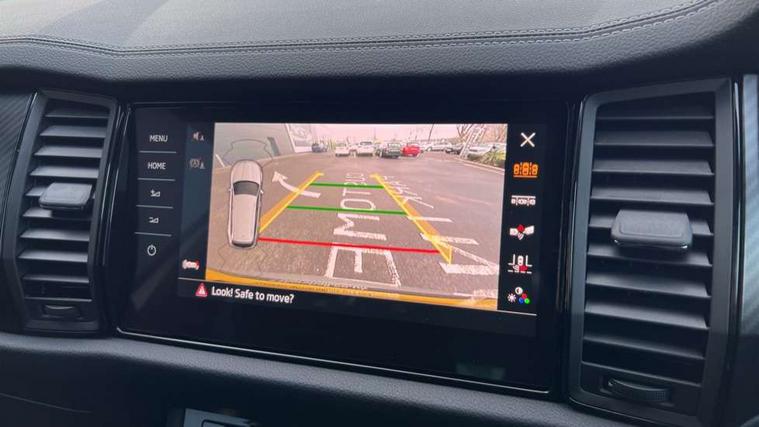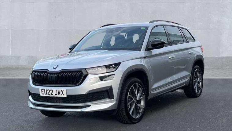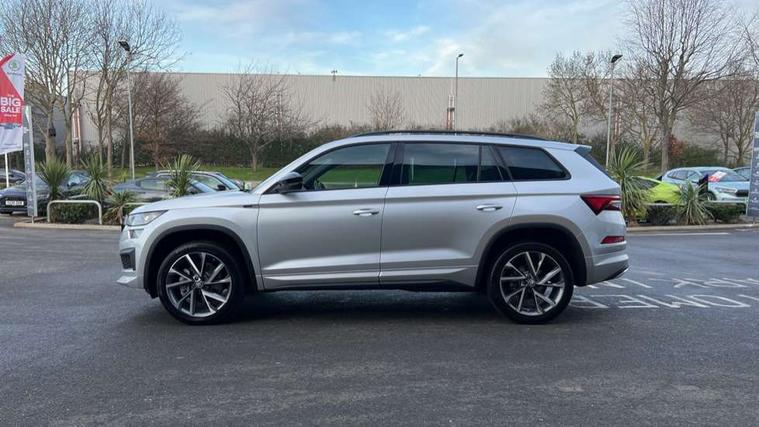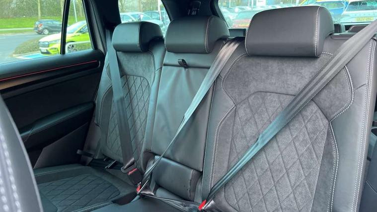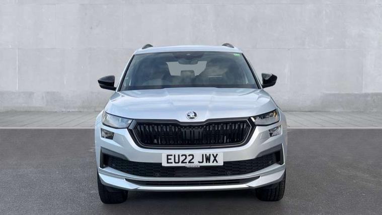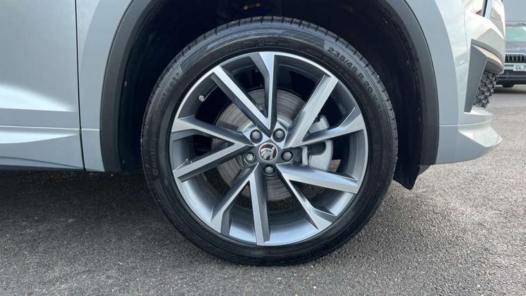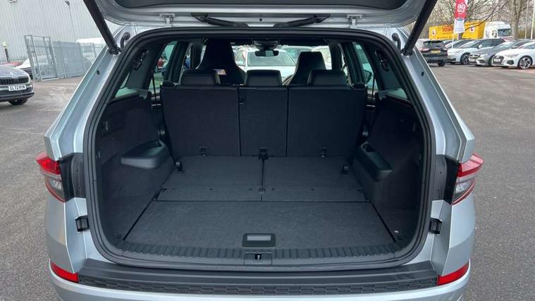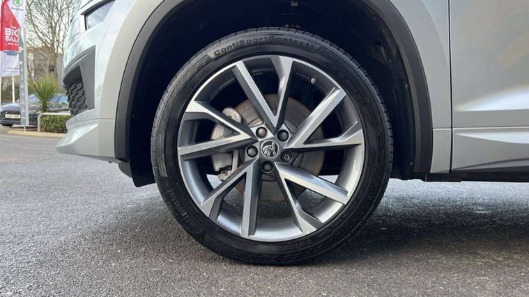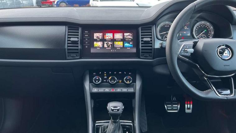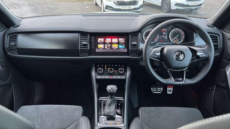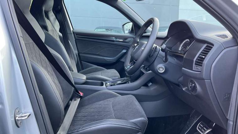 Black air vent surround, Carbon finish dashboard and door inserts, Grey stitching in dashboard, LED Interior light pack - Kodiaq, 20" Vega Anthracite alloy wheels, Temporary spare wheel (space saver), Alarm with interior monitoring and tilt sensor with safe function, Anti-theft wheel bolts, Immobiliser, Keyless entry and start system (KESSY), Remote central locking with 2 keys, 8 speakers, DAB Digital radio, Auto door release and activation of warning lights, Child locks on rear doors, Driver and front passenger airbag with knee airbag and front passenger airbag deactivation, Electronic parking brake with hill start assist, Emergency rear braking signal, ESC (incl. ABS+MSR+ASR+EDS+HBA+DSR+RBS+MKB), Front assist with autonomous emergency braking, Front side airbags with curtain airbags, Fuel cut off safety device, Height adjustable front 3 point seatbelts + pretensioners, Hill hold control, Rear disc brakes, Safety vest holder in door, Seat belt reminder for all seats, Tailgate unlocking from outside, Three point rear seat belts, Two tone horn, Tyre pressure monitor, Aero front windscreen wipers with intermittent function, Aero rear window wiper, Auto dimming rear view mirror, Black roof rails, Black sports styling including front grille and window surrounds, Black wheel arch surrounds, Body colour bumpers, Body colour door handles, Electric adjustable/heated/folding door mirrors, driver side auto dimming with boarding sports and memory function, Electric front and rear windows, Extended rear spoiler with finlets in gloss black, Front fog lights, Full LED matrix headlights with AFS (adaptive front light system), cornering function and AWL (all weather lighting system), Gloss black door mirrors, Headlight washers, Heated rear window, Invisible tailpipe, LED daytime running lights, LED rear fog light, LED third brake light in rear spoiler, Light assistant (coming/leaving home/tunnel light), Off-road style lower front bumper element, Privacy glass, Rain and light sensors, Rear diffuser, Rear LED lights (high functionality) with welcome effect and dynamic indicators, Rear side wing doors, Safety reflectors on front and rear doors, Sportline badge on front fender, Sports front and rear bumpers including lower rear chrome strip, Tailgate lettering in Black, Window control switches with black trim, Without engine designation, 12V socket in boot, 2 rails with 2 hooks, 2 seat bench in 3rd row, 3 seat bench in 2nd row, 4 foldable roof handles with rear coat hooks, 60:40 foldable rear seat with sliding adjustment and backrest angle adjustment, Aluminium pedals, Black roof headlining, Bottle holders in door panel in the 1.5 litre front and 1 litre rear, Cargo storage compartments, Chrome headlight control button, Chrome interior door handles, Coat hooks on B pillar, Covered storage compartment on driver side, Front centre armrest with storage compartment, cup holder and 12V socket, Front courtesy lights, Gear shift lever with chrome frame and black gloss insert, Grey stitching in front and rear armrests and door armrests + door inserts, Height adjustable front headrests, Illuminated and cooled glovebox, Illuminated luggage compartment, Isofix child seat fittings in outer rear seats with top tether, Manually adjustable steering column, Microsuede door panels, Net programme in boot (1x horizontal Net, 2x vertical Nets), Overhead glasses storage compartment, Pollen filter, Rear centre armrest with cupholders, Single front passenger seat, Sliding trunk cover, Small Bags on the inner sides of the front backrests, Sports seats, Sunvisors with illuminated vanity mirrors, Three rear height adjustable headrests, Ticket holder on A Pillar, Umbrella in door panel, Variable boot floor, Bluetooth system, Columbus satellite navigation with 9.2" touchscreen, integrated Wi-Fi, web radio, Digital voice enhancement, E-call, ECO Stop/start function, Exterior temperature indicator, Progressive steering, Rear view camera, Smartlink wireless for apple carplay and wired for android auto, Speed limiter, USB C Port x 2 in front centre console, Wireless charging,