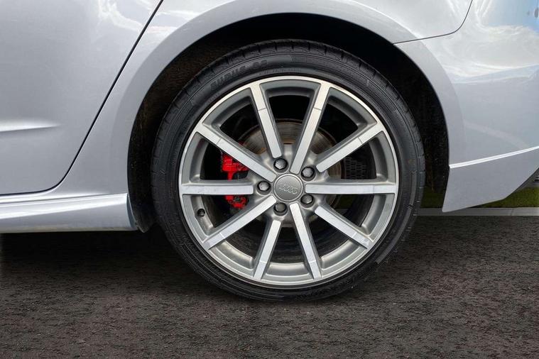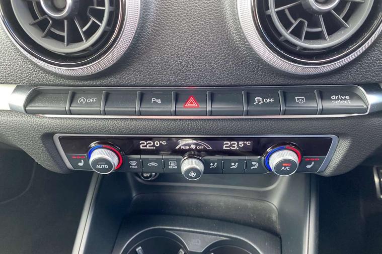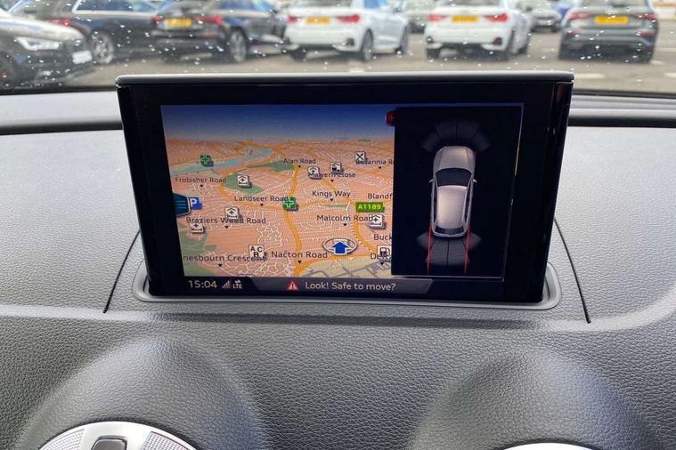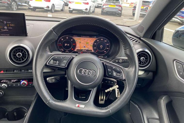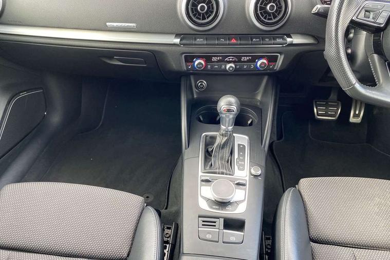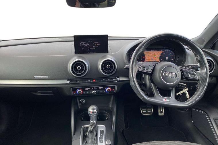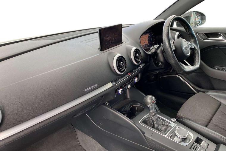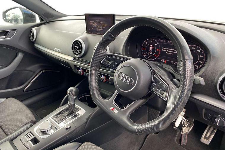 Aluminium air vent surrounds, Aluminium trim elements, Matt brushed aluminium inlays, Black styling pack - A3/S3, LED interior light pack - A3/RS3, Non smoking pack - A3, Storage and luggage pack - A3/RS3, 18" 10 spoke design alloy wheels in matt titanium look with diamond cut finish, Tyre repair kit, Anti theft alarm, Anti-theft wheel bolts, Remote control central locking, Thatcham category 1 alarm + immobiliser, 2 USB interfaces and Aux-In jack, Audi music interface, CD player, DAB Digital radio, MMI radio plus with 7" colour MMI screen and MMI controller, Online entertainment, 3 point seatbelts on all seats, ABS/EBD, Active bonnet, Active front headrests, Airbags - front driver/passenger, front & rear side, curtain, drivers knee, ASR, EDL, Electromechanical parking brake, ESC - Electronic Stability Control + traction control, Front passenger airbag deactivation, Hill hold assist, Manual rear child locks, Multi-Collision braking, Seatbelt warning, Tyre pressure warning, Warning triangle and first aid kit, Auto dimming interior rear view mirror, Body colour roof spoiler with aerodynamic inserts in high gloss black, Chrome exhaust tailpipes, Electric front windows, Electric rear windows, Electrically adjustable and heated door mirrors with integrated LED side indicators, Heated windscreen washer jets, LED daytime running lights, Light and rain sensors, Privacy glass - dark tinted rear and rear side windows from B-pillar backwards, Rear wiper, Sport specific side air inlet grille and diffuser insert, 3 adjustable rear headrests, 3 spoke leather multifunction sports steering wheel with paddle shift gear change controls, 60/40 split folding rear seat, Adjustable front centre armrest, Black cloth headlining, Dual zone electronic climate control, Front and rear interior lights with delay, Front/rear floor mats, Height and reach adjustable steering wheel, Illuminated door sill trims with S logo, Isofix child seat preparation for front passenger/outer rear seats inc passenger airbag deactivation including top tether, Lashing point in luggage compartment, Manual height adjustable front seats, Stainless steel pedals, Storage compartments in doors side trims, centre console and under front drivers seat, Tool kit, Audi drive select, Audi smartphone interface, Automatic start/stop system, Colour driver's information system display, Electro - mechanical power assisted steering, Mobile telephone preparation - bluetooth interface, SD card based MMI navigation, Service interval indicator, Speed limit display, Voice control system, Voice recognition for navigation system, Diesel particulate filter, Sports suspension,