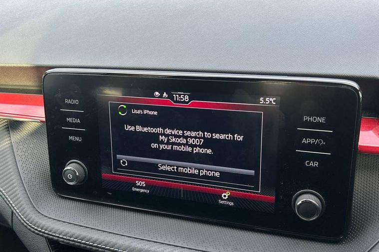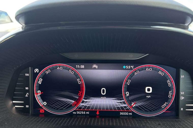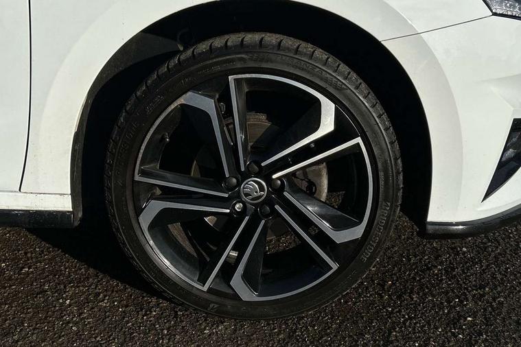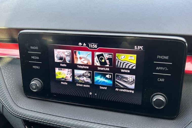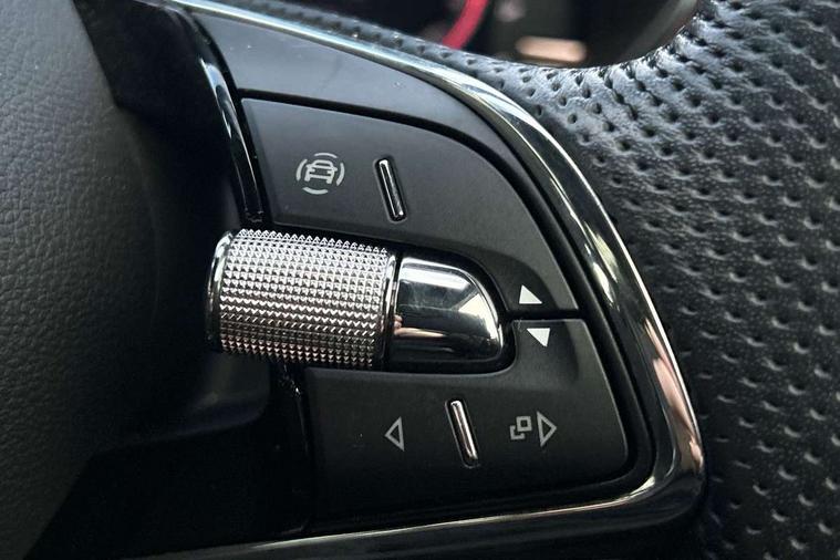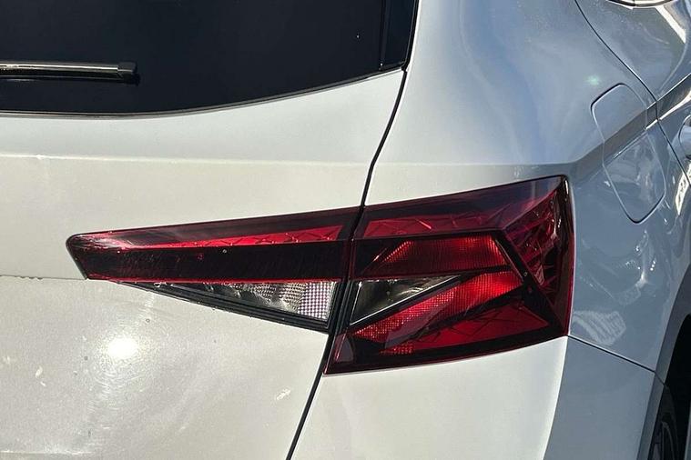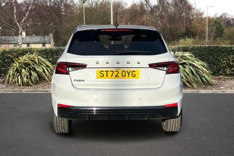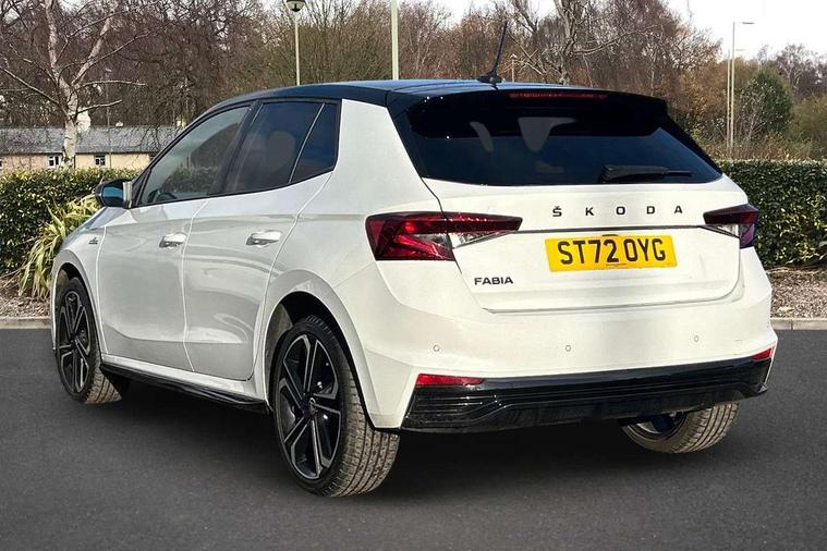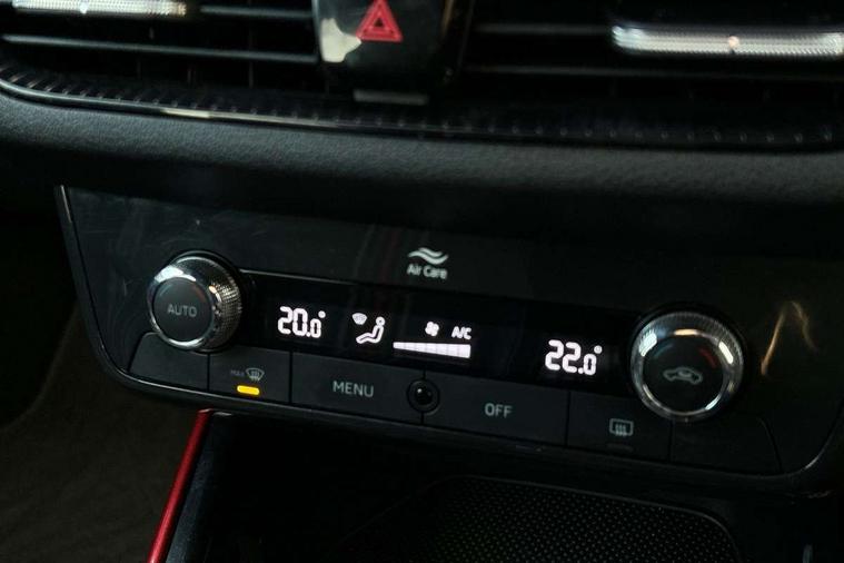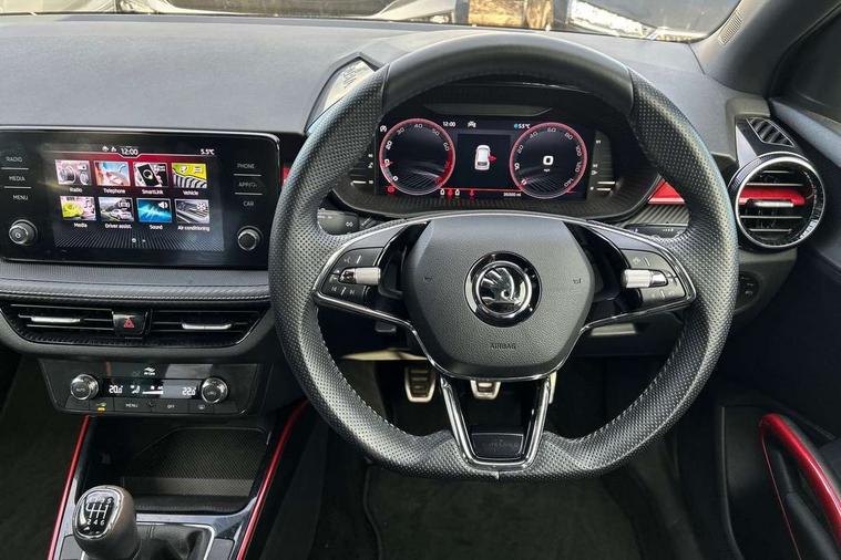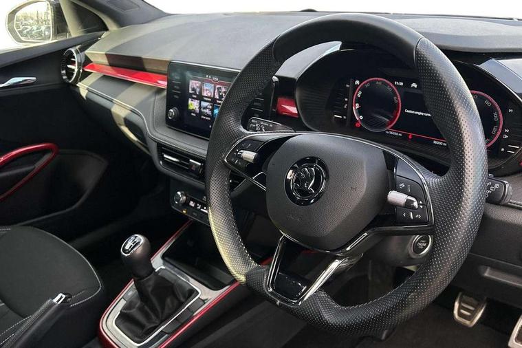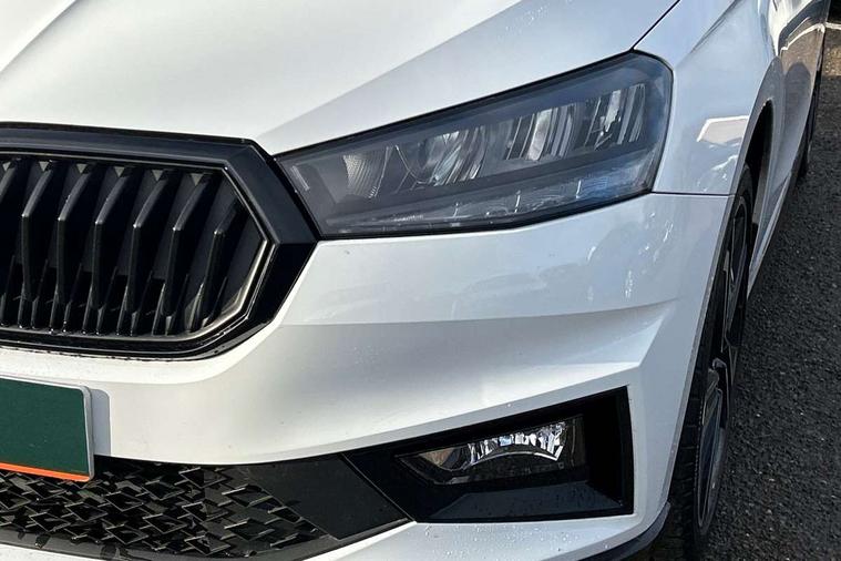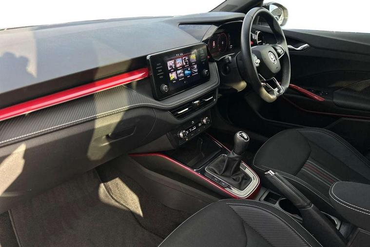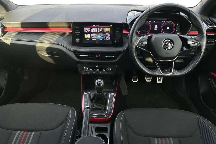 Carbon effect door and side trim panels, Carbon effect lower decorative trim with white stitching, Red metallic upper decorative trim, Ambient lighting pack 2 - Fabia Hatchback, Anti-theft wheel bolts protection, Super-low rolling resistance tyres, Anti-theft alarm system including immobiliser, interior monitoring, backup horn, and towing protection, 2x USB-C in the front (for data transmission and charging), 6 Speakers (4 in front and 2 in rear), Auxiliary socket for external MP3 player, Bolero radio with 8" colour display, DAB digital radio reception, 3-point height adjustable front seats belts with pretensioner and force limiter, Automatic warning lights in case of crash, Driver and passengers airbag with switch off function, e-Call+, ESC including ABS, MSR, ASR, EDS, HBA and XDS, Front and rear seat belt warning, FRONT ASSIST (AEB City and AEB Inter Urban), Front side airbags, Head airbags, One tone horn, Pedestrian protection, Three rear 3-points safety seat belts with pretensioner and force limiter including stop function for outer rear seat belts, Tyre pressure monitoring system, Auto dimming rear view mirror, Basic rear light, Black radiator grille, Body coloured bumpers, Door mirror integrated indicators, Electrically adjustable and heated door mirrors, Front and rear electric windows, Front window wiper intermittent control, Headlight range control - Automatic, Ice scraper in fuel cap, LED daytime running lights with coming and leaving home feature, Monte Carlo badging, Privacy glass, Rear LED fog light, Rear side wing doors, Rear window wiper with washing nozzles, Roof mounted spoiler, SKODA tailgate lettering in black, Sports bumpers, Third brake light, 3 rear headrests, Aluminium pedals, Backrest split and folding, Black headlining, Central console with removable cup holder and storage box, Chrome handbrake release button, Fabric/artificial leather upholstery, Front sports seats, Gearshift knob/handle in leather, Hand brake lever handle in leather, Height adjustable front headrests, Height adjustable steering wheel, ISOFIX and TopTether anchorage points to the outer rear seats, ISOFIX and TopTether on the front passenger seat, Luggage compartment lighting, Metallic painted red central console cover, Metallic red interior door handles, Monte Carlo door sills, Pollen filter, Rear seat bench unsplit, Single front passenger seat, Sun visors with mirror and airbag label on passenger side, Textile floor mats, Ticket holder, Umbrella in drivers door, Bluetooth connection, Driver alert system - DAS, Electromechanical power steering, Exterior temperature gauge, Service interval indicator,