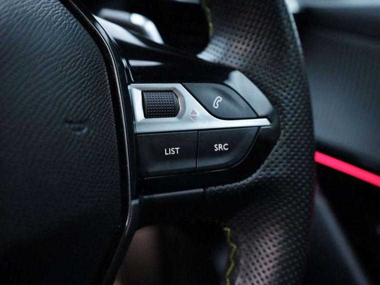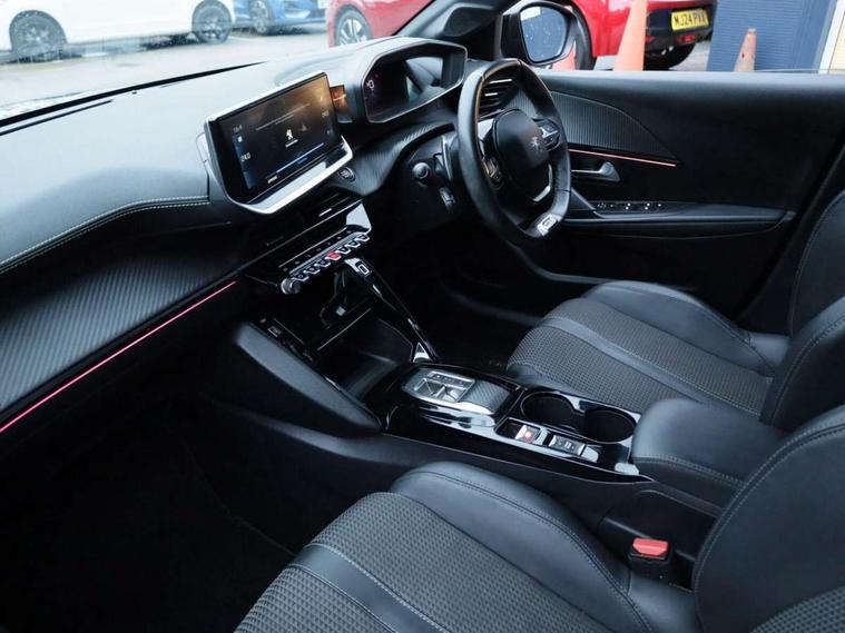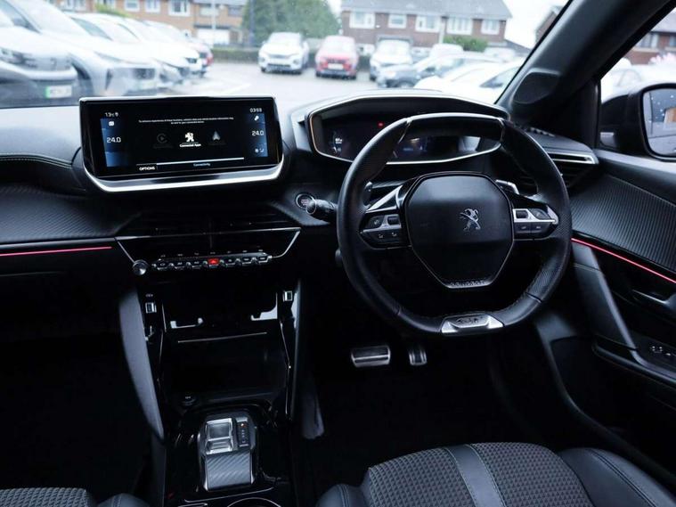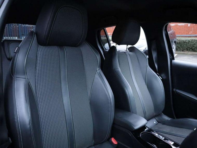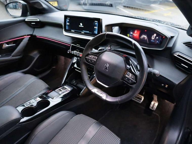 Carbon effect Dashboard, front and rear door panel finish, 17" Camden diamond cut two tone alloy wheels, Space saver spare wheel, Acoustic vehicle alert system (AVAS), Automatic door locking when moving off, Automatic hazard light activation upon heavy brake application, Deadlock, Electronic code immobiliser, Remote central locking, Thatcham cat. 1 alarm with anti lift sensor, 2 front USB socket with USB-C, 2x USB sockets in rear, 6 speakers radio with mp3 compatible, DAB Digital radio, Voice recognition for radio, navigation and telephony features, 3 rear 3 point seatbelts, ABS (Anti-lock Braking System) with EBD (Electronic Braking Distribution) and EBA (Emergency Braking Assistance), Active safety brake with night function/cyclists/pedestrians, Adaptive driver and front passenger airbags with passenger airbag deactivation function, Child locking functionality on rear doors, Driver/front passenger side airbags, Electric parking brake, ESP with Hill Assist, Front and rear curtain airbags, Front and rear disc brakes, Front optimised safety headrests and 3 x rear retractable headrests with height adjustable, Front three point retractable seatbelts with force limiters, Tyre pressure sensor, 2 X Rear number plate lights, Automatic lights, Automatic windscreen wipers, Body coloured exterior door handles, Dark tinted Rear side and tailgate windows, Diamond Black roof, Electric front windows + one touch + anti-pinch, Electric rear windows with one touch/anti-pinch, Electrically adjustable, heated and power folding door mirrors, Extended diamond black rear spoiler, Follow me home headlights, Frameless electrochrome interior rear view mirror, Full LED headlights with smartbeam assist, Gloss black finish on B pillar, Gloss black rear cluster connecting strip, Gloss black wheel arch extensions, Gloss black window surround, GT model designation badging on C pillar, GT model designation badging on tailgate, Headlights left on audible warning, LED daytime running lights with 3 claw headlight with distinctive tooth design, LED side indicator lights integrated into door mirrors, LED third brake light, Model designation badges front and rear, Nera black door mirror shells, Peugeot scuff plates, Radiator grille - Dark chrome chequered and gloss black edge trim, Rear bumper with gloss black finish, Rear full LED 3D peugeot signature claw effect lights with daylight function, Rear lower bumper diffuser effect trim in gloss black, Rear reversing lights, Rear side wing doors, Rear windscreen wiper triggered automatically in reverse gear, Roof mounted aerial with fin design, Roof spoiler, Tailgate with heated rear windscreen and wiper blade, Twin chrome exhaust tailpipes, Variable front intermittent wipers, 1/3 to 2/3 split folding rear seats, 12V socket, 3 seat bench in 2nd row, 8 Colour personalisable ambient lighting, Aluminium pedals and foot rest, Automatic air conditioning, Automatic gear lever in full grain leather and satin chrome, Driver and front passenger seat manual adjustment in longitudinal and back rest angle, Driver and front passenger seat mechanical height adjustment, Driver and front passenger sport seats, Electric power steering with reach and rake adjustable steering column, Front and rear carpet mats in black with lime green stitch detail, Front centre armrest with storage compartment, Front LED interior light with 2 reading spotlights and rear interior light with timer, High centre console with 2 cup holders, ISOFIX child seat mounting points on passenger seat, Lime green contrast stitching to armrest, front centre console, door panels and dashboard facia, Map pockets on the backs of the front seats, Mistral full grain perforated leather steering wheel with aikinite stitch detail and satin chrome 'GT' emblem, Paddle shifts, Piano keys gloss black plated toggle switches to access main functions of the vehicle, Piano keys gloss black plated toggle switches to access touchscreen functions, Push button finished in black with chrome circle, Rear centre headrest, Roof lining - Mistral black, Seatbelt unfastened on the move audible and visual alert for front and rear seats, Single front passenger seat, 10" Capacitive colour touchscreen with connected 3D navigation, Blind spot monitoring, Bluetooth telephone facility, Driver attention warning, e-Toggle driving selector, Exterior temperature indicator with ice warning, Mirror screen with mirror link, apple carplay and android auto, Multi function trip computer, Peugeot connect SOS and assistance, PEUGEOT i-Cockpit with compact steering wheel, PEUGEOT i-Cockpit with configurable 3D headup instrument panel, Push button start, Smart phone docking station, Speed limit recognition and recommendation, Start/stop system, Visio park assist 180 with colour reversing camera + front and rear parking sensor,