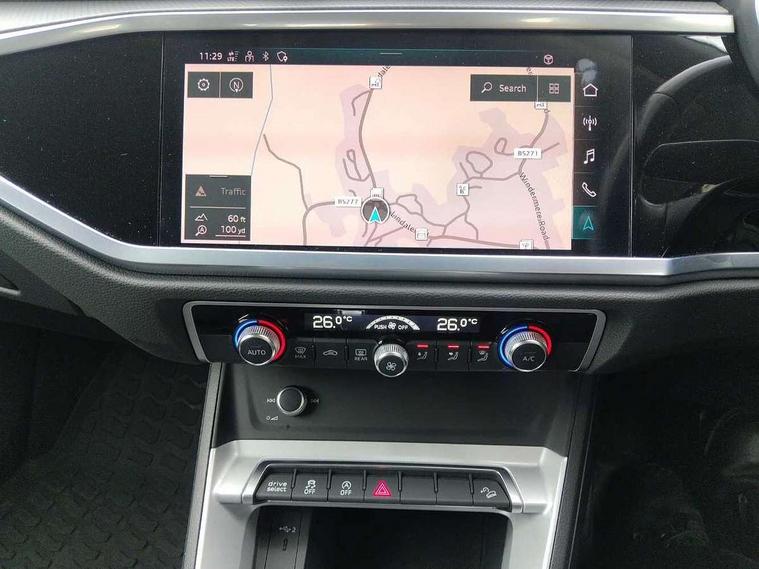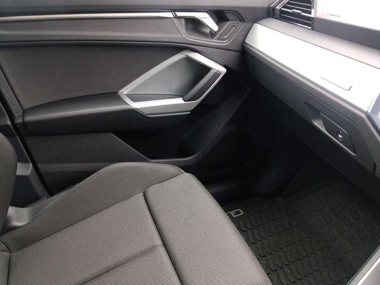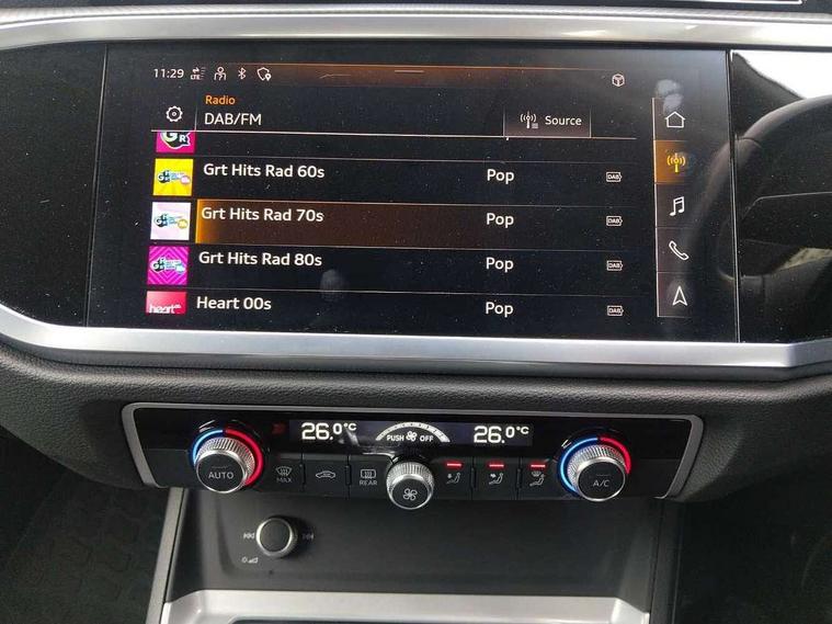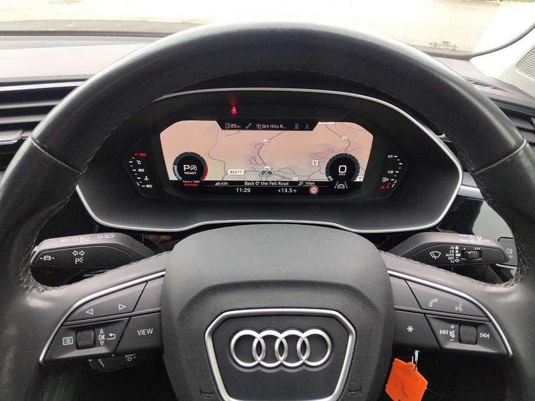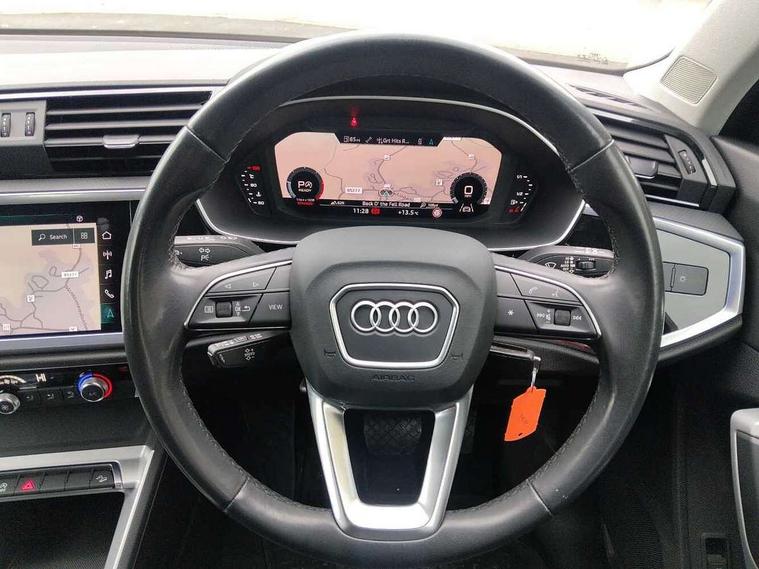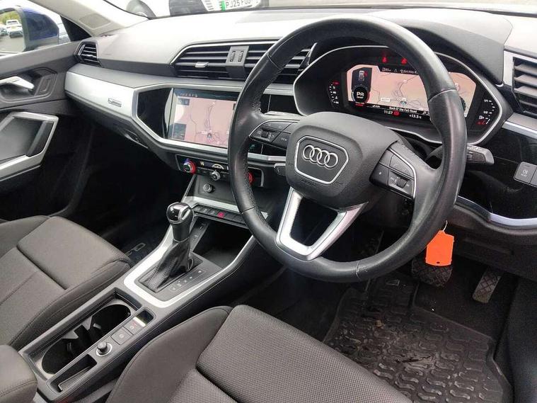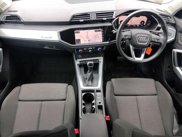 Micrometallic silver inlay, MMI touch colour display in glass look, black with surround in aluminium look, Non smoking pack - Q3, Anti theft alarm, Anti theft wheel bolts, Audi pre-sense front with pedestrain and cyclist recognition, Immobiliser, Remote central locking, 2 USB-C ports with charge and data functions, 6 passive loudspeakers, DAB digital radio module, 3x3 point rear seatbelts, 6 airbags - Driver, front passenger, curtain and side windows, Electromechanical parking brake, Electronic stabilisation control including ABS, ASR and EDL, Front seatbelt reminder, Hill descent control, Hill hold assist, Manual child lock in rear doors, Pre sense basic, Seatbelt monitoring, Tyre pressure warning, Warning triangle and first aid kit, Acoustic windscreen, Aluminium roof rails, Aluminium window trim, Auto dimming frameless rear view mirror, Body coloured bumpers, Electrically folding, adjustable and heated door mirrors with integrated LED side indicators and kerb view function for passenger side, Front and rear electric windows, Front fog lights, Front side air inlets in matt selenite silver, Front spoiler in matt selenite silver, Grille vertical bars in aluminium silver/Matt, High gloss black finish B and C pillars, LED headlights with LED daytime running lights, LED rear lights, LED third brake light, Rain and light sensors, Rear diffuser strip in matt selenite silver, Rear side wing doors, Rear wiper, Titanium black radiator grille, Variable front intermittent wipers, 12V socket in rear centre console, 3 seat bench in 2nd row, 3 spoke multi-function leather steering wheel, 40:20:40 folding with manual adjustment for 60:40 forwards/backwards position and backrest angle, Door sill trims with aluminium inlay, Dual zone electronic climate control, Front and rear floor mats, Front and rear headrests, Front and rear roof module including reading lights, Front centre armrest, Glove compartment lighting, Height and reach adjustable steering wheel, ISOFIX child seat mounting for front passenger with airbag deactivation and outer rear seat including top tether attachment point for outer rear seats, Luggage compartment light, Lunar silver cloth headlining, Manual front seats with height adjustment, Single front passenger seat, Stainless steel luggage compartment sill finisher, Amazon alexa Integration, Audi drive select, Audi lane departure warning, Audi smartphone interface includes wireless Apple carplay/Android Auto, Audi Virtual Cockpit - 10.25" display, Bluetooth interface, Camera based traffic sign recognition, Legal emergency call, MMI Navigation Plus with high resolution 10.1 inch touchscreen colour display, Power operated tailgate, Progressive steering, Service interval indicator, Start stop system with recuperation, Voice control system with natural language interaction, Diesel particulate filter, Standard suspension,