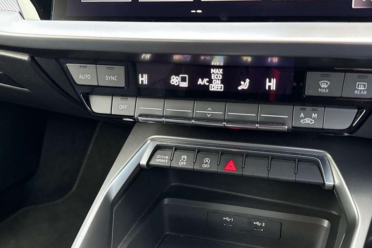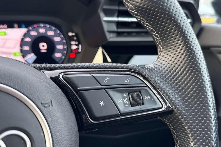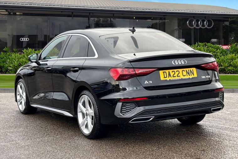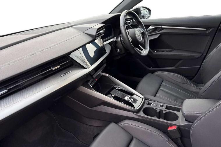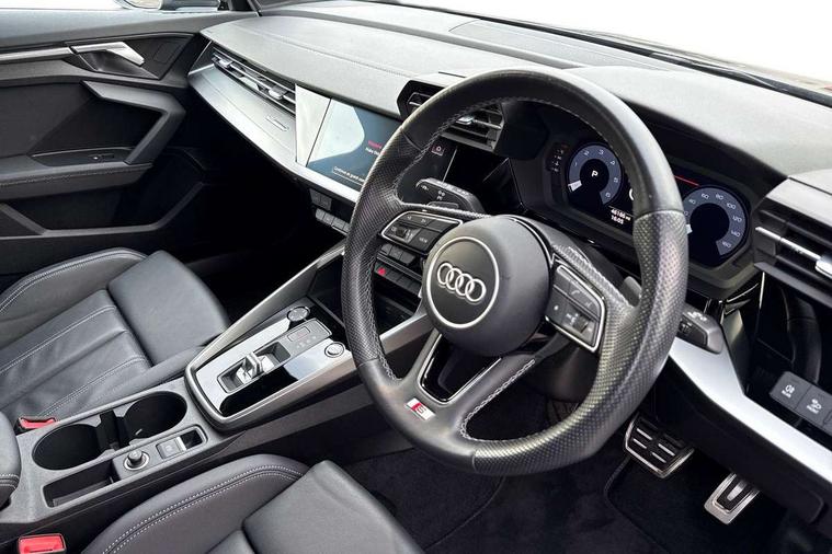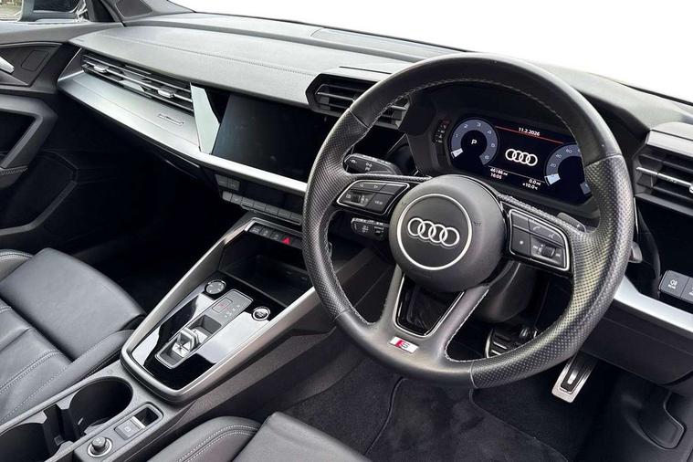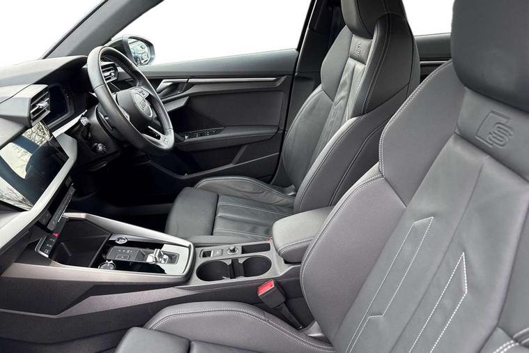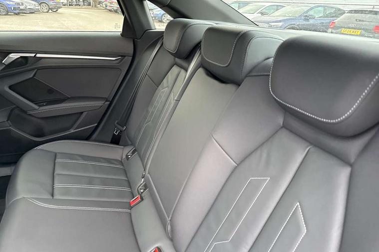 Aluminium air vent surrounds, Aluminium trim elements, Dark spectrum aluminium inlays, accent surfaces in the dashboard and centre console in platinum grey silk effect paint finish, Aluminium interior elements pack - A3 Saloon, S line styling pack - A3 Saloon, Anti theft alarm, Anti-theft wheel bolts, Immobiliser, Manual child locks, Remote control central locking, 2x USB Type C ports (for charging and data transfer), 6 passive loudspeakers, CD player, DAB Digital radio, 3x3 point rear seat belts, Driver and front passenger airbag with passenger airbag deactivation, Electronic Stabilisation Control (ESC) including ABS, ASR and EDL, First aid kit with warning triangle and 2 safety vests, Front side airbags with head airbags and interaction airbag, Hill hold assist, Pre-sense front with pedestrian and cyclist detection, Seatbelt monitoring, Tyre pressure loss indicator, 3rd brake light, Acoustic glass windscreen, Aluminium window trim, Auto dimming frameless rear view mirror, Electrically adjustable/heated/folding/dimming door mirrors with kerb view includes integrated LED indications + kerb view function for passenger side, Front electric windows, Illuminated door sills with aluminium inserts at the front with S logo, LED daytime running lights, LED headlights with LED rear lights and dynamic rear indicators, Light and rain sensors, Model and engine designation badges at rear, Privacy glass - dark tinted rear window, rear door and side windows, Rear boot, Rear electric windows, Rear side wing doors, S line bumpers, S roof spoiler, 12V socket and storage compartment in front centre console, 3 seat bench in 2nd row, 40/20/40 split folding rear seat bench with cupholder, Black cloth headlining, Dual zone electronic climate control, Front and rear centre armrest in leather, Front and rear headrests, Front/rear floor mats, Height and reach adjustable steering wheel, Illuminated vanity mirror, Interior lighting - glove compartment light and right hand side, Luggage compartment floor covering, Manual boot compartment lid, Manually adjustable front sport seats, Seat side bolsters, Single front passenger seat, Stainless steel pedals and front footrest in black, Twin leather upholstery with front sports seats S embossed logo, Audi connect emergency call and service, Audi drive select (Auto, Comfort, Dynamic, Efficiency and Individual), Audi smartphone interface, Audi Virtual Cockpit - 10.25" digital and colour instrument cluster, Automatic start/stop system with recuperation, Bluetooth interface, Collision avoidance assistant, Electromechanical power speed sensitive steering, Lane departure warning system, MMI Navigation Plus with high resolution 10.1" colour touch screen display, Service indicator, Voice control system with natural language interaction, Diesel particulate filter,