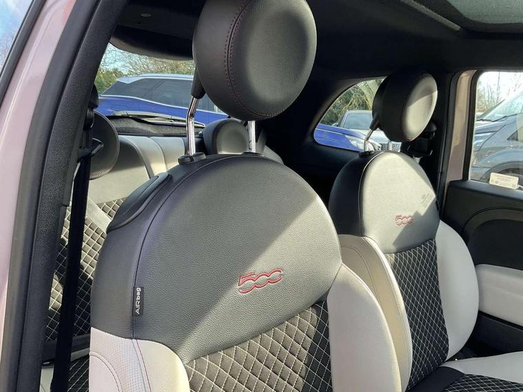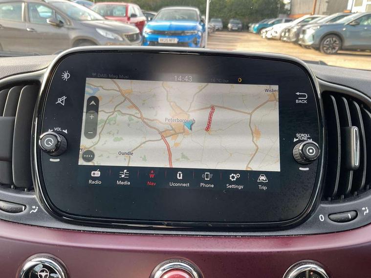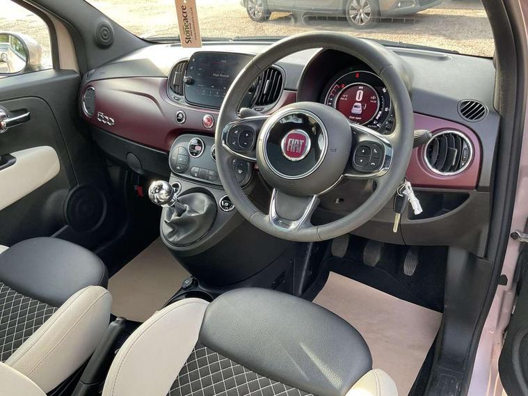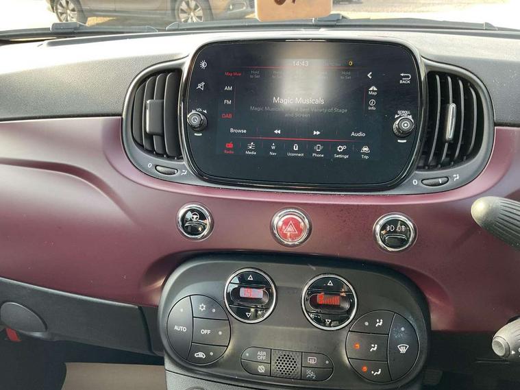 Matt white dashboard, Chrome pack - 500, Automatic door locking, Immobiliser, Locking fuel filler cap, Remote central locking, Rear speakers, 7 airbags - Driver, passenger, side, window and drivers knee airbags, ABS/EBD, Curtain airbags, ESC + ASR/MSR + HBA + Hill holder, Traction control, Tyre pressure monitoring system, Body colour bumpers, Chrome plated exterior door handles, Electric front windows, Front fog lights, Heat insulated glass, Heated rear windows with wash wipe, LED daytime running lights, 1 passenger grab handle, 50/50 split folding rear seats with height adjustable rear headrests, Auto climate control, Auxilliary 12V power socket, Front headrests, Height adjustable drivers seat, Height adjustable steering wheel, Isofix child seat preparation, Techno leather steering wheel with audio controls, 7" HD Touchscreen Radio with 3D Navigation, Bluetooth, USB, and DAB, 7" TFT instrument cluster, Apple car play/Android Auto, Cruise control, External temperature gauge, Power assist steering, Rear parking sensor, Speed limiter, Stop/start system, Trip computer,