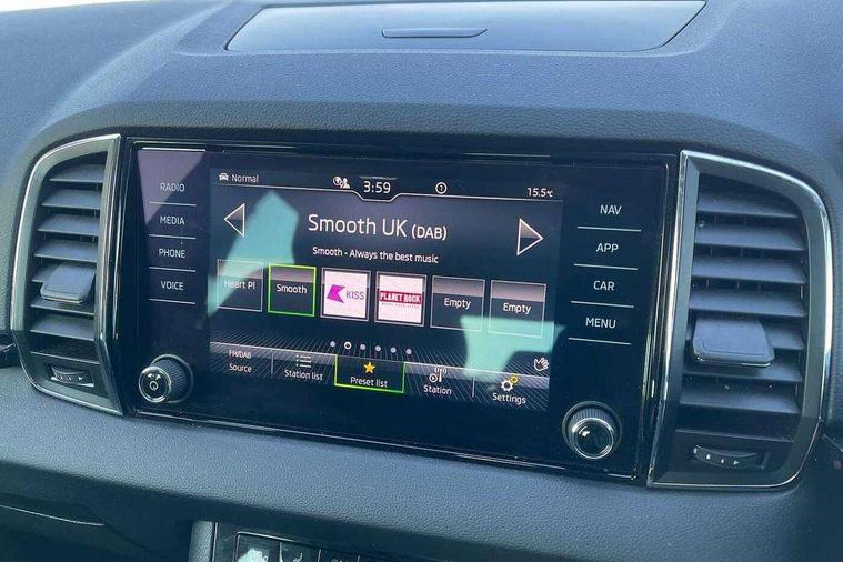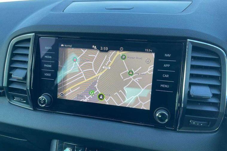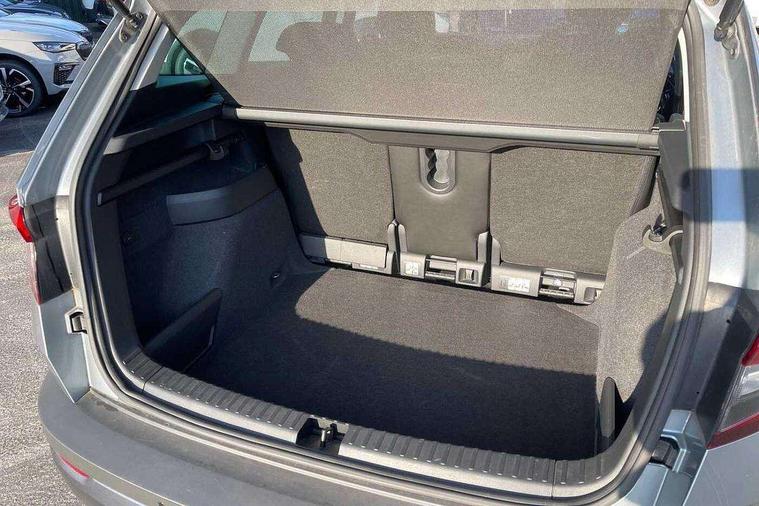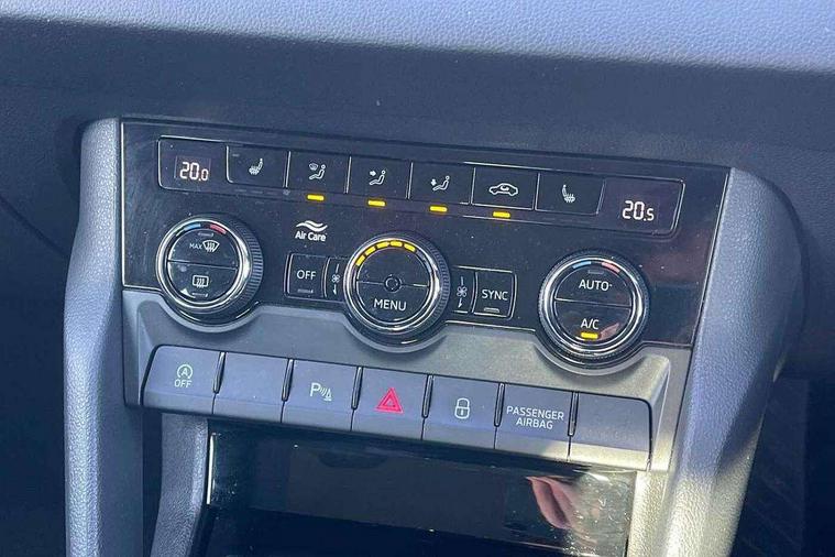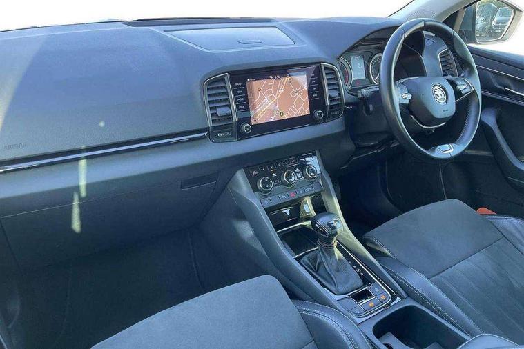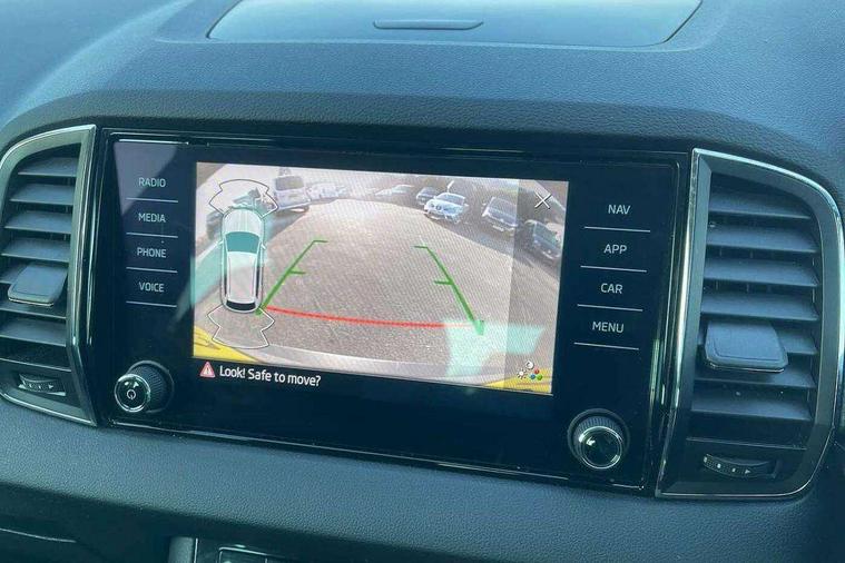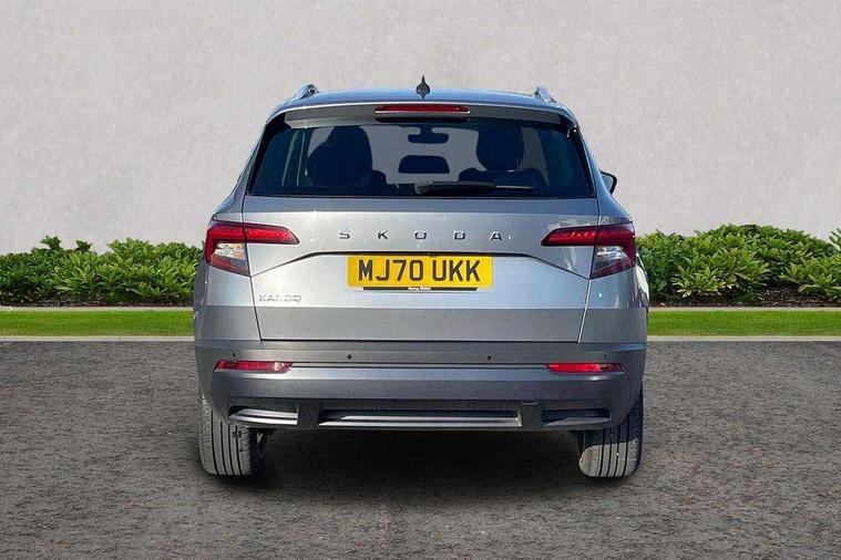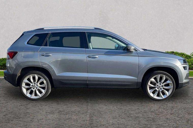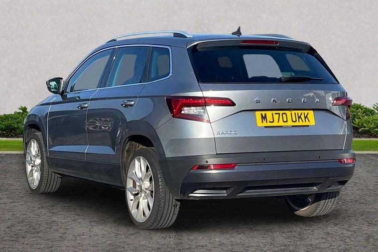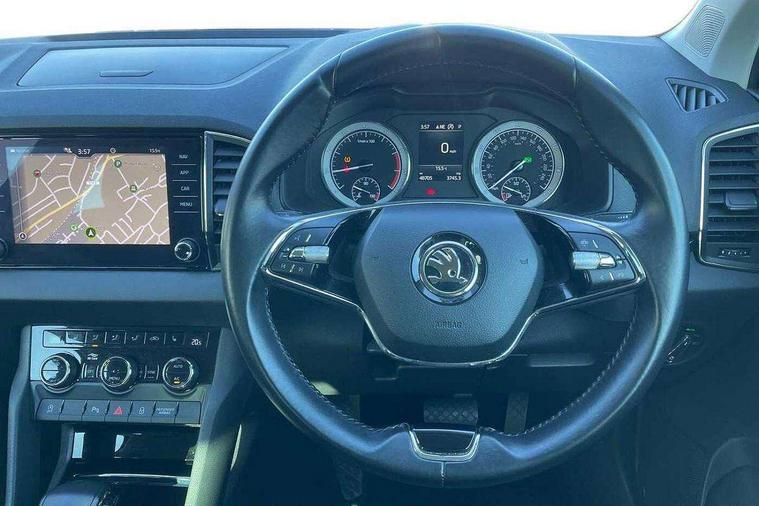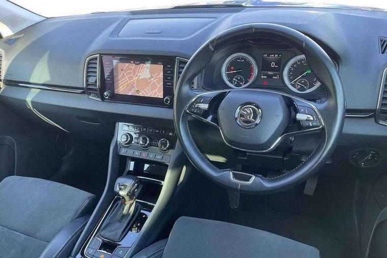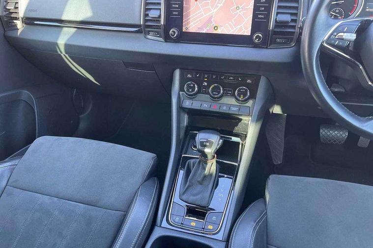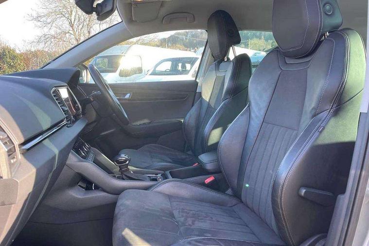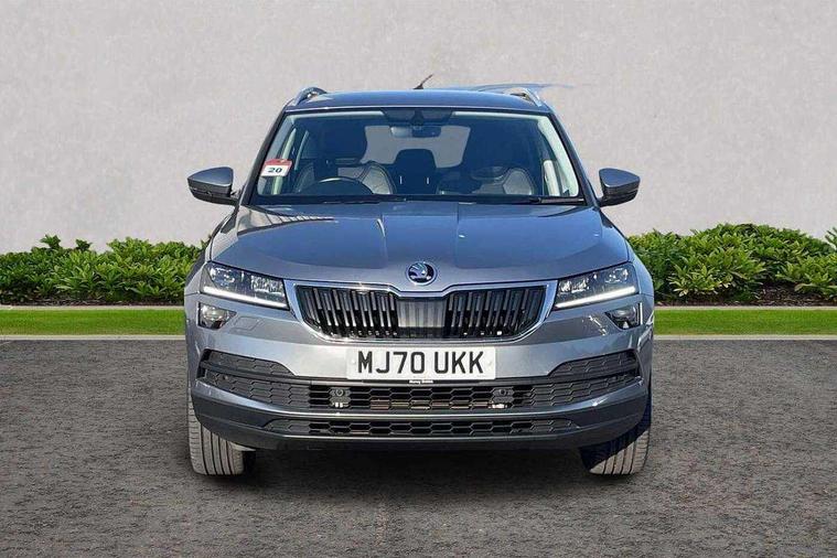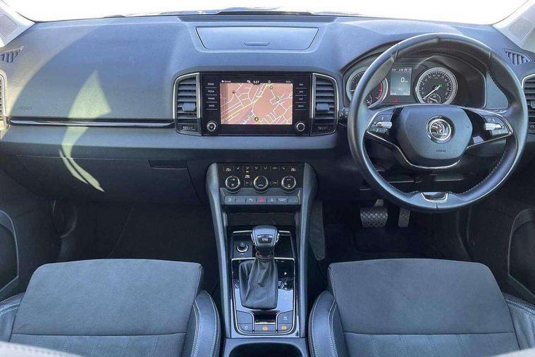 Chrome framed air vents, Chrome roof rails + chrome pack - Karoq, 19" Crater alloy wheels with anti theft wheel bolts, Storage on wheel cover, Alarm with interior monitoring, back up horn and tilt sensor with safe function, Electronic engine immobiliser, Keyless entry and keyless start with safe system, Remote central locking with 2 remote folding keys, DAB radio with Bluetooth, SD card slot, USB connection, Airbags - Front side, head, knee and curtain, Automatic door unlocking in case of crash, Automatic fuel cut off in case of crash, Driver airbag, Electronic parking brake with auto hold function, Emergency rear braking signal, ESC including ABS, MSR, ASR, EDS, HBA, DSR, RBS, MKB and traction control, Front assist radar scanning of the space in front of the car with automatic braking, Hill hold control, Passenger airbag with switch-off function, Pedestrian monitor, Three point seatbelts rear, Two tone horn, Tyre pressure display, Tyre pressure monitor, Acoustic glass, Aero front windscreen wipers with intermittent function, Automatic headlight control system, Black electric window control buttons, Body colour door mirrors and handles, Body coloured bumpers, Electric front and rear windows with child proof lock, Full LED headlights + adaptive front light system + LED daytime running lights and front cornering fog lights, Headlight washers, Heated rear windscreen, LED rear lights with high functionality, Light assistant (coming/leaving home/tunnel light), Privacy glass, Safety reflectors on front doors, Third brake light, 1.5 litre bottle holders in driver and front passenger door panels, 12V socket in boot, 12v socket in front centre armrest with storage compartment and rear air vents, 2 Folding hooks and nets in boot, 2 Front readings lights for driver and passenger, 3 rear height adjustable headrests, 4 foldable roof handles with rear coat hooks, 4 lashing points on luggage floor, Backrest release, Cargo elements in boot, Chrome inner door handles, Folding tables on the front seat backrests, Front head restraints, Front seat and rear pockets, Height adjustable front three point seats belts with tensioners, Height adjustable passenger seat, Height/reach adjust steering wheel, Ice scraper, Illuminated and cooled glovebox, Illuminated luggage compartment, Isofix child seat preparation outer rear, Net programme in boot, Pen holder, Pollen filter, Rear boot cover, Rear reading lights, Rear seats fixed folding and divided 60:40, Retractable parcel shelf attachable to tailgate, Safety vest holder, Seatbelt reminder signalisation and pretensioner for all seats, Storage box in upper central dashboard closed, Storage compartment below the passenger seat, Sunvisors with illuminated vanity mirrors, Textile floor mats, Umbrella under passenger seat, VarioFlex seats with retractable parcel shelf, Care connect, Drive mode selector, Driver alert system, Driver fatigue sensor, Driver profile selection, Multifunction colour trip computer, Outside temperature gauge, Rear view camera, Service interval indicator, SmartLink + wireless for Apple and wired for Android, Start/stop system with regenerative braking, USB C Port x 2 in front centre console,