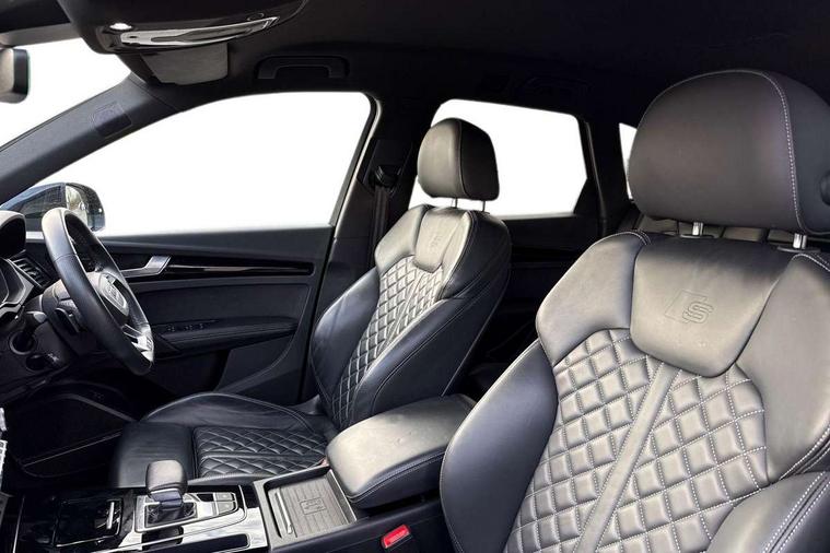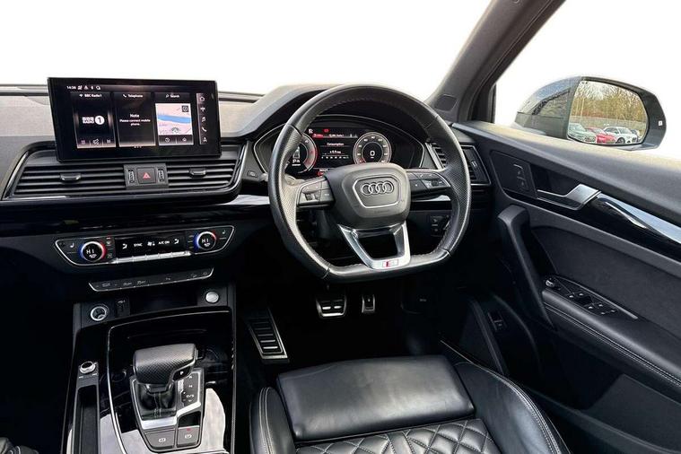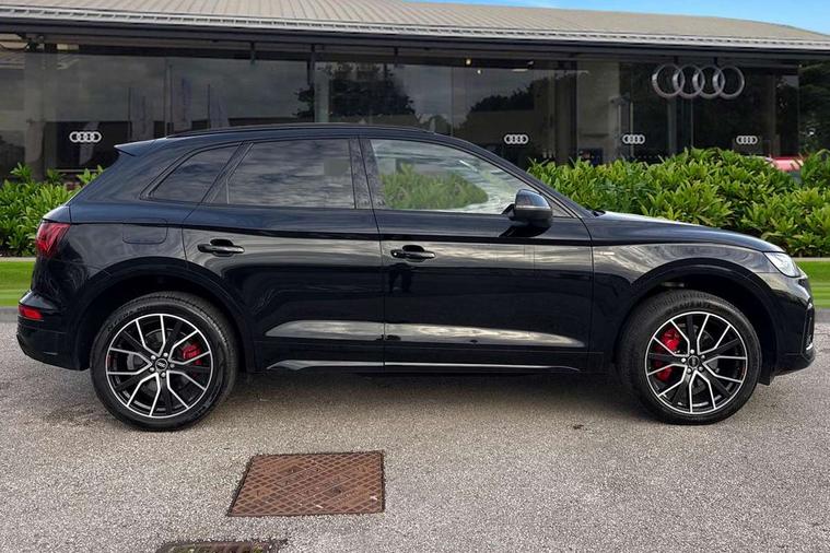 Piano black finish inlay, Black styling package - Q5 Edition 1, Extended interior upholstery pack - Q5, Extended LED Interior multi coloured Lighting Pack - Q5, Anti theft alarm, Anti-theft wheel bolts, Keyless Go access/ignition system, DAB Digital radio, 3 point seatbelts on all seats, 6 airbags - Driver, front passenger, curtain and side airbags, Electrically operated child locks on rear doors, Electromechanical parking brake, Electronic stabilisation control including ABS, ASR and EDL, Front and rear brake calipers painted in red, Front passenger airbag deactivation, Hill descent control, Hill hold assist, Multi collision brake assist, Pop-up bonnet for pedestrian protection, Pre sense city, Seat belt force limiter, Seatbelt monitoring, Tyre pressure warning, Warning triangle and first aid kit, Acoustic windscreen, Audi beam with Audi rings logo, Audi matrix LED headlights with dynamic front and rear indicators, Audi rings at front and rear in black, Audi rings decal on rear doors, Auto dimming rear view mirror, Automatic headlights and windscreen wipers, Black door mirrors, Black roof rails, Body colour bumpers, Body colour underbody protection, Chrome plated exhaust trims, Door sills in Selenite silver, Electric adjustable/heated/folding door mirrors, Front air inlet surrounds in titanium black, Front and rear electric windows, Headlight washers, High gloss black B pillar trims and triangular rear door trim, Rear chrome trim strip below lights, Rear privacy glass and rear side windows, Rear spoiler, Rear wiper, Roof bars, Without model and engine badging at rear, 2 x USB charging port with aux input socket, 3 rear headrests, 4 way electric lumbar support for driver and front passenger, 40:20:40 split folding rear seat with rear centre armrest, Black cloth headlining, Comfort front centre armrest, Contrast stitching on seats, steering wheel and gear lever gaiter, Deluxe 3 zone electronic climate control, Electrically adjustable front seats, Fine Nappa leather upholstery with diamond pattern contrast stitching + front sport seats with S embossed logo, Front/rear floor mats, Gear lever in black leather, Heated front seats, Height adjustable front head restraints, Height/reach adjustable steering column, Illuminated door sill trims with S logo, ISOFIX child seat mounting and top tether, Luggage compartment cover, Rear seat bench plus, Removable luggage compartment floor, Stainless steel pedals, Sunvisors with vanity mirrors, Audi connect safety and service (e-call), Audi connect with Amazon Alexa Integration, Audi drive select, Audi virtual cockpit plus with 12.3" screen and three different layout designs, Audi wireless smartphone interface, Automatic start-stop system with coasting functionality and efficiency programme, Bluetooth interface, Electro - mechanical power assisted steering, MMI navigation plus with 10.1" touch screen, Power tailgate, Reversing camera, Service interval indicator, Voice control system with Audi hotword activation "Hey Audi", Diesel particulate filter, Quattro on demand, S line sports suspension,