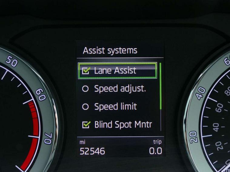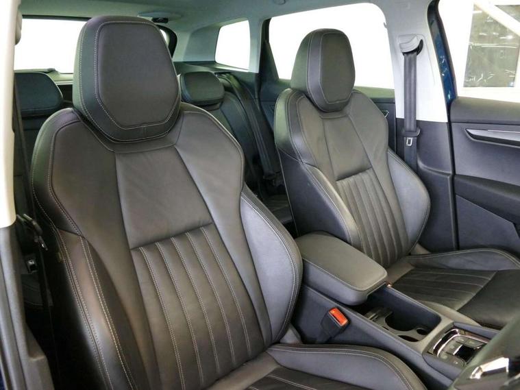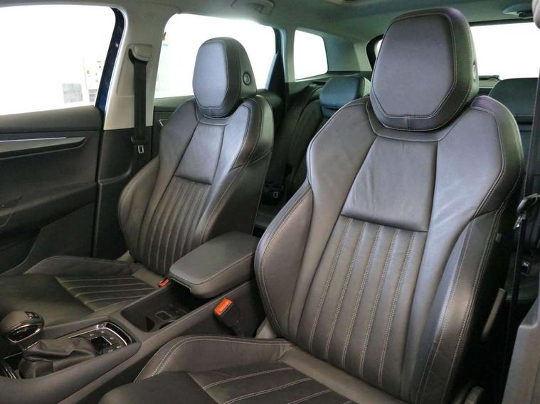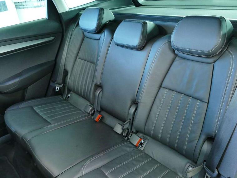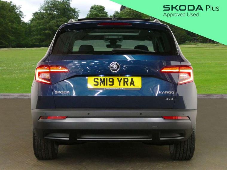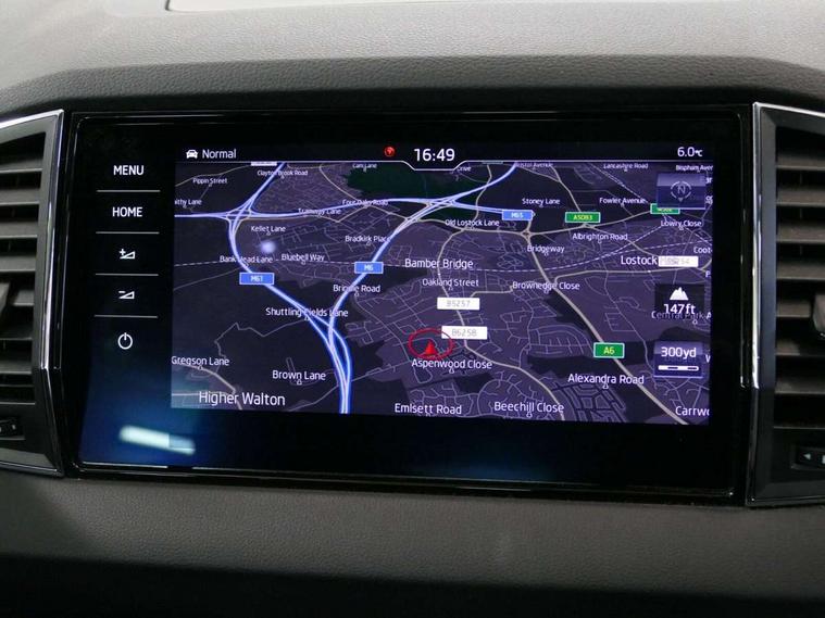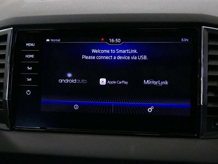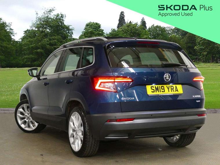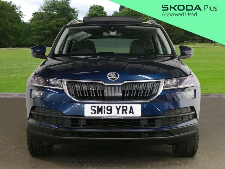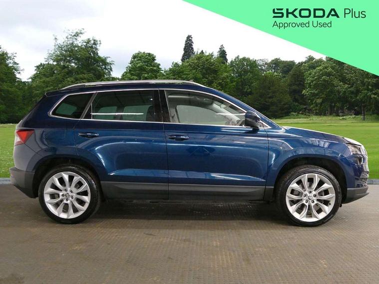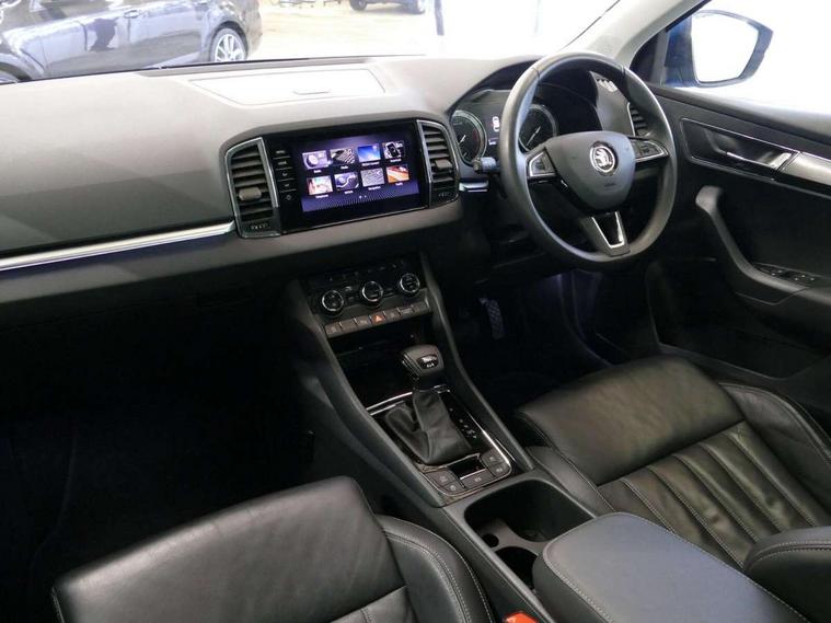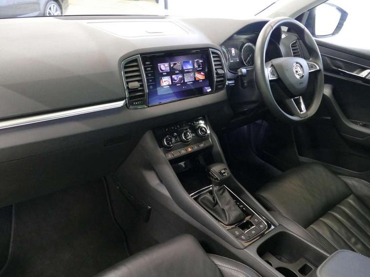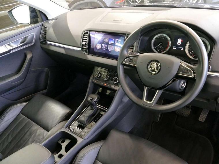 Chrome framed air vents, LED Interior lighting pack with Skoda welcome logo - Karoq, 19" Crater silver alloy wheels with anti theft wheel bolts, Storage on wheel cover, Alarm with interior monitoring, back up horn and tilt sensor with safe function, Electronic engine immobiliser, Keyless entry and keyless start with safe system, Remote central locking with 2 remote folding keys, DAB radio with Bluetooth, SD card slot, USB connection, Airbags - Front side, head, knee and curtain, Automatic door unlocking in case of crash, Automatic fuel cut off in case of crash, Driver airbag, Electronic parking brake with auto hold function, Emergency rear braking signal, ESC including ABS, MSR, ASR, EDS, HBA, DSR, RBS, MKB and traction control, Front assist radar scanning of the space in front of the car with automatic braking, Hill hold control, Passenger airbag with switch-off function, Pedestrian monitor, Seatbelt reminder signalisation and pretensioner for all seats, Three point seatbelts rear, Two tone horn, Tyre pressure display, Tyre pressure monitor, Acoustic glass, Aero front windscreen wipers with intermittent function, Automatic headlight control system, Body colour door handles, Body coloured bumpers, Chrome outside aluminium bar around the window, Chrome roof rails, Full LED headlights + adaptive front light system + LED daytime running lights and front cornering fog lights, Headlight washers, Heated rear windscreen, LED rear lights with high functionality, Light assistant (coming/leaving home/tunnel light), Panoramic sliding sunroof, Privacy glass, Safety reflectors on front doors, Silver door mirrors, Third brake light, 1.5 litre bottle holders in driver and front passenger door panels, 12V socket in boot, 12v socket in front centre armrest with storage compartment and rear air vents, 2 Folding hooks and nets in boot, 2 Front readings lights for driver and passenger, 3 rear height adjustable headrests, 4 foldable roof handles with rear coat hooks, 4 lashing points on luggage floor, Backrest release, Cargo elements in boot, Chrome inner door handles, Dual zone climate control, Electrically adjustable driver's seat with memory function includes lumbar support + heated folding door mirrors with auto dimming and boarding spots, Folding tables on the front seat backrests, Front seat and rear pockets, Height adjustable front three point seats belts with tensioners, Height adjustable passenger seat, Height/reach adjust steering wheel, Ice scraper, Illuminated and cooled glovebox, Illuminated luggage compartment, Isofix child seat preparation outer rear, Leather upholstery, Manual lumbar support for front passenger seat, Net programme in boot, Pen holder, Pollen filter, Rear boot cover, Rear reading lights, Rear seats fixed folding and divided 60:40, Removable LED torch in the boot, Retractable parcel shelf attachable to tailgate, Safety vest holder, Storage box in upper central dashboard closed, Storage compartment below the passenger seat, Storage net on centre console passenger side, Sunvisors with illuminated vanity mirrors, Textile floor mats, Umbrella under passenger seat, VarioFlex seats with retractable parcel shelf, Columbus satellite navigation with 9.2" touchscreen display, integrated Wi-Fi, gesture control and WLAN, Driver alert system, Driver fatigue sensor, Driver profile selection, Electro-mechanical PAS, Front and rear parking sensors, Multifunction colour trip computer, Outside temperature gauge, Rear cross traffic alert, Rear view camera, Service interval indicator, Start/stop system with regenerative braking, Traffic sign recognition, Diesel particulate filter,