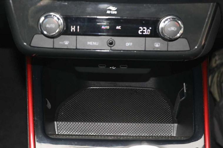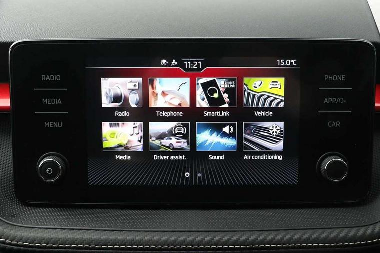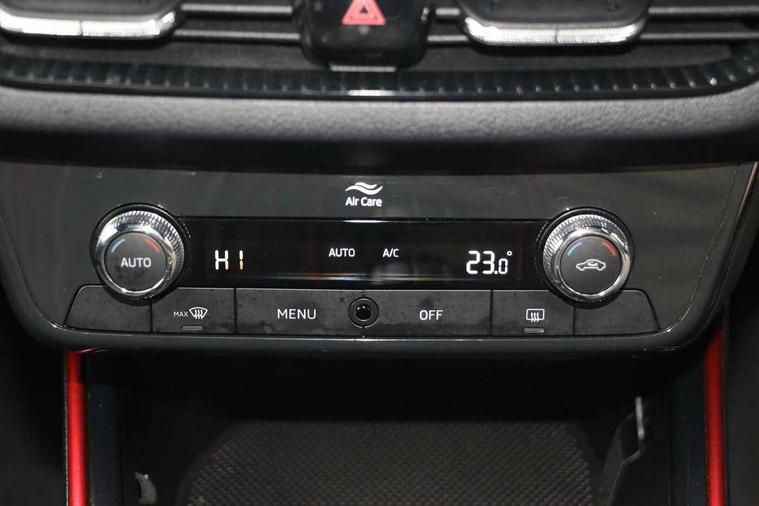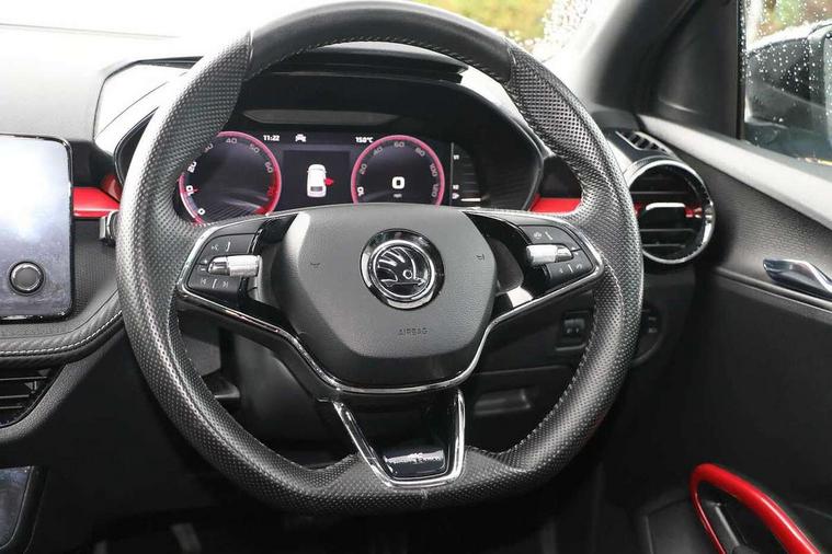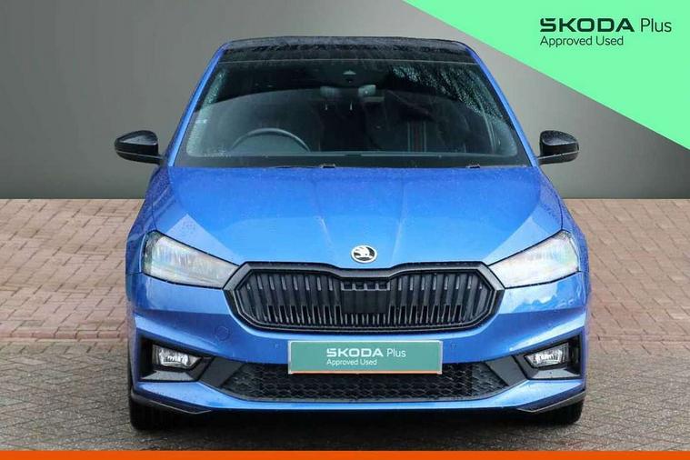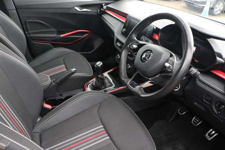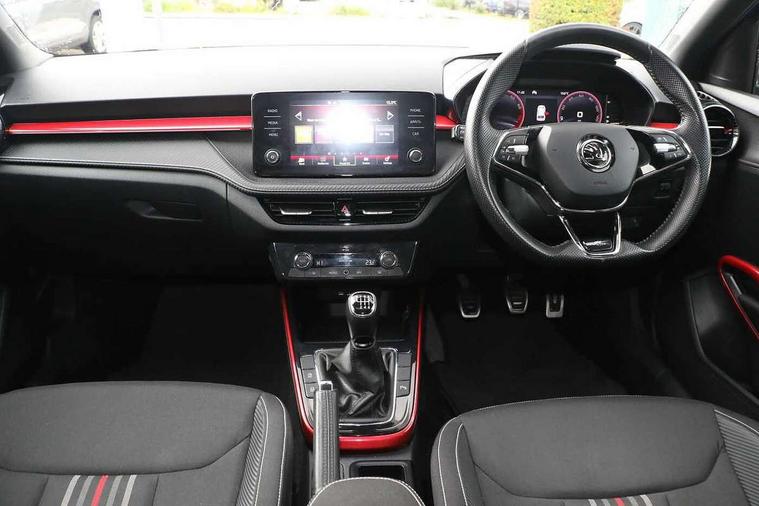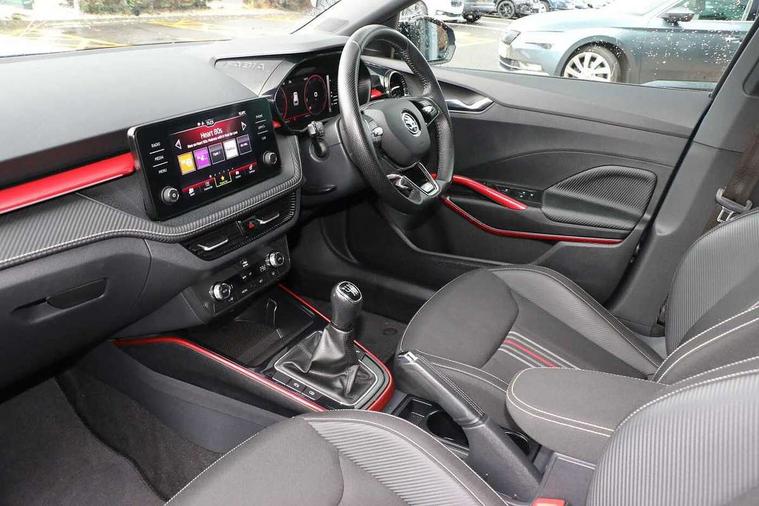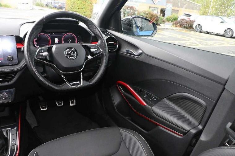 Carbon effect door and side trim panels, Carbon effect lower decorative trim with white stitching, Red metallic upper decorative trim, Ambient lighting pack 2 - Fabia Hatchback, Anti-theft wheel bolts protection, Super-low rolling resistance tyres, Anti-theft alarm system including immobiliser, interior monitoring, backup horn, and towing protection, 2x USB-C in the front (for data transmission and charging), 6 Speakers (4 in front and 2 in rear), Auxiliary socket for external MP3 player, Bolero radio with 8" colour display, DAB digital radio reception, 3-point height adjustable front seats belts with pretensioner and force limiter, Automatic warning lights in case of crash, Driver and passengers airbag with switch off function, e-Call+, ESC including ABS, MSR, ASR, EDS, HBA and XDS, Front and rear seat belt warning, FRONT ASSIST (AEB City and AEB Inter Urban), Front side airbags, Head airbags, One tone horn, Pedestrian protection, Three rear 3-points safety seat belts with pretensioner and force limiter including stop function for outer rear seat belts, Tyre pressure monitoring system, Auto dimming rear view mirror, Basic rear light, Black radiator grille, Body coloured bumpers, Door mirror integrated indicators, Electrically adjustable and heated door mirrors, Front and rear electric windows, Front window wiper intermittent control, Headlight range control - Automatic, Ice scraper in fuel cap, LED daytime running lights with coming and leaving home feature, Monte Carlo badging, Privacy glass, Rear LED fog light, Rear side wing doors, Rear window wiper with washing nozzles, Roof mounted spoiler, SKODA tailgate lettering in black, Sports bumpers, Third brake light, 3 rear headrests, Aluminium pedals, Backrest split and folding, Black headlining, Central console with removable cup holder and storage box, Chrome handbrake release button, Fabric/artificial leather upholstery, Front sports seats, Gearshift knob/handle in leather, Hand brake lever handle in leather, Height adjustable front headrests, Height adjustable steering wheel, ISOFIX and TopTether anchorage points to the outer rear seats, ISOFIX and TopTether on the front passenger seat, Luggage compartment lighting, Metallic painted red central console cover, Metallic red interior door handles, Monte Carlo door sills, Pollen filter, Rear seat bench unsplit, Single front passenger seat, Sun visors with mirror and airbag label on passenger side, Textile floor mats, Ticket holder, Umbrella in drivers door, Bluetooth connection, Driver alert system - DAS, Electromechanical power steering, Exterior temperature gauge, Service interval indicator,