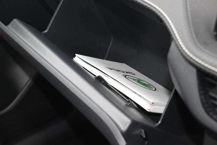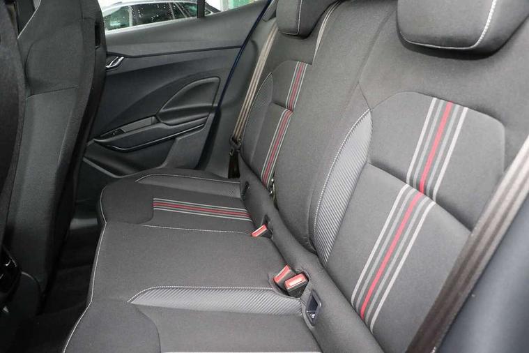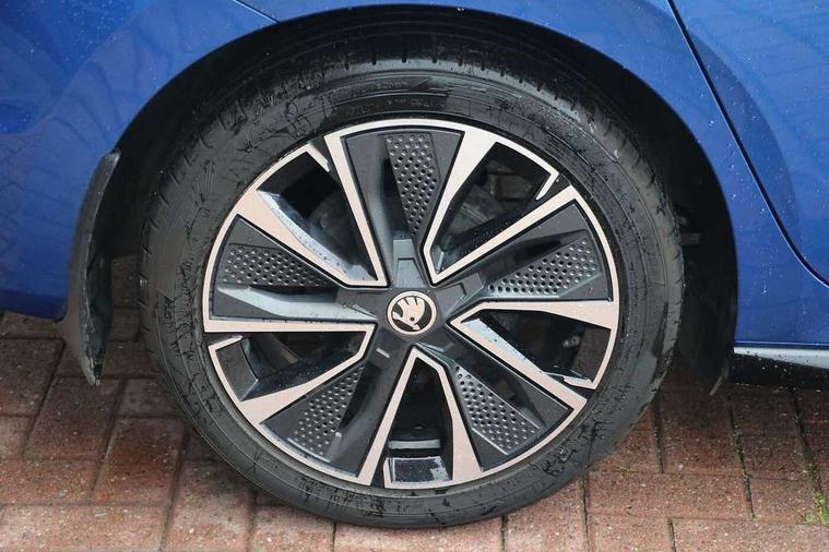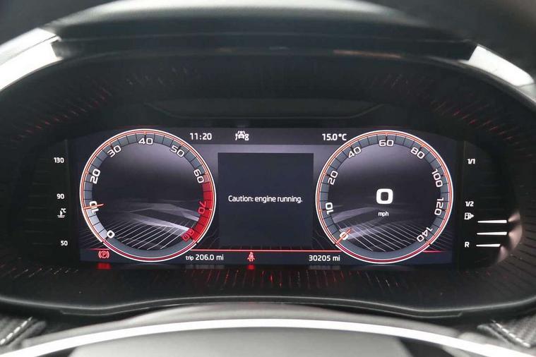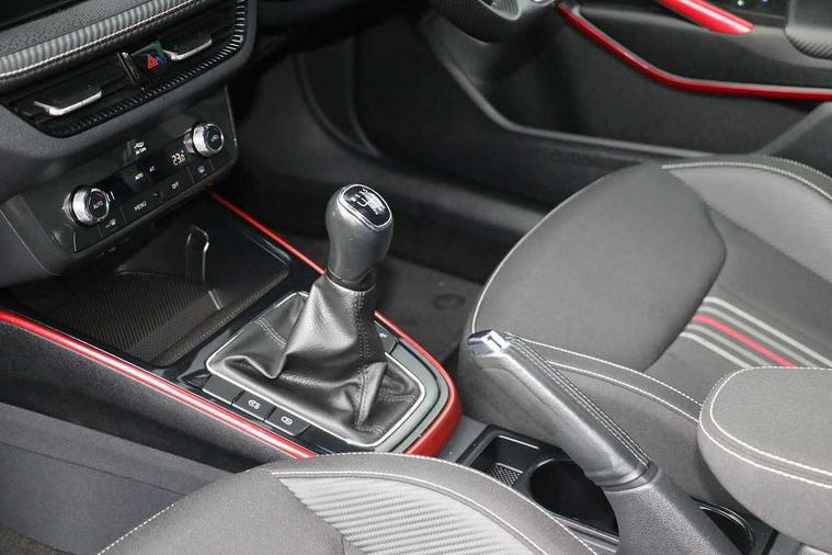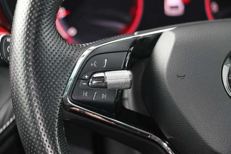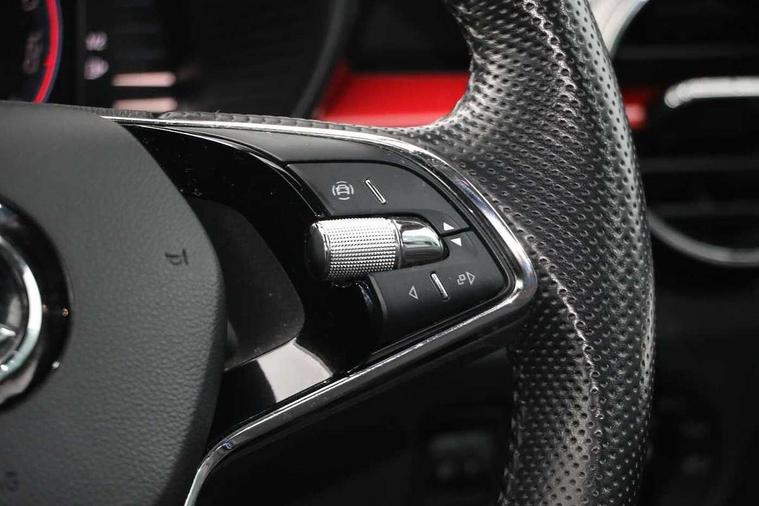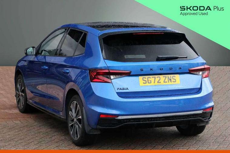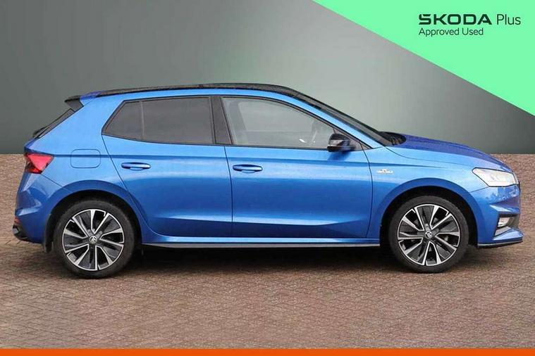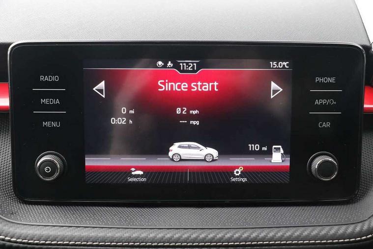 Carbon effect door and side trim panels, Carbon effect lower decorative trim with white stitching, Red metallic upper decorative trim, Ambient lighting pack 2 - Fabia Hatchback, Anti-theft wheel bolts protection, Super-low rolling resistance tyres, Anti-theft alarm system including immobiliser, interior monitoring, backup horn, and towing protection, 2x USB-C in the front (for data transmission and charging), 6 Speakers (4 in front and 2 in rear), Auxiliary socket for external MP3 player, Bolero radio with 8" colour display, DAB digital radio reception, 3-point height adjustable front seats belts with pretensioner and force limiter, Automatic warning lights in case of crash, Driver and passengers airbag with switch off function, e-Call+, ESC including ABS, MSR, ASR, EDS, HBA and XDS, Front and rear seat belt warning, FRONT ASSIST (AEB City and AEB Inter Urban), Front side airbags, Head airbags, One tone horn, Pedestrian protection, Three rear 3-points safety seat belts with pretensioner and force limiter including stop function for outer rear seat belts, Tyre pressure monitoring system, Auto dimming rear view mirror, Basic rear light, Black radiator grille, Body coloured bumpers, Door mirror integrated indicators, Electrically adjustable and heated door mirrors, Front and rear electric windows, Front window wiper intermittent control, Headlight range control - Automatic, Ice scraper in fuel cap, LED daytime running lights with coming and leaving home feature, Monte Carlo badging, Privacy glass, Rear LED fog light, Rear side wing doors, Rear window wiper with washing nozzles, Roof mounted spoiler, SKODA tailgate lettering in black, Sports bumpers, Third brake light, 3 rear headrests, Aluminium pedals, Backrest split and folding, Black headlining, Central console with removable cup holder and storage box, Chrome handbrake release button, Fabric/artificial leather upholstery, Front sports seats, Gearshift knob/handle in leather, Hand brake lever handle in leather, Height adjustable front headrests, Height adjustable steering wheel, ISOFIX and TopTether anchorage points to the outer rear seats, ISOFIX and TopTether on the front passenger seat, Luggage compartment lighting, Metallic painted red central console cover, Metallic red interior door handles, Monte Carlo door sills, Pollen filter, Rear seat bench unsplit, Single front passenger seat, Sun visors with mirror and airbag label on passenger side, Textile floor mats, Ticket holder, Umbrella in drivers door, Bluetooth connection, Driver alert system - DAS, Electromechanical power steering, Exterior temperature gauge, Service interval indicator,