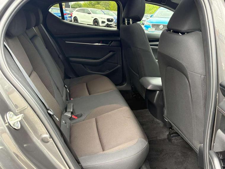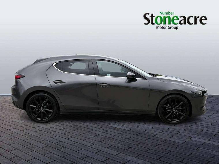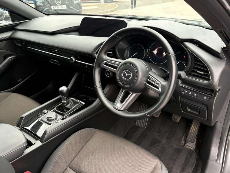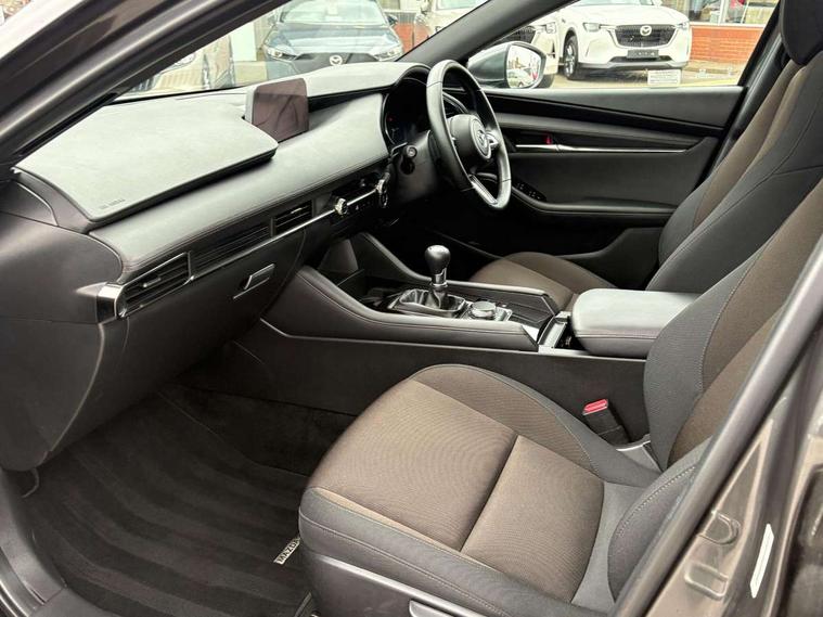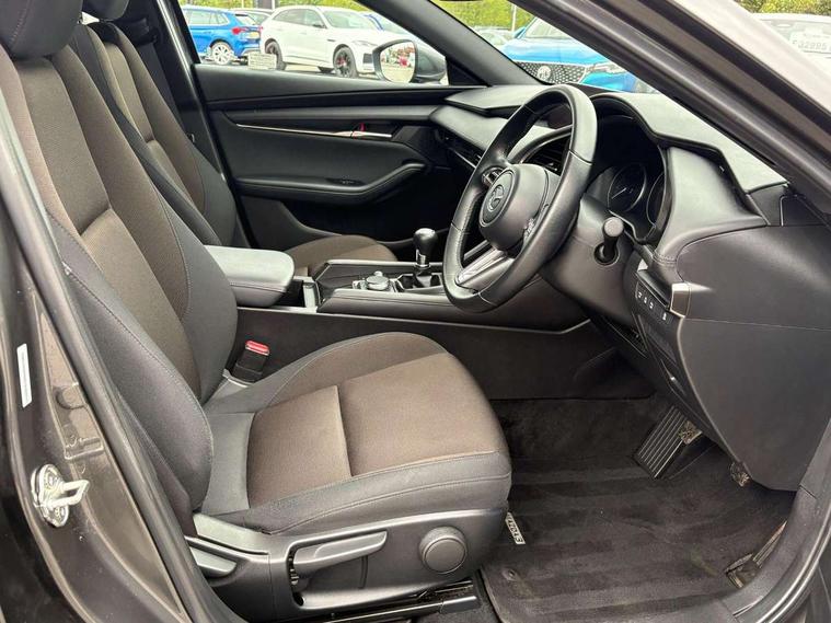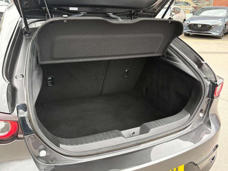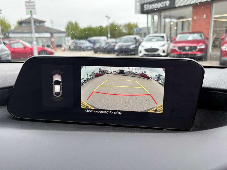 18" Black Alloy Wheels, Emergency tyre repair kit, Auto door lock when driving, Remote central locking + deadlocks, Smart keyless entry, Thatcham accredited alarm and immobiliser, Mazda Multimedia System with AM / FM / DAB radio with 8 speakers, 3 point ELR front seatbelts with pretensioners, 3 rear 3 point seatbelts with ELR, Anti-lock braking system (ABS), Drivers knee airbag, DSC - Dynamic Stability Control, Dual stage driver and single stage passenger airbags, EBD - Electronic brakeforce distribution, Electronic parking brake with auto disengage function and auto hold function, Front and rear curtain airbags, Front passenger airbag cut-off switch, Front side airbags, Front smart city brake support, G-Vectoring control plus, Hill launch assist, Intelligent Traction Control system, Manual child lock in rear doors, Mild Hybrid system with regenerative braking, Seatbelt reminder for driver/front passenger and rear seats, Tyre pressure monitoring system (TPMS), Adaptive LED Headlights, Auto dimming driver's door mirrors, B-pillar garnish in piano black, Body coloured, electrically adjustable, heated auto power folding door mirrors with integrated indicators, Coming/leaving home lighting function, Dark metallic finish signature wing, Dual chrome tailpipes tip, Dusk sensing headlights, Electric front/rear windows with one touch/auto up/down, Frameless auto dimming interior rear view mirror, Front body coloured bumper with black lower bezel, Front kodo turn signal, Gloss black finish front grille, Gloss black rear roof spoiler, LED indicator lights, LED third brake light, Power tilt and slide sunroof, Privacy glass with dark tinting on rear side windows and rear window, Rain sensing front wipers with adjustable sensitivity and speed, Rear colour coded bumper with gloss black lower moulding, Rear fog lights, Rear side wing doors, Signature LED daytime running lights, Signature LED rear combination lights, Speed adjustable rear wash wiper with intermittent wipe, 12v electrical power outlet, 3 seat bench in 2nd row, 60/40 split fold down rear seats, Black cloth door panel inserts, Chrome interior trim accents with steering wheel centre bezel, surround of engine start / stop button and glove box handle, Cloth upholstery, Dark roof headlining, ceiling and pillars, Driver, front passenger and two rear door pockets, Driver, Front passenger and two rear grab handles with coathooks, Driver/passenger sunvisors + vanity mirrors (drivers side with ticket holder), Drivers seat manual slide recline and height adjustment, Dual zone climate control air conditioning, Folding rear centre armrest with two cup holders, Front and rear courtesy lamps, Front armrest, Front centre storage with two cupholders, Front head restraints, Front passenger seatback pocket, Front passengers seat manual slide, recline and height adjustment, Gear shift indicator, Heated front seats with 3 stage setting, Illuminated glovebox, Interior colouration dashboard and doorcards in black with dark stitching, ISOFIX child seat anchorage points attached on outer rear seats, Leather wrapped gear shift knob, Leather wrapped steering wheel, LED interior light, Luggage compartment light, Power outlet in luggage compartment, Roof mounted sunglasses holder, Single front passenger seat, Three height adjustable rear head restraints, Tilt/height adjustable steering wheel, USB input, 7" colour TFT display, 8.8" Colour centre touch screen display with Mazda Connect infotainment, Apple car play/Android Auto, Audio transfer from bluetooth devices, Blind spot monitoring with rear cross traffic alert, Colour active driving display inc Windscreen projected, Traffic Sign Recognition, turn-by- turn navigation and Mazda Radar Cruise Control information, Digital instrument cluster, Driver attention alert system, E-call with GPS, Emergency stop signalling system, Engine start/stop button, Front and rear parking sensor with audible and visual warning, Head up Display, Integrated bluetooth with steering wheel mounted controls, Intelligent speed assist, Lane keep assist system (LAS) with Lane departure warning system (LDWS), Mazda connected services, Mazda Navigation System with european mapping, Mazda Radar Cruise Control, Mobile App interface, Multimedia Commander, PAS, Reversing camera, Service indicator, Tailgate, Traffic sign recognition (TSR), Trip computer, i-stop,