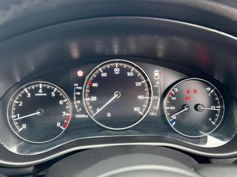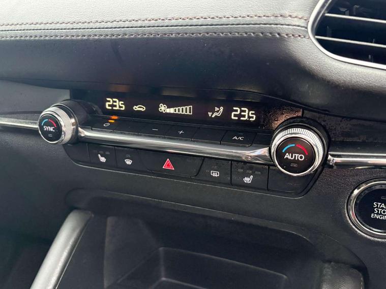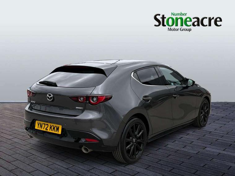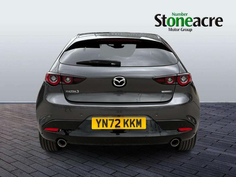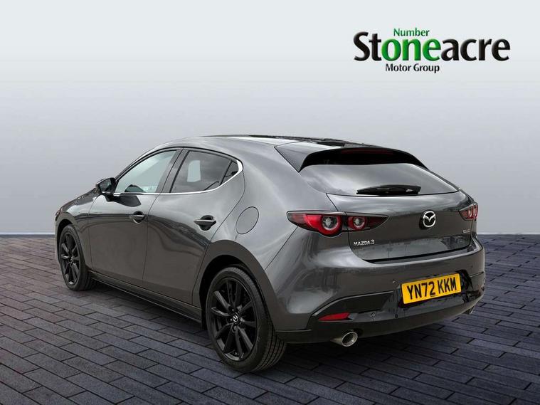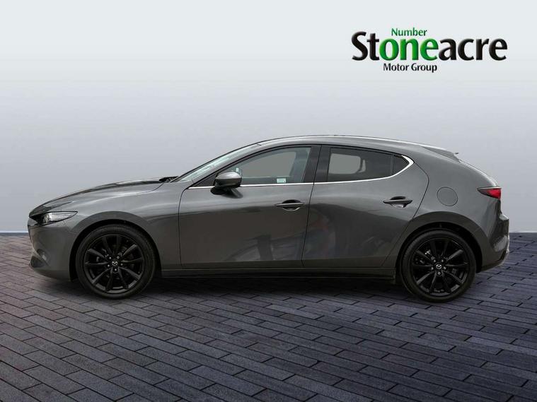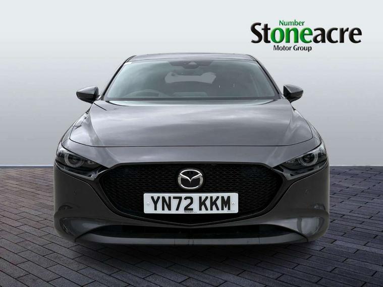 18" Black Alloy Wheels, Emergency tyre repair kit, Auto door lock when driving, Remote central locking + deadlocks, Smart keyless entry, Thatcham accredited alarm and immobiliser, Mazda Multimedia System with AM / FM / DAB radio with 8 speakers, 3 point ELR front seatbelts with pretensioners, 3 rear 3 point seatbelts with ELR, Anti-lock braking system (ABS), Drivers knee airbag, DSC - Dynamic Stability Control, Dual stage driver and single stage passenger airbags, EBD - Electronic brakeforce distribution, Electronic parking brake with auto disengage function and auto hold function, Front and rear curtain airbags, Front passenger airbag cut-off switch, Front side airbags, Front smart city brake support, G-Vectoring control plus, Hill launch assist, Intelligent Traction Control system, Manual child lock in rear doors, Mild Hybrid system with regenerative braking, Seatbelt reminder for driver/front passenger and rear seats, Tyre pressure monitoring system (TPMS), Adaptive LED Headlights, Auto dimming driver's door mirrors, B-pillar garnish in piano black, Body coloured, electrically adjustable, heated auto power folding door mirrors with integrated indicators, Coming/leaving home lighting function, Dark metallic finish signature wing, Dual chrome tailpipes tip, Dusk sensing headlights, Electric front/rear windows with one touch/auto up/down, Frameless auto dimming interior rear view mirror, Front body coloured bumper with black lower bezel, Front kodo turn signal, Gloss black finish front grille, Gloss black rear roof spoiler, LED indicator lights, LED third brake light, Power tilt and slide sunroof, Privacy glass with dark tinting on rear side windows and rear window, Rain sensing front wipers with adjustable sensitivity and speed, Rear colour coded bumper with gloss black lower moulding, Rear fog lights, Rear side wing doors, Signature LED daytime running lights, Signature LED rear combination lights, Speed adjustable rear wash wiper with intermittent wipe, 12v electrical power outlet, 3 seat bench in 2nd row, 60/40 split fold down rear seats, Black cloth door panel inserts, Chrome interior trim accents with steering wheel centre bezel, surround of engine start / stop button and glove box handle, Cloth upholstery, Dark roof headlining, ceiling and pillars, Driver, front passenger and two rear door pockets, Driver, Front passenger and two rear grab handles with coathooks, Driver/passenger sunvisors + vanity mirrors (drivers side with ticket holder), Drivers seat manual slide recline and height adjustment, Dual zone climate control air conditioning, Folding rear centre armrest with two cup holders, Front and rear courtesy lamps, Front armrest, Front centre storage with two cupholders, Front head restraints, Front passenger seatback pocket, Front passengers seat manual slide, recline and height adjustment, Gear shift indicator, Heated front seats with 3 stage setting, Illuminated glovebox, Interior colouration dashboard and doorcards in black with dark stitching, ISOFIX child seat anchorage points attached on outer rear seats, Leather wrapped gear shift knob, Leather wrapped steering wheel, LED interior light, Luggage compartment light, Power outlet in luggage compartment, Roof mounted sunglasses holder, Single front passenger seat, Three height adjustable rear head restraints, Tilt/height adjustable steering wheel, USB input, 7" colour TFT display, 8.8" Colour centre touch screen display with Mazda Connect infotainment, Apple car play/Android Auto, Audio transfer from bluetooth devices, Blind spot monitoring with rear cross traffic alert, Colour active driving display inc Windscreen projected, Traffic Sign Recognition, turn-by- turn navigation and Mazda Radar Cruise Control information, Digital instrument cluster, Driver attention alert system, E-call with GPS, Emergency stop signalling system, Engine start/stop button, Front and rear parking sensor with audible and visual warning, Head up Display, Integrated bluetooth with steering wheel mounted controls, Intelligent speed assist, Lane keep assist system (LAS) with Lane departure warning system (LDWS), Mazda connected services, Mazda Navigation System with european mapping, Mazda Radar Cruise Control, Mobile App interface, Multimedia Commander, PAS, Reversing camera, Service indicator, Tailgate, Traffic sign recognition (TSR), Trip computer, i-stop,