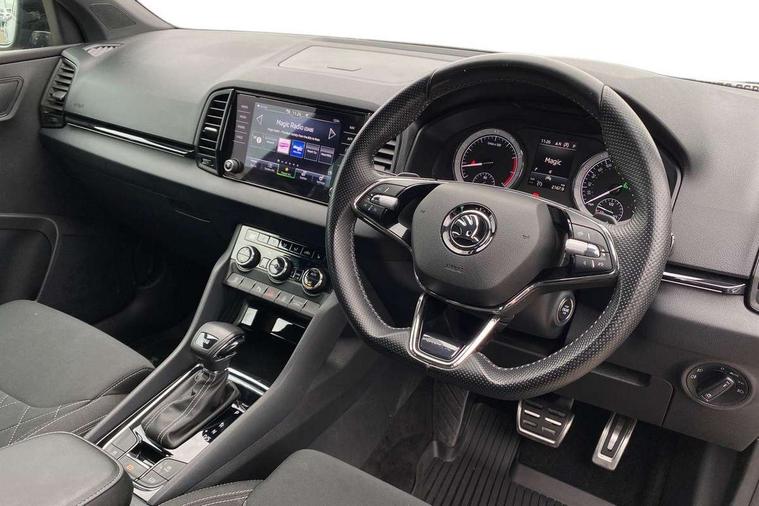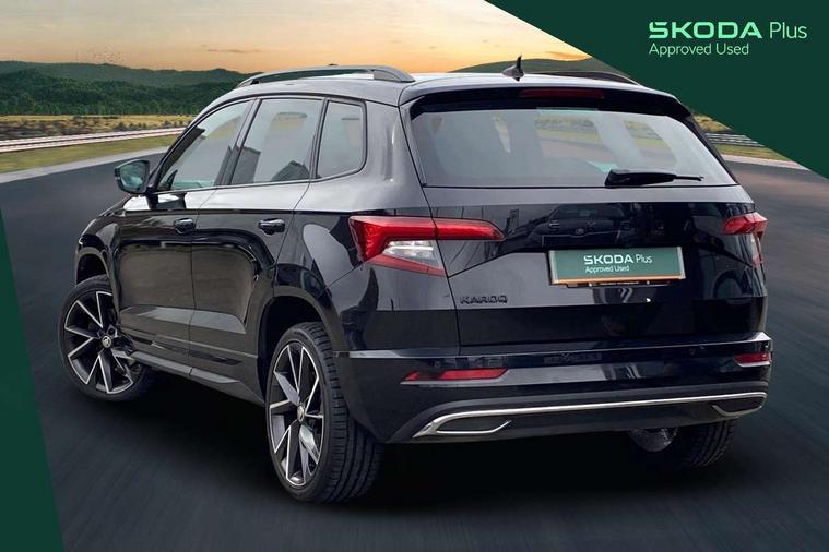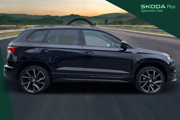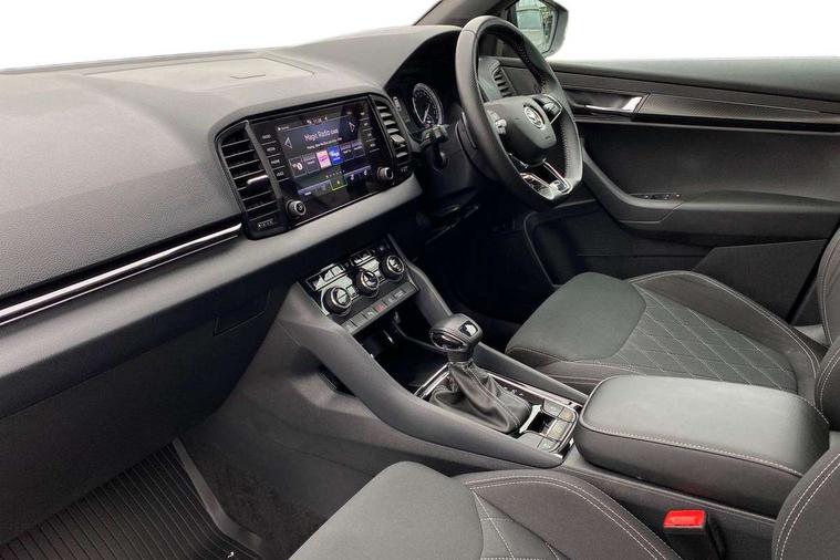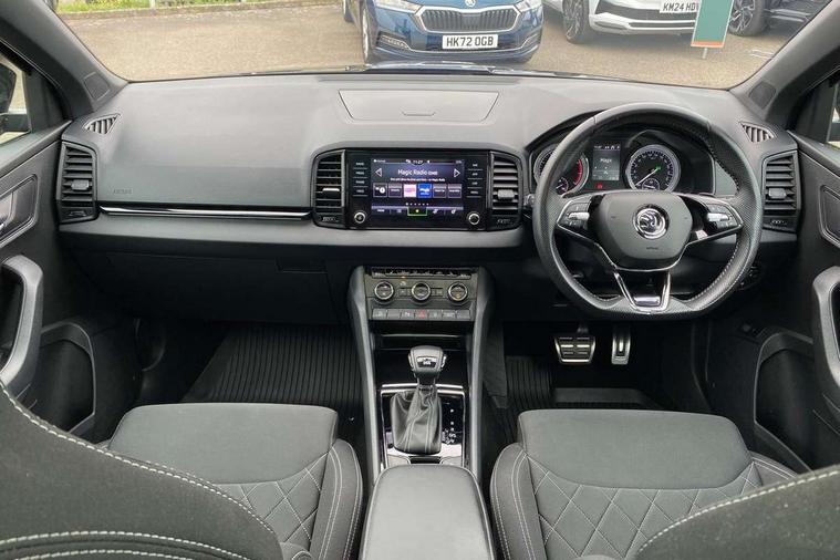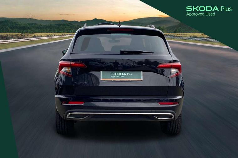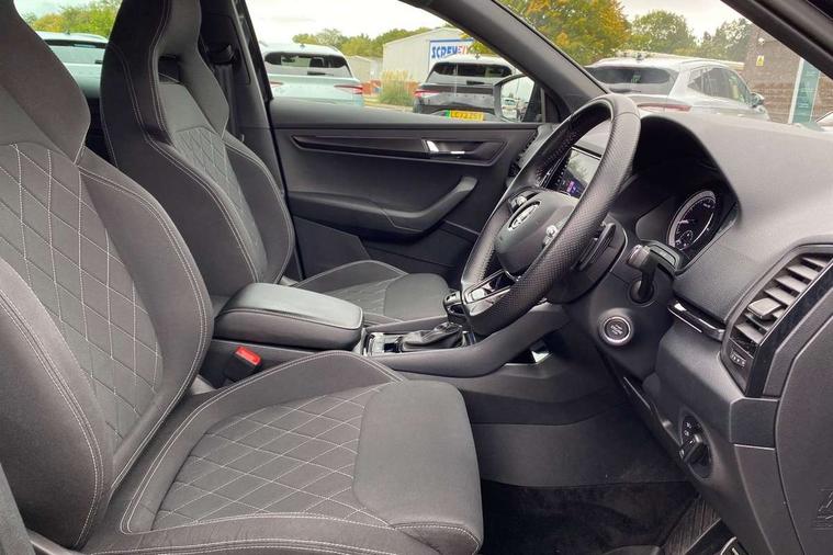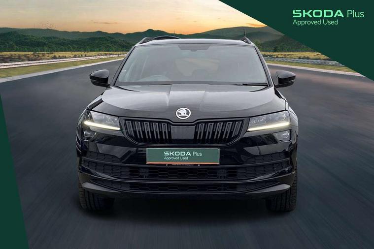 Black air vent surround, LED Interior lighting pack with Skoda welcome logo - Karoq, 19" Vega anthracite alloy wheels, Anti-theft wheel bolts protection, Storage on wheel cover, Alarm with interior monitoring, back up horn and tilt sensor with safe function, Electronic engine immobiliser, Keyless entry and keyless start with safe system, Remote central locking with 2 remote folding keys, DAB radio with Bluetooth, USB connection, Wireless charging without wireless aerial connection, Airbags - Front side, head, knee and curtain, Automatic door unlocking in case of crash, Automatic fuel cut off in case of crash, Driver airbag, Electronic parking brake with auto hold function, Emergency rear braking signal, ESC including ABS, MSR, ASR, EDS, HBA, DSR, RBS, MKB and traction control, Front assist radar scanning of the space in front of the car with automatic braking, Hill hold control, Passenger airbag with switch-off function, Pedestrian monitor, Seatbelt reminder signalisation and pretensioner for all seats, Three point seatbelts rear, Two tone horn, Tyre pressure display, Tyre pressure monitor, Acoustic glass, Aero front windscreen wipers with intermittent function, Automatic headlight control system, Black door mirrors, Black electric window control buttons, Black radiator grille, Black roof rails, Body colour door handles, Body coloured bumpers, Electric front and rear windows with child proof lock, Front door steps with SportLine logo, Full LED headlights + adaptive front light system + LED daytime running lights and front cornering fog lights, Headlight washers, Heated rear windscreen, LED rear lights with high functionality, Light assistant (coming/leaving home/tunnel light), Panoramic sliding sunroof, Privacy glass, Protective door side sills in body colour, Rear diffuser, Safety reflectors on front doors, Skoda lettering on tailgate in black, Sportline badge on front fender, Sportline decorative inserts with badging, Sports front and rear bumpers, Third brake light, 1.5 litre bottle holders in driver and front passenger door panels, 12V socket in boot, 12v socket in front centre armrest with storage compartment and rear air vents, 2 Folding hooks and nets in boot, 2 Front readings lights for driver and passenger, 3 rear height adjustable headrests, 4 foldable roof handles with rear coat hooks, Aluminium pedals, Black roof headlining, Cargo elements in boot, Chrome inner door handles, Door sill scuff plates, Driver and passenger seats height adjust, Front head restraints, Height adjustable front three point seats belts with tensioners, Height/reach adjust steering wheel, Ice scraper, Illuminated and cooled glovebox, Illuminated luggage compartment, Isofix child seat preparation outer rear, Manual lumbar support for front seats, Net programme in boot, Pen holder, Pollen filter, Rear reading lights, Rear seats fixed folding and divided 60:40, Retractable parcel shelf attachable to tailgate, Safety vest holder, Solid rear boot cover, Storage box in upper central dashboard closed, Storage compartment below the passenger seat, Sunvisors with illuminated vanity mirrors, Textile floor mats, Umbrella under passenger seat, Welcome animation with sportline logo, Care connect, Drive mode selector, Driver fatigue sensor, Multifunction colour trip computer, Outside temperature gauge, Service interval indicator, SmartLink wireless for Apple and wired for Android, Start/stop system with regenerative braking, USB C Port x 2 in front centre console,