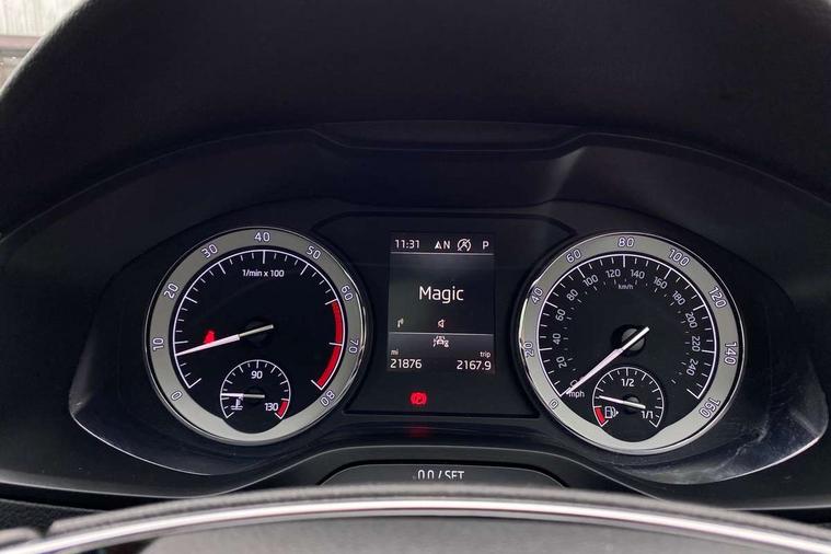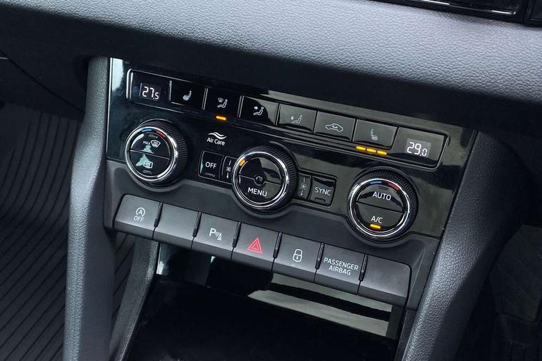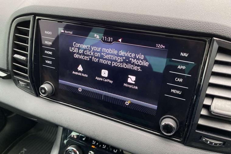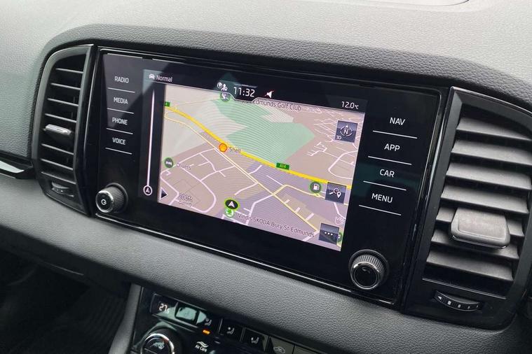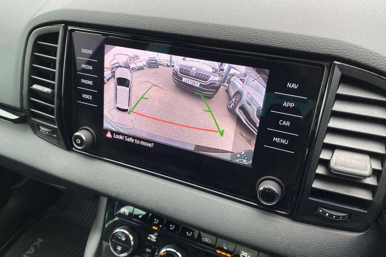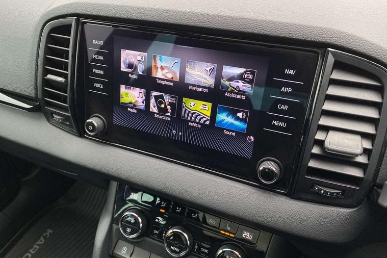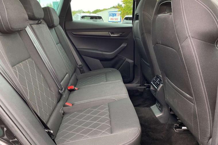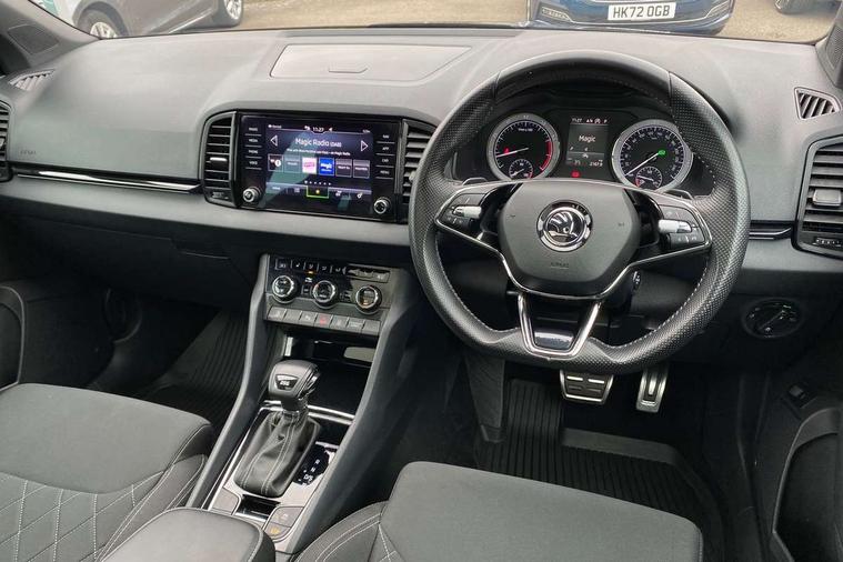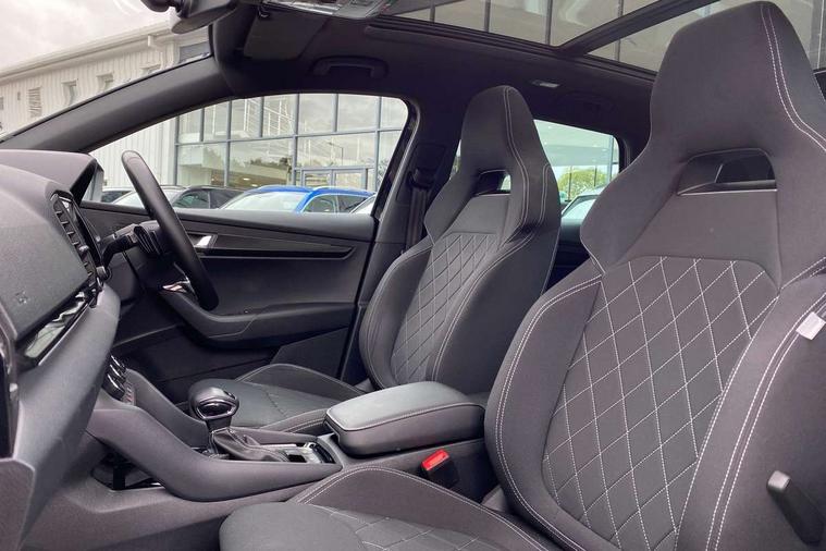 Black air vent surround, LED Interior lighting pack with Skoda welcome logo - Karoq, 19" Vega anthracite alloy wheels, Anti-theft wheel bolts protection, Storage on wheel cover, Alarm with interior monitoring, back up horn and tilt sensor with safe function, Electronic engine immobiliser, Keyless entry and keyless start with safe system, Remote central locking with 2 remote folding keys, DAB radio with Bluetooth, USB connection, Wireless charging without wireless aerial connection, Airbags - Front side, head, knee and curtain, Automatic door unlocking in case of crash, Automatic fuel cut off in case of crash, Driver airbag, Electronic parking brake with auto hold function, Emergency rear braking signal, ESC including ABS, MSR, ASR, EDS, HBA, DSR, RBS, MKB and traction control, Front assist radar scanning of the space in front of the car with automatic braking, Hill hold control, Passenger airbag with switch-off function, Pedestrian monitor, Seatbelt reminder signalisation and pretensioner for all seats, Three point seatbelts rear, Two tone horn, Tyre pressure display, Tyre pressure monitor, Acoustic glass, Aero front windscreen wipers with intermittent function, Automatic headlight control system, Black door mirrors, Black electric window control buttons, Black radiator grille, Black roof rails, Body colour door handles, Body coloured bumpers, Electric front and rear windows with child proof lock, Front door steps with SportLine logo, Full LED headlights + adaptive front light system + LED daytime running lights and front cornering fog lights, Headlight washers, Heated rear windscreen, LED rear lights with high functionality, Light assistant (coming/leaving home/tunnel light), Panoramic sliding sunroof, Privacy glass, Protective door side sills in body colour, Rear diffuser, Safety reflectors on front doors, Skoda lettering on tailgate in black, Sportline badge on front fender, Sportline decorative inserts with badging, Sports front and rear bumpers, Third brake light, 1.5 litre bottle holders in driver and front passenger door panels, 12V socket in boot, 12v socket in front centre armrest with storage compartment and rear air vents, 2 Folding hooks and nets in boot, 2 Front readings lights for driver and passenger, 3 rear height adjustable headrests, 4 foldable roof handles with rear coat hooks, Aluminium pedals, Black roof headlining, Cargo elements in boot, Chrome inner door handles, Door sill scuff plates, Driver and passenger seats height adjust, Front head restraints, Height adjustable front three point seats belts with tensioners, Height/reach adjust steering wheel, Ice scraper, Illuminated and cooled glovebox, Illuminated luggage compartment, Isofix child seat preparation outer rear, Manual lumbar support for front seats, Net programme in boot, Pen holder, Pollen filter, Rear reading lights, Rear seats fixed folding and divided 60:40, Retractable parcel shelf attachable to tailgate, Safety vest holder, Solid rear boot cover, Storage box in upper central dashboard closed, Storage compartment below the passenger seat, Sunvisors with illuminated vanity mirrors, Textile floor mats, Umbrella under passenger seat, Welcome animation with sportline logo, Care connect, Drive mode selector, Driver fatigue sensor, Multifunction colour trip computer, Outside temperature gauge, Service interval indicator, SmartLink wireless for Apple and wired for Android, Start/stop system with regenerative braking, USB C Port x 2 in front centre console,