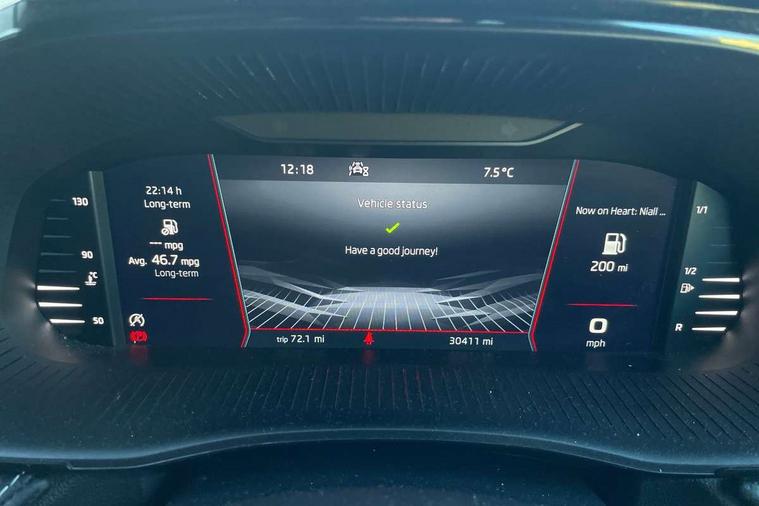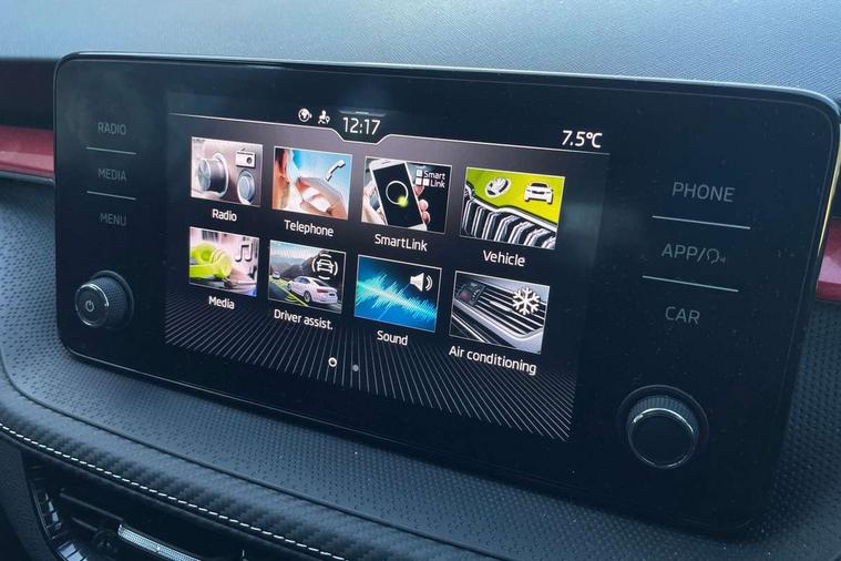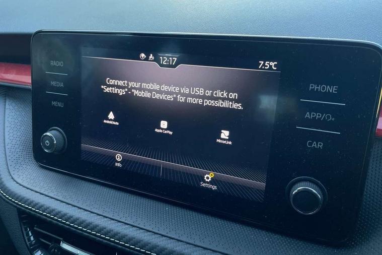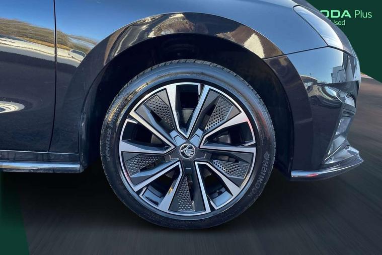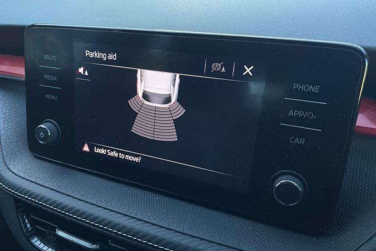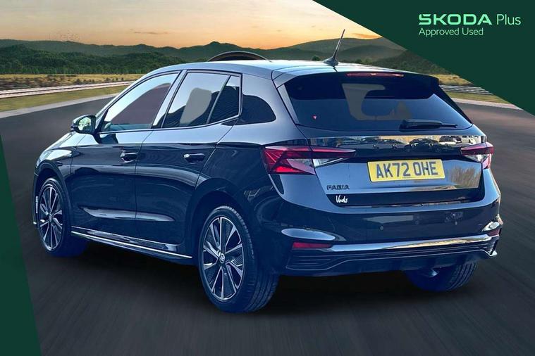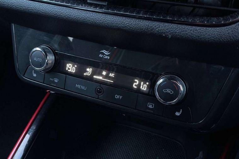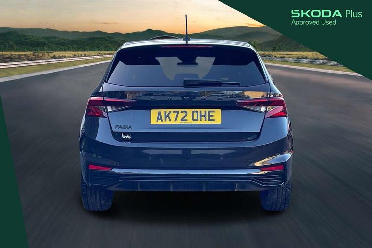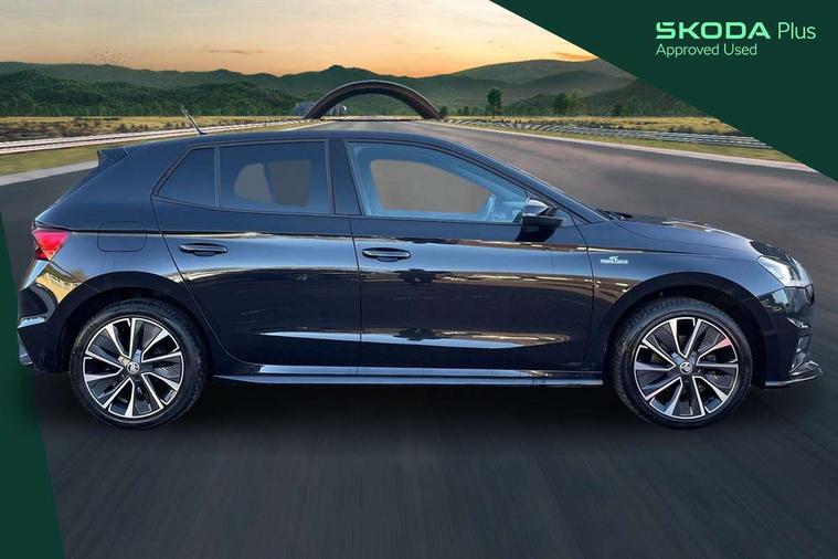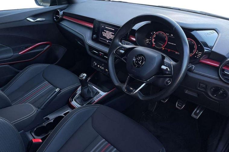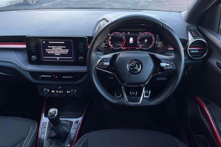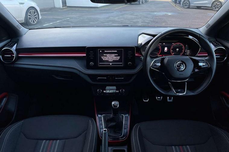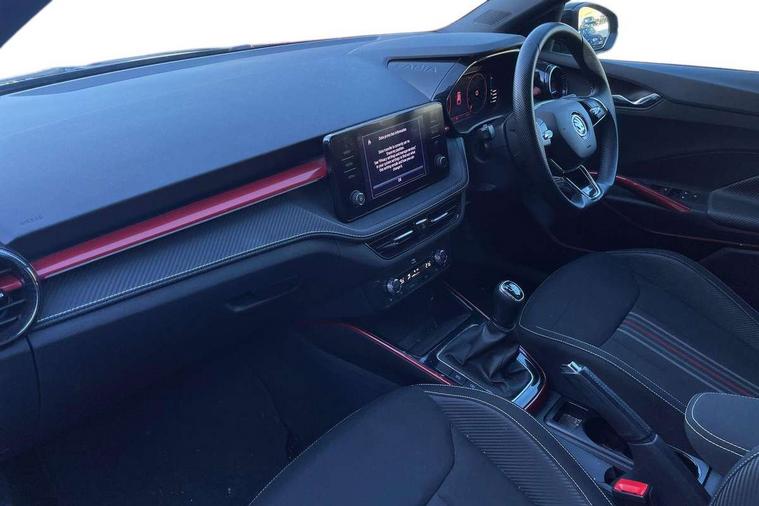 Carbon effect door and side trim panels, Carbon effect lower decorative trim with white stitching, Red metallic upper decorative trim, Ambient lighting pack 2 - Fabia Hatchback, Anti-theft wheel bolts protection, Super-low rolling resistance tyres, Anti-theft alarm system including immobiliser, interior monitoring, backup horn, and towing protection, 2x USB-C in the front (for data transmission and charging), 6 Speakers (4 in front and 2 in rear), Auxiliary socket for external MP3 player, Bolero radio with 8" colour display, DAB digital radio reception, 3-point height adjustable front seats belts with pretensioner and force limiter, Automatic warning lights in case of crash, Driver and passengers airbag with switch off function, e-Call+, ESC including ABS, MSR, ASR, EDS, HBA and XDS, Front and rear seat belt warning, FRONT ASSIST (AEB City and AEB Inter Urban), Front side airbags, Head airbags, One tone horn, Pedestrian protection, Three rear 3-points safety seat belts with pretensioner and force limiter including stop function for outer rear seat belts, Tyre pressure monitoring system, Auto dimming rear view mirror, Basic rear light, Black radiator grille, Body coloured bumpers, Door mirror integrated indicators, Electrically adjustable and heated door mirrors, Front and rear electric windows, Front window wiper intermittent control, Headlight range control - Automatic, Ice scraper in fuel cap, LED daytime running lights with coming and leaving home feature, Monte Carlo badging, Privacy glass, Rear LED fog light, Rear side wing doors, Rear window wiper with washing nozzles, Roof mounted spoiler, SKODA tailgate lettering in black, Sports bumpers, Third brake light, 3 rear headrests, Aluminium pedals, Backrest split and folding, Black headlining, Central console with removable cup holder and storage box, Chrome handbrake release button, Fabric/artificial leather upholstery, Front sports seats, Gearshift knob/handle in leather, Hand brake lever handle in leather, Height adjustable front headrests, Height adjustable steering wheel, ISOFIX and TopTether anchorage points to the outer rear seats, ISOFIX and TopTether on the front passenger seat, Luggage compartment lighting, Metallic painted red central console cover, Metallic red interior door handles, Monte Carlo door sills, Pollen filter, Rear seat bench unsplit, Single front passenger seat, Sun visors with mirror and airbag label on passenger side, Textile floor mats, Ticket holder, Umbrella in drivers door, Bluetooth connection, Driver alert system - DAS, Electromechanical power steering, Exterior temperature gauge, Service interval indicator,