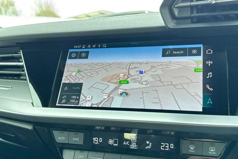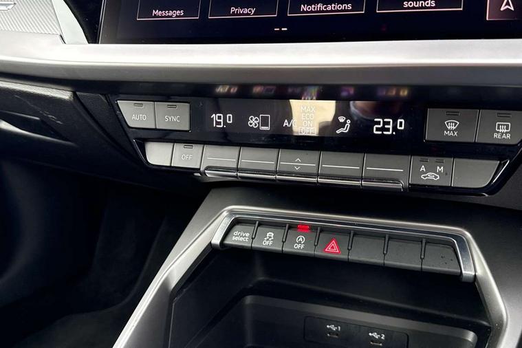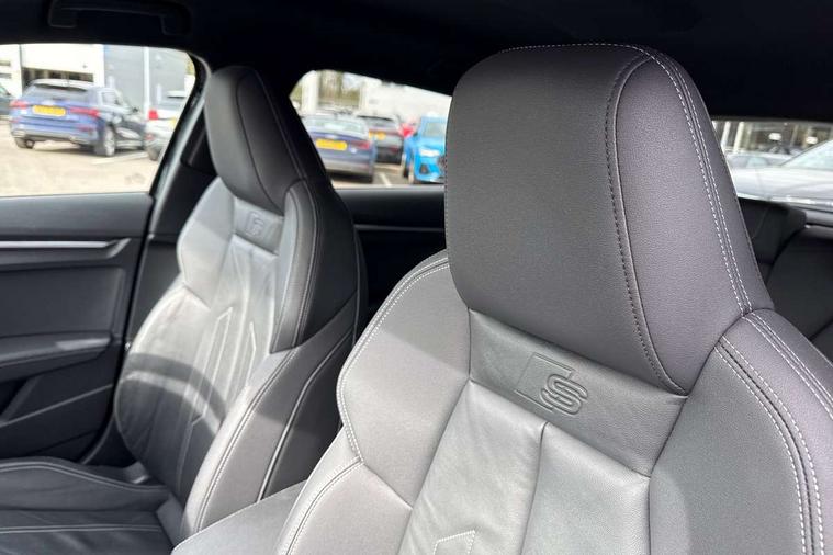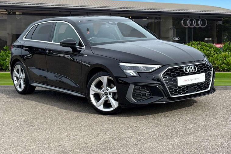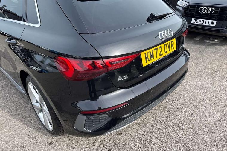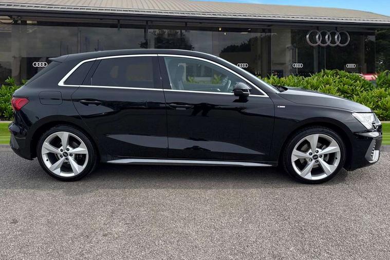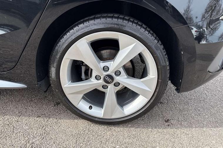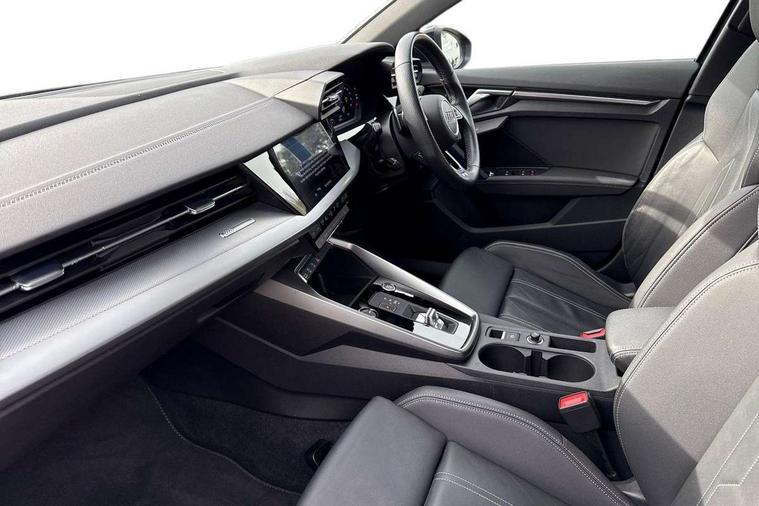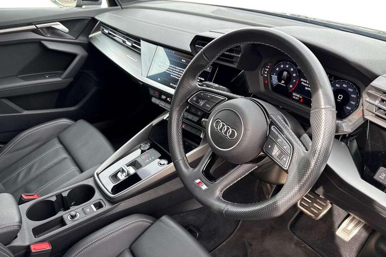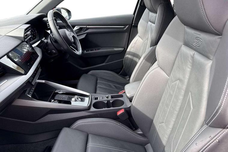 Accent surfaces in the dashboard and centre console in platinum grey silk effect paint finish, Dark spectrum aluminium inlays, Aluminium interior elements pack - A3 Sportback, LED interior lighting pack - A3 Sportback, S line styling pack - A3 Sportback, Anti theft alarm, Anti-theft wheel bolts, Electronically operated child lock, Immobiliser, Remote control central locking, 2xUSB-C connection with data and charging functions, 6 passive loudspeakers, DAB Digital radio, 3x3 point rear seat belts, Audi pre sense front, Driver and front passenger airbag with passenger airbag deactivation, Electronic Stabilisation Control (ESC) including ABS, ASR and EDL, First aid kit with warning triangle and 2 safety vests, Front side airbags with head airbags and interaction airbag, Pre-sense front with pedestrian and cyclist detection, Seatbelt monitoring, Tyre pressure loss indicator, 3rd brake light, Acoustic glass windscreen, Aluminium window trim, Auto dimming frameless rear view mirror, Electrically adjustable/heated/folding/dimming door mirrors with kerb view includes integrated LED indications + kerb view function for passenger side, Front electric windows, Illuminated aluminium inserts front door sills with S logo, LED daytime running lights, LED headlights with LED rear lights and dynamic rear indicators, Light and rain sensors, Privacy glass - dark tinted rear window, rear door and side windows, Rear electric windows, Rear side air outlets in grained matt black, Rear side wing doors, Rear wiper, S line bumpers, S roof spoiler, 12V socket and storage compartment in front centre console, 3 seat bench in 2nd row, 40/20/40 split folding rear seat bench with cupholder, Black cloth headlining, Dual zone electronic climate control, Front and rear centre armrest in leather, Front and rear headrests, Front/rear floor mats, Height and reach adjustable steering wheel, Illuminated vanity mirror, Interior lighting - glove compartment light and right hand side, Luggage compartment floor covering, Manual boot compartment lid, Manually adjustable front seats, Seat side bolsters, Single front passenger seat, Stainless steel pedals and front footrest in black, Twin leather upholstery with front sports seats S embossed logo, Audi drive select (Auto, Comfort, Dynamic, Efficiency and Individual), Audi smartphone interface, Audi Virtual Cockpit - 10.25" digital and colour instrument cluster, Automatic start/stop system with recuperation, Bluetooth interface, Collision avoidance assistant, e-Call (emergency call), Electromechanical power speed sensitive steering, Lane departure warning system, MMI Navigation Plus with high resolution 10.1" colour touch screen display, Service indicator, Trip computer, Voice control system with natural language interaction,