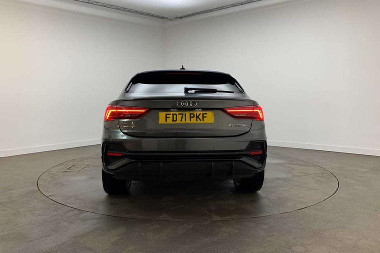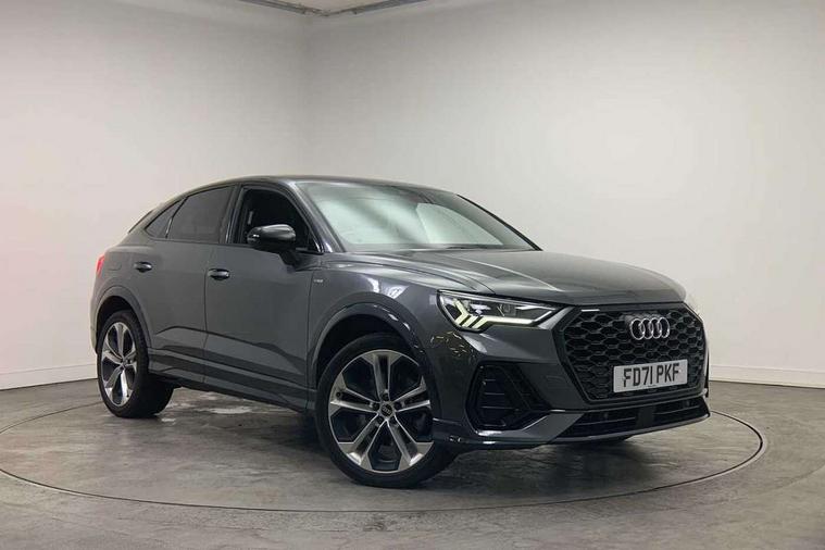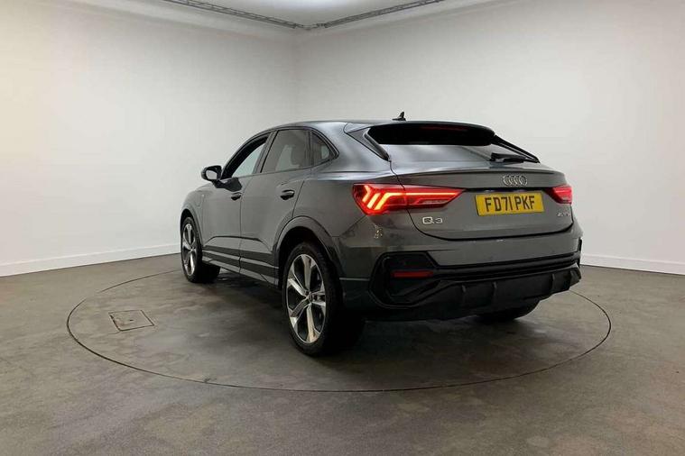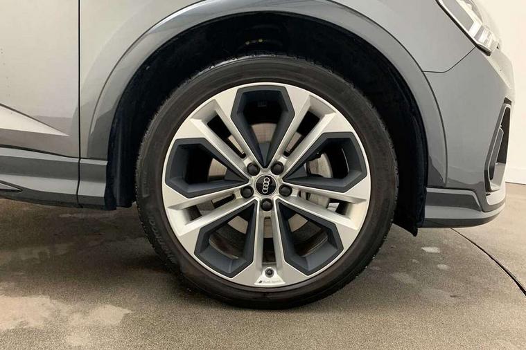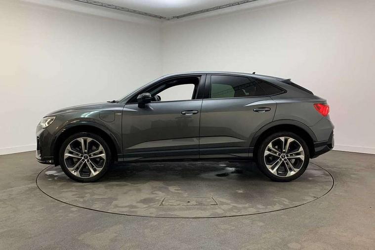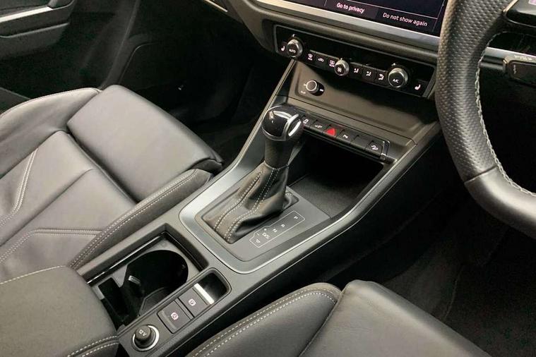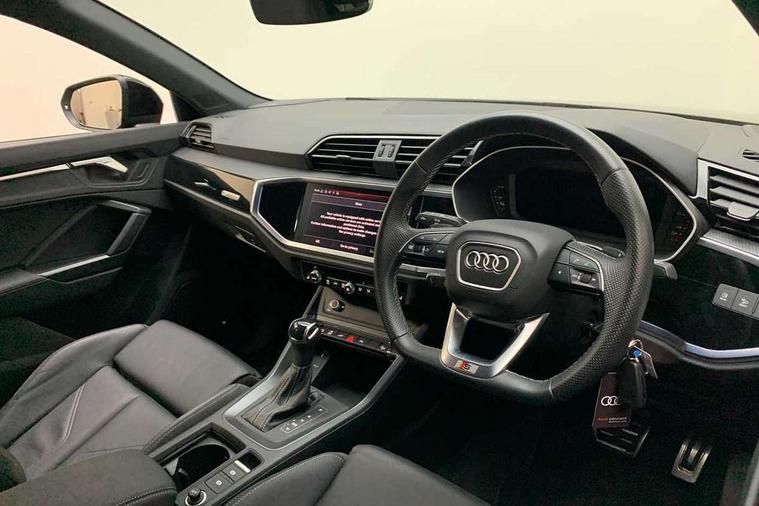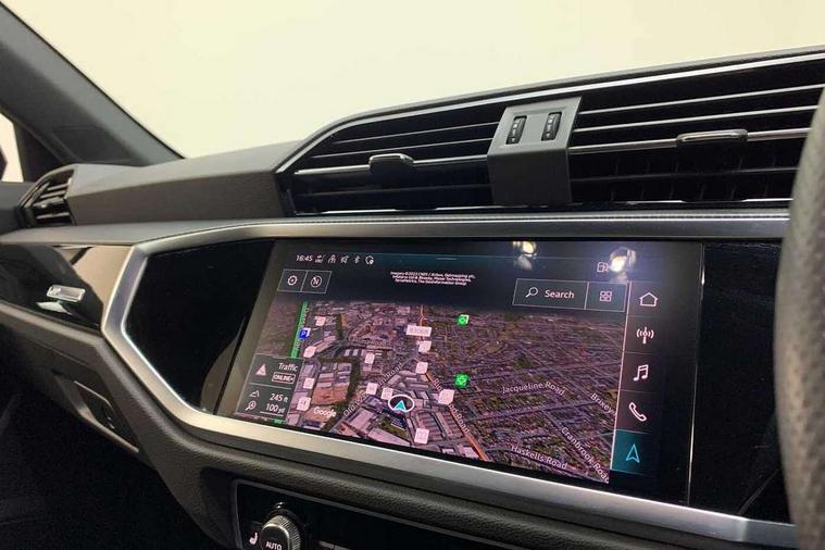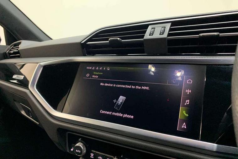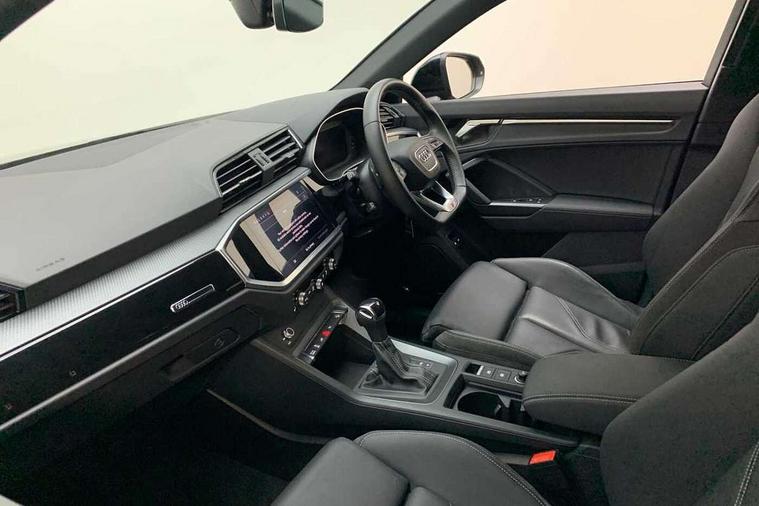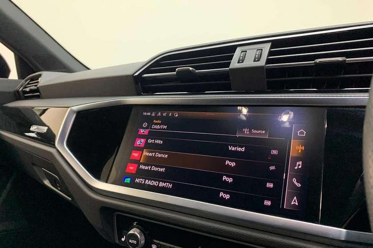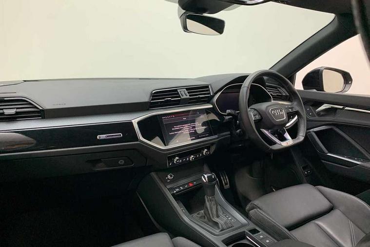 Black dashboard, Detail dashboard around MMI touch colour display in glass look, black with surround in aluminium look, Leatherette door armrest, Piano black inlay, Black styling pack - Q3, Non smoking pack - Q3, Tyre repair kit, Anti theft alarm, Anti theft wheel bolts, Audi pre-sense front with pedestrain and cyclist recognition, Immobiliser, Remote central locking, 2 USB-C ports with charge and data functions, 6 passive loudspeakers, DAB digital radio module, 3x3 point rear seatbelts, 6 airbags - Driver, front passenger, curtain and side windows, Electrically operated child locks on rear doors, Electromechanical parking brake, Electronic stabilisation control including ABS, ASR and EDL, Front seatbelt reminder, Hill descent control, Hill hold assist, Pre sense basic, Seatbelt monitoring, Tyre pressure warning, Warning triangle and first aid kit, Acoustic windscreen, Auto dimming frameless rear view mirror, Bumpers and underbody protection in contrasting manhattan grey paint finish, Diffuser grille in grained matt black, Diffuser trim in selenite silver, Electrically folding, adjustable and heated door mirrors with integrated LED side indicators and kerb view function for passenger side, Front and rear electric windows, Front fog lights, Front side air inlets in selenite silver, High gloss black finish B and C pillars, LED headlights with LED daytime running lights and dynamic rear indicator, LED rear lights, Privacy glass dark tinted rear and rear-side windows (from B-pillar backwards), Rain and light sensors, Rear side wing doors, Rear underbody protection in matt black, Rear wiper, Third brake light, Tinted rear windows, Variable front intermittent wipers, 12V socket in rear centre console, 3 seat bench in 2nd row, 40:20:40 folding with manual adjustment for 60:40 forwards/backwards position and backrest angle, Adjustable rear seat bench/backrest with centre armrest and cupholder, Black cloth headlining, Dual zone electronic climate control, Front and rear black floor mats with contrast stitching, Front and rear headrests, Front and rear roof module including reading lights, Front centre armrest, Glove compartment lighting, Height and reach adjustable steering wheel, Illuminated door sill trims with S logo, ISOFIX child seat mounting for front passenger with airbag deactivation and outer rear seat including top tether attachment point for outer rear seats, Luggage compartment light, Manual front seats with height adjustment, Perforated leather gearknob, Single front passenger seat, Stainless steel luggage compartment sill finisher, Stainless steel pedals, Tool kit, Audi connect safety and service (e-call), Audi drive select, Audi lane departure warning, Audi smartphone interface includes wireless Apple carplay/Android Auto, Audi Virtual Cockpit - 10.25" display, Bluetooth interface, Camera based traffic sign recognition, MMI Navigation Plus with high resolution 10.1 inch touchscreen colour display, Power operated tailgate, Progressive steering, Service interval indicator, Start stop system with recuperation, Voice control system with natural language interaction, 3 pin 10 amp domestic charging cable, Standard suspension, Type 2 mode 3 32 amp charging cable, Type 2 socket for AC charging,