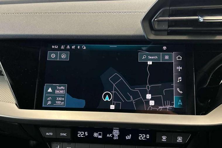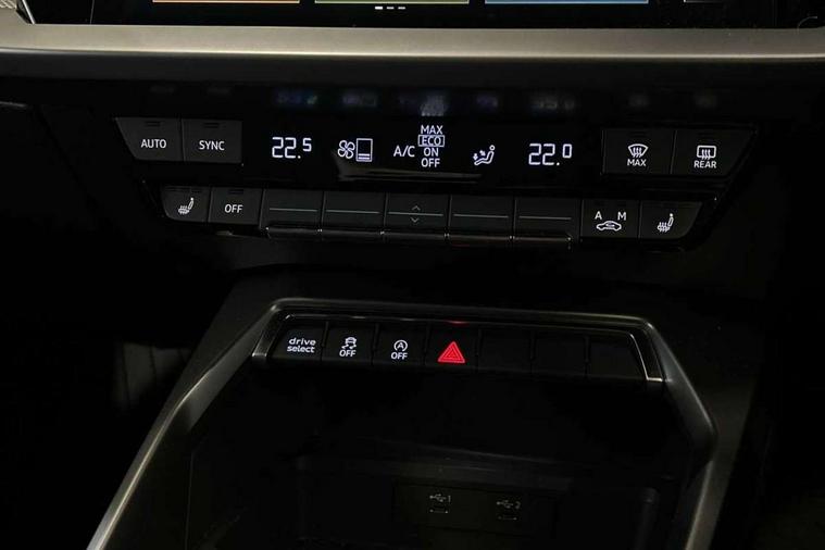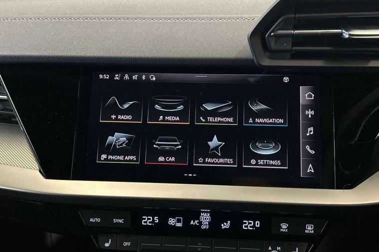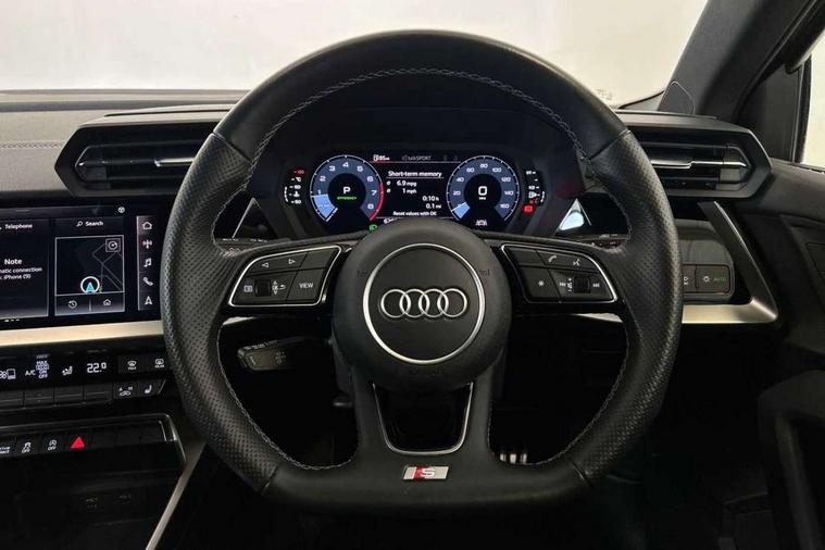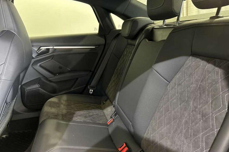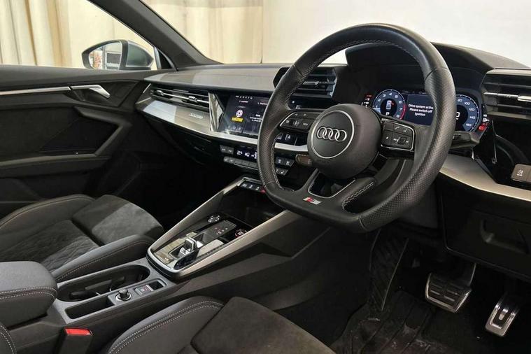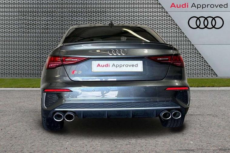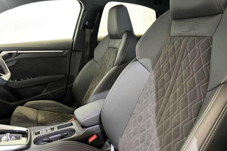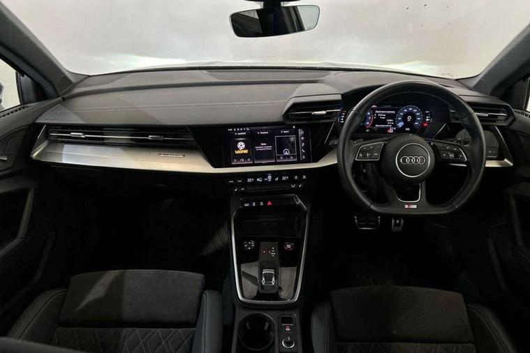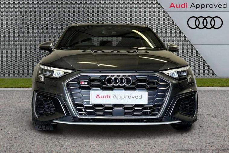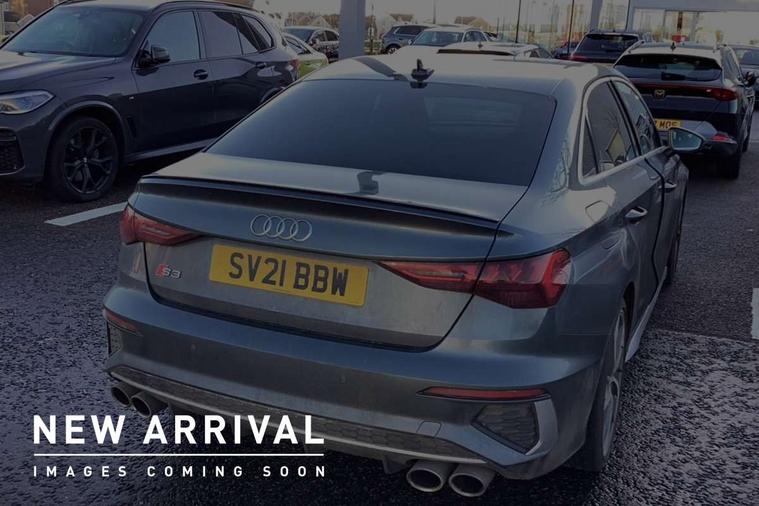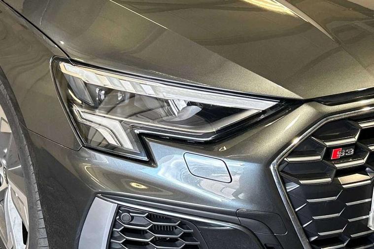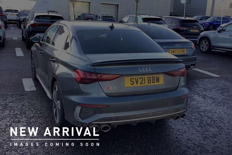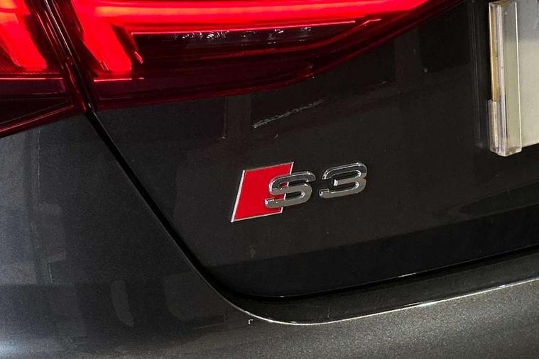Aluminium air vent surrounds, Aluminium trim elements, Dark spectrum aluminium inlays, accent surfaces in the dashboard and centre console in platinum grey silk effect paint finish, Body styling design pack - S3, Storage pack - A3/S3 Saloon, Anti theft alarm, Anti-theft wheel bolts, Electronically operated child lock, Immobiliser, Remote control central locking, 2x USB Type C ports (for charging and data transfer), 6 passive loudspeakers, CD player, DAB Digital radio, 3x3 point rear seat belts, Driver and front passenger airbag with passenger airbag deactivation, Electronic Stabilisation Control (ESC) including ABS, ASR and EDL, First aid kit with warning triangle and 2 safety vests, Front side airbags with head airbags and interaction airbag, Hill hold assist, Pre-sense front with pedestrian and cyclist detection, Seatbelt monitoring, Tyre pressure loss indicator, Acoustic glass windscreen, Audi Beam uses LEDs to project the Audi logo onto the ground as you exit your S3, Auto dimming frameless rear view mirror, Dual branch oval twin tailpipes in chrome plated finish, Electrically adjustable/heated/folding/dimming door mirrors with kerb view includes integrated LED indications + kerb view function for passenger side, Front electric windows, Headlight washers, Illuminated door sills with aluminium inserts at the front with S logo, LED daytime running lights, LED headlights with LED rear lights and dynamic rear indicators, Light and rain sensors, Model and engine designation badges at rear, Privacy glass - dark tinted rear window, rear door and side windows, Rear electric windows, 12V socket and storage compartment in front centre console, 40/20/40 split folding rear seat bench with cupholder, Black cloth headlining, Dual zone electronic climate control, Front and rear centre armrest in leather, Front and rear headrests, Front/rear floor mats, Heated front seats, Height and reach adjustable steering wheel, Interior lighting - glove compartment light and right hand side, Luggage compartment floor covering, Manual boot compartment lid, Seat side bolsters, Stainless steel pedals and front footrest, Audi connect emergency call and service, Audi drive select (Auto, Comfort, Dynamic, Efficiency and Individual), Audi smartphone interface, Audi Virtual Cockpit - 10.25" digital and colour instrument cluster, Automatic start/stop system with recuperation, Bluetooth interface, Collision avoidance assistant, Lane departure warning system, MMI Navigation Plus with high resolution 10.1" colour touch screen display, Progressive steering, Service indicator, Voice control system with natural language interaction, Quattro permanent all wheel drive, S sport suspension with spring damper adjustment and lowering by 15mm,