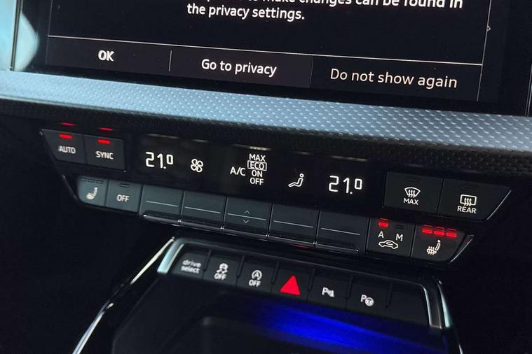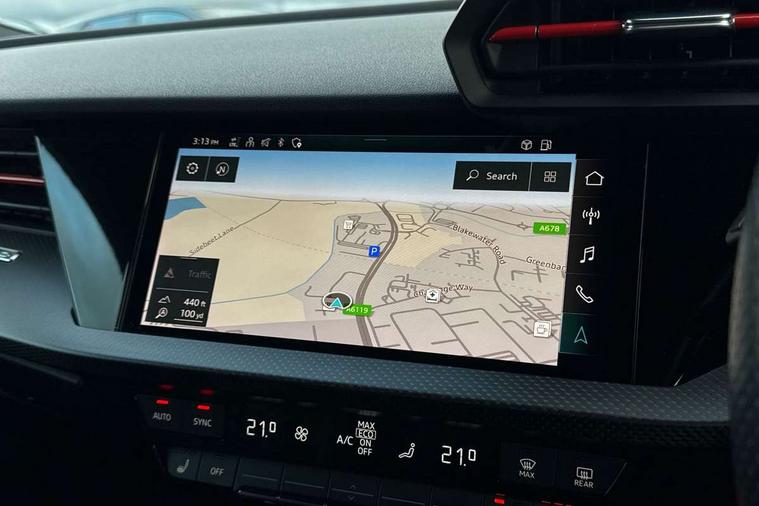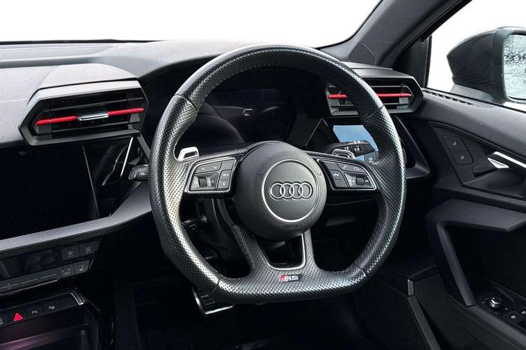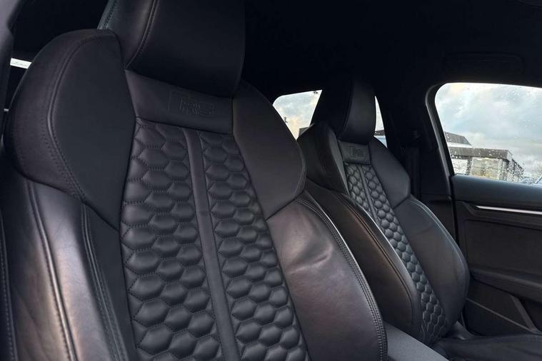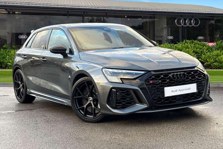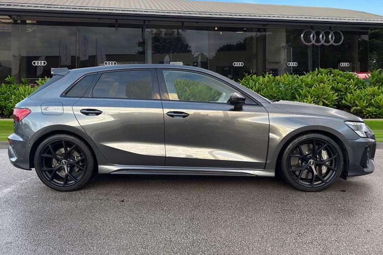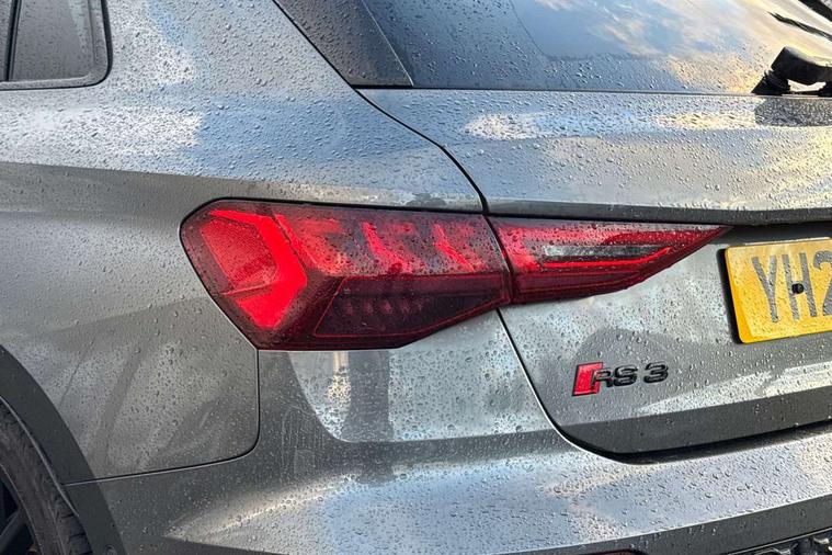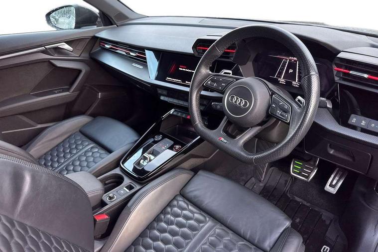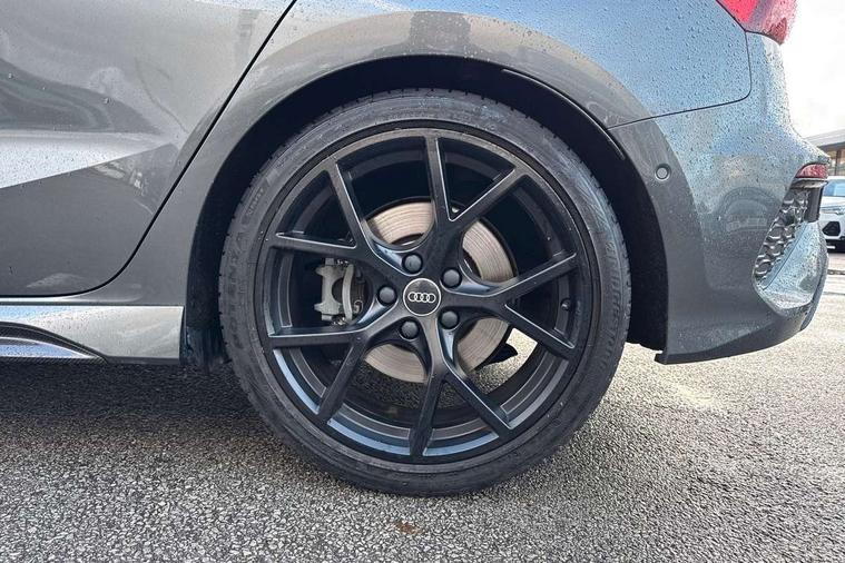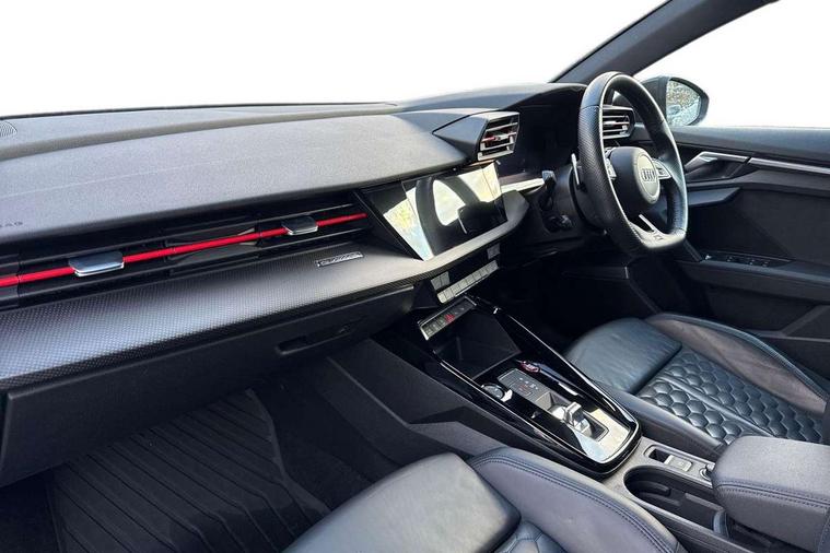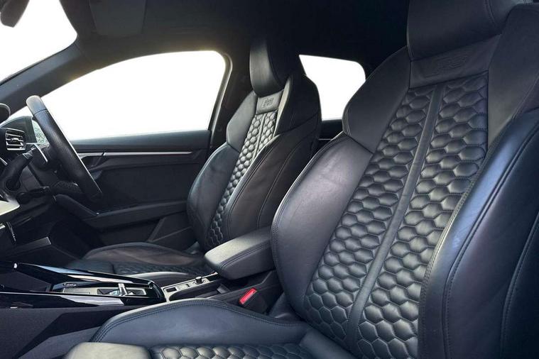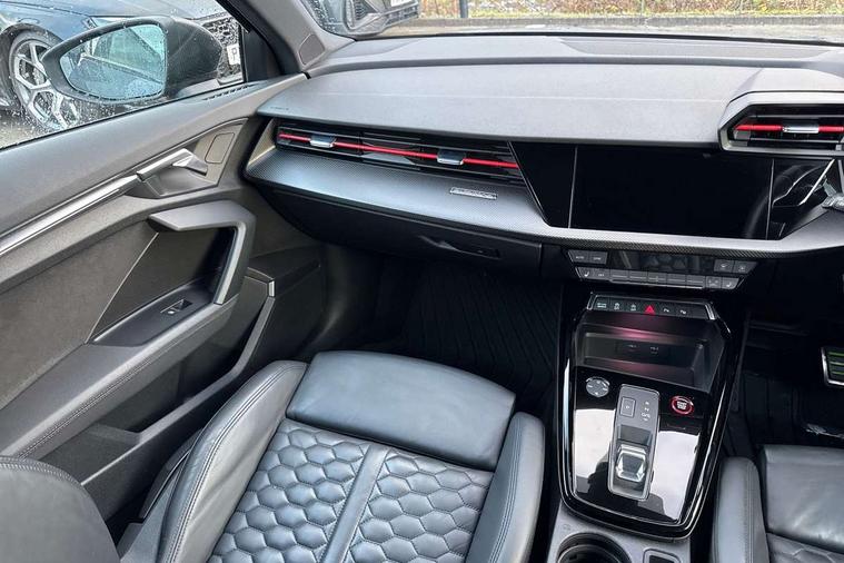 Carbon inlays, accent surfaces in the dashboard and centre console in platinum grey silk effect paint finish, Full decorative carbon trim, Aluminium interior elements pack - RS3, Ambient lighting pack - RS3, MMI navigation plus with MMI touch - RS3, RS bodystyling - RS3, Storage Pack - RS3, 19" 5 Y spoke matt black alloy wheels, Tyre repair kit, Anti theft alarm, Anti-theft wheel bolts, Electronically operated child lock, Remote control central locking, DAB Digital radio, 3x3 point rear seat belts, ABS/EBD, ASR, Audi pre sense front, Driver/Front Passenger airbags, EDL, ESC - Electronic Stability Control + traction control, Front passenger airbag deactivation, Front side airbags with head airbags and interaction airbag, Hill hold assist, Seat belt reminder with passenger presence detection in rear, Tyre pressure loss indicator, Warning triangle and first aid kit, 3rd brake light, Acoustic glass windscreen, Audi beam uses LEDs to project the Audi sport logo onto the ground as you exit your RS 3, Audi matrix LED headlights, LED rear lights, dynamic front and rear indicators and headlight cleaning system, Auto dimming rear view mirror, Body colour roof, Carbon exterior door mirror, Carbon fibre engine cover, Carbon roof spoiler, Daytime running lights, Door mirrors - electrically adjustable, heated, folding and auto dimming on both sides, Headlight washers, Light and rain sensors, Privacy glass - dark tinted rear and rear side windows from B-pillar backwards, Rear side wing doors, Rear window wiper and washer system, RS exterior features in gloss black, RS sports exhaust system, Side skirt in carbon inlay, 3 seat bench in 2nd row, 40/20/40 split folding rear seat bench, Black cloth headlining, Dual zone electronic climate control, Front and rear headrests, Front centre armrest, Front sports seats RS embossed logo, Front/rear floor mats, Heated front seats, Honeycomb stitching and RS embossing, Illuminated door sill trims inlays in aluminium with RS 3 logo, Illuminated vanity mirror, Manually adjustable front seats, RS emblems, Single front passenger seat, Stainless steel pedals and front footrest in black, Tool kit, Audi connect emergency call and service, Audi smartphone interface, Audi virtual cockpit with RS specific display 12.3" full colour digital instrument cluster, Automatic start/stop system with recuperation, Bluetooth interface, Collision avoidance assistant, Lane departure warning system, Legal emergency call, Manual boot opening, Parking assist with parking system plus, Progressive power assisted steering, Quattro permanent four wheel drive, Rear suspension,