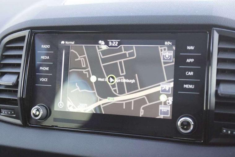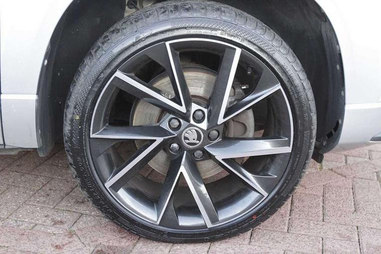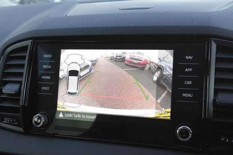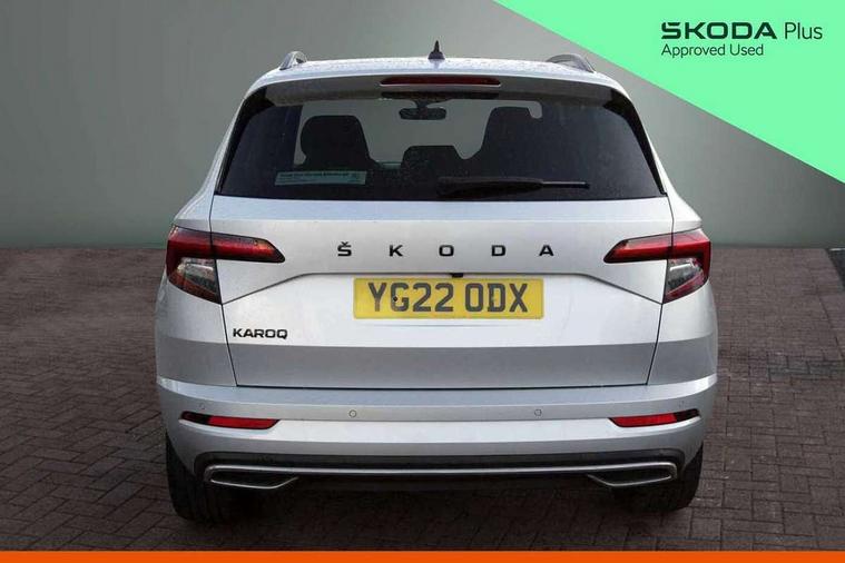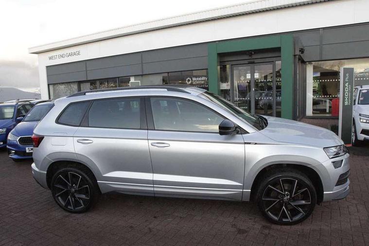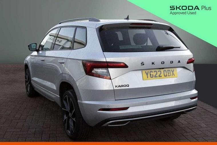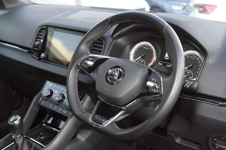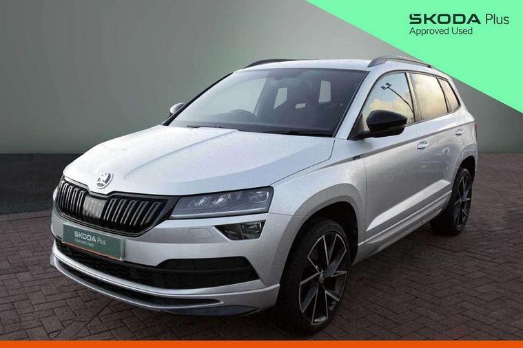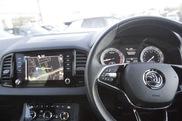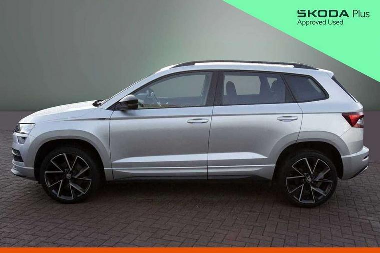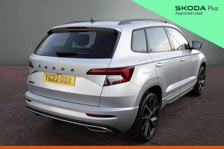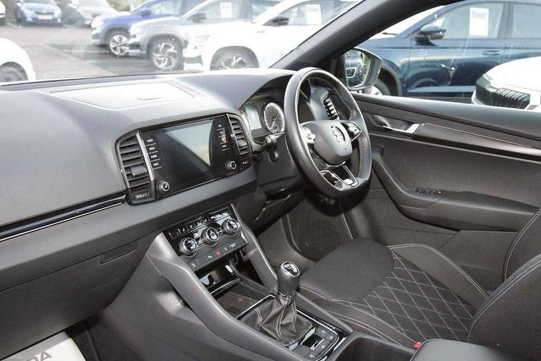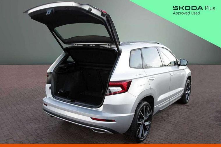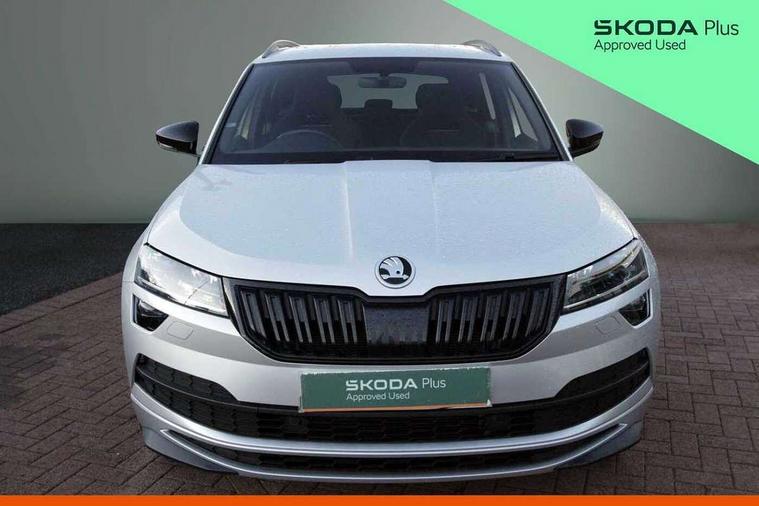 Black air vent surround, LED Interior lighting pack with Skoda welcome logo - Karoq, 19" Vega anthracite alloy wheels, Anti-theft wheel bolts protection, Storage on wheel cover, Alarm with interior monitoring, back up horn and tilt sensor with safe function, Electronic engine immobiliser, Keyless entry and keyless start with safe system, Remote central locking with 2 remote folding keys, DAB radio with Bluetooth, USB connection, Wireless charging without wireless aerial connection, Airbags - Front side, head, knee and curtain, Automatic door unlocking in case of crash, Automatic fuel cut off in case of crash, Driver airbag, Electronic parking brake with auto hold function, Emergency rear braking signal, ESC including ABS, MSR, ASR, EDS, HBA, DSR, RBS, MKB and traction control, Front assist radar scanning of the space in front of the car with automatic braking, Hill hold control, Passenger airbag with switch-off function, Pedestrian monitor, Seatbelt reminder signalisation and pretensioner for all seats, Three point seatbelts rear, Two tone horn, Tyre pressure display, Tyre pressure monitor, Acoustic glass, Aero front windscreen wipers with intermittent function, Automatic headlight control system, Black door mirrors, Black electric window control buttons, Black radiator grille, Black roof rails, Body colour door handles, Body coloured bumpers, Electric front and rear windows with child proof lock, Front door steps with SportLine logo, Full LED headlights + adaptive front light system + LED daytime running lights and front cornering fog lights, Headlight washers, Heated rear windscreen, LED rear lights with high functionality, Light assistant (coming/leaving home/tunnel light), Panoramic sliding sunroof, Privacy glass, Protective door side sills in body colour, Rear diffuser, Safety reflectors on front doors, Skoda lettering on tailgate in black, Sportline badge on front fender, Sportline decorative inserts with badging, Sports front and rear bumpers, Third brake light, 1.5 litre bottle holders in driver and front passenger door panels, 12V socket in boot, 12v socket in front centre armrest with storage compartment and rear air vents, 2 Folding hooks and nets in boot, 2 Front readings lights for driver and passenger, 3 rear height adjustable headrests, 4 foldable roof handles with rear coat hooks, Aluminium pedals, Black roof headlining, Cargo elements in boot, Chrome inner door handles, Door sill scuff plates, Driver and passenger seats height adjust, Front head restraints, Height adjustable front three point seats belts with tensioners, Height/reach adjust steering wheel, Ice scraper, Illuminated and cooled glovebox, Illuminated luggage compartment, Isofix child seat preparation outer rear, Manual lumbar support for front seats, Net programme in boot, Pen holder, Pollen filter, Rear reading lights, Rear seats fixed folding and divided 60:40, Retractable parcel shelf attachable to tailgate, Safety vest holder, Solid rear boot cover, Storage box in upper central dashboard closed, Storage compartment below the passenger seat, Sunvisors with illuminated vanity mirrors, Textile floor mats, Umbrella under passenger seat, Welcome animation with sportline logo, Care connect, Drive mode selector, Driver fatigue sensor, Multifunction colour trip computer, Outside temperature gauge, Service interval indicator, SmartLink wireless for Apple and wired for Android, Start/stop system with regenerative braking, USB C Port x 2 in front centre console,