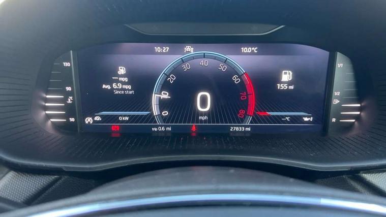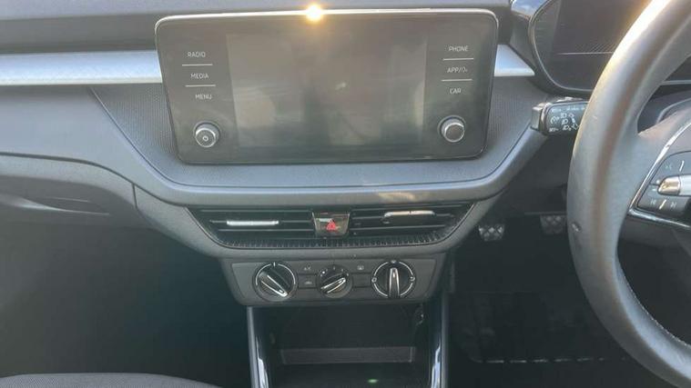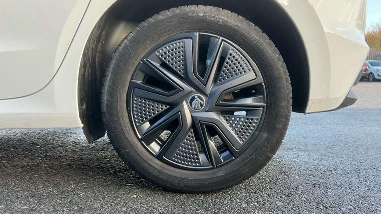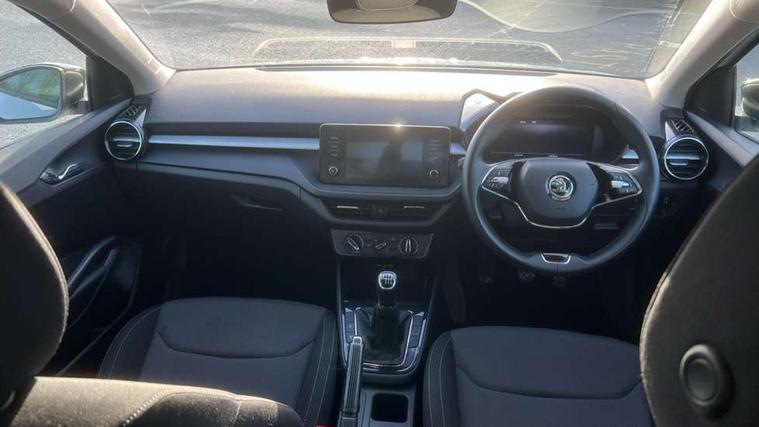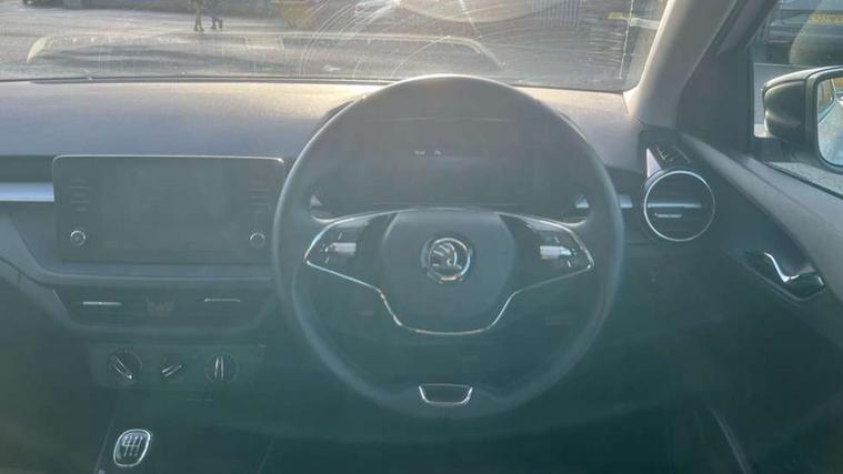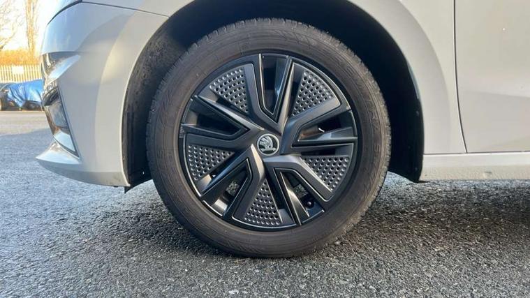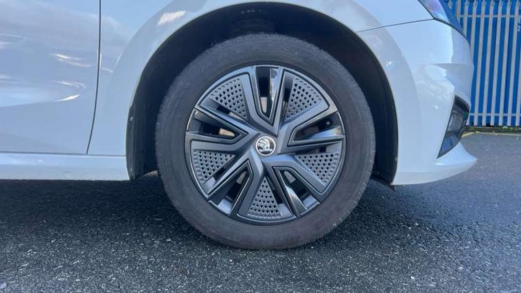 Anodized cross line upper decorative trim, Colour Edition air vents, Grain satin black central console cover, Grain satin black lower decorative trim, Satin black door and side trim panel in front, Anti-theft wheel bolts protection, Super-low rolling resistance tyres, Anti-theft alarm system including immobiliser, interior monitoring, backup horn, and towing protection, 2x USB-C in the front (for data transmission and charging), 6 Speakers (4 in front and 2 in rear), Auxiliary socket for external MP3 player, Bolero radio with 8" colour display, DAB digital radio reception, 3-point height adjustable front seats belts with pretensioner and force limiter, Automatic warning lights in case of crash, Driver and passengers airbag with switch off function, e-Call+, ESC including ABS, MSR, ASR, EDS, HBA and XDS, Front and rear seat belt warning, FRONT ASSIST (AEB City and AEB Inter Urban), Front side airbags, Head airbags, One tone horn, Pedestrian protection, Three rear 3-points safety seat belts with pretensioner and force limiter including stop function for outer rear seat belts, Tyre pressure monitoring system, Basic rear light, Body coloured bumpers, Dimming rear view mirror with black frame, Door mirror integrated indicators, Electrically adjustable and heated door mirrors, Electrically adjustable front windows with function auto up/down, Front window wiper intermittent control, Headlight range control - Automatic, Ice scraper in fuel cap, LED daytime running lights with coming and leaving home feature, Mechanical adjustable rear windows, Privacy glass, Rear LED fog light, Rear side wing doors, Rear window wiper with washing nozzles, Roof mounted spoiler, SKODA tailgate lettering in chrome, Third brake light, 3 rear headrests, Backrest split and folding, Central console with fixed cup holder and storage box, Chrome handbrake release button, Fabric upholstery, Gearshift knob/handle in leather, Grain satin black interior door handles, Hand brake lever handle in leather, Height adjustable front headrests, Height adjustable steering wheel, ISOFIX and TopTether anchorage points to the outer rear seats, ISOFIX and TopTether on the front passenger seat, Luggage compartment lighting, Pollen filter, Rear seat bench unsplit, Single front passenger seat, Storm grey headlining, Sun visors with mirror and airbag label on passenger side, Ticket holder, Umbrella in drivers door, Bluetooth connection, Driver alert system - DAS, Electromechanical power steering, Exterior temperature gauge, Lane assist including road edge detection, Service interval indicator, Virtual cockpit with 10.25" colour display,